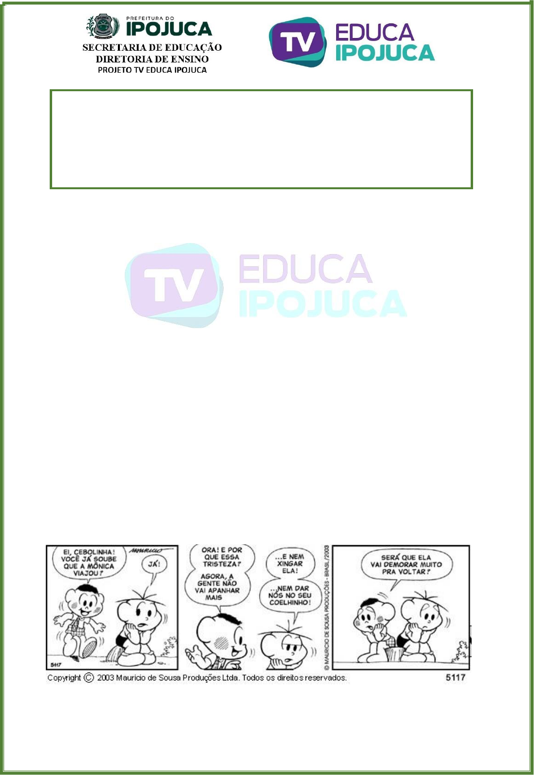 <p>;</p><p>ATIVIDADE COMPLEMENTAR DE CONHECIMENTOS ESPECÍFICO</p><p>PONTUAÇÃO</p><p>Na língua escrita, utilizamos sinais de pontuação para auxiliar a escrita na</p><p>intencionalidade da fala. A forma como a pontuação é empregada em um texto está</p><p>diretamente relacionada ao sentido que se pretende expressar.</p><p>Exemplos:</p><p>I- Meu pai chegou? Não vou esperá-lo!</p><p>II- Meu pai chegou? Não? Vou esperá-lo.</p><p>Ponto de exclamação ( ! ) – indica uma intenção ou estado emocional,</p><p>geralmente de surpresa, espanto, admiração, chateação, pedido, ordem.</p><p>Ponto de interrogação ( ? ) – indica uma intenção, como a de realizar uma</p><p>pergunta direta.</p><p>Ponto ( . ) – é a pausa máxima de uma frase. Significa que houve o término do</p><p>discurso, ou parte dele.</p><p>Leia a tirinha para responder às questões 01 a 04:</p><p>01. A frase: “Ei, Cebolinha!” da fala do Cascão no primeiro quadrinho revela:</p><p>(a) indagação.</p><p>(b) entusiasmo.</p><p>(c) dúvida.</p><p>(d) raiva.</p><p>PROFESSOR (A)</p><p>COMPONENTE CURRICULAR: Língua Portuguesa 6º ANO</p><p>N° DA AULA/ CONTEÚDO: Pontuação, para que te quero?/ Aula 19</p><p>DATA: ___ / ___/_____</p><p>02. Observe que no segundo, na fala do Cascão, está faltando a pontuação no</p><p>final. Que pontuação abaixo se adequa ao contexto do balão?</p><p>(a) Vírgula.</p><p>(b) Ponto de interrogação.</p><p>(c) Reticências.</p><p>(d) Ponto de exclamação.</p><p>03. Retire da tirinha uma frase interrogativa.</p><p>__________________________________________________________________</p><p>04. Na frase do Cebolinha “Já!”, o ponto de exclamação revela:</p><p>(a) alegria.</p><p>(b) confusão.</p><p>(c) tristeza.</p><p>(d) surpresa.</p><p>05. Leia o texto abaixo e responda ao que se pede.</p><p>A velha contrabandista</p><p>Diz que era uma velhinha que sabia andar de lambreta. Todo dia ela passava</p><p>pela fronteira montada na lambreta, com um bruto saco atrás da lambreta. O</p><p>pessoal da Alfândega – tudo malandro – começou a desconfiar da velhinha.</p><p>Um dia, quando ela vinha na lambreta com o saco atrás, o fiscal da Alfândega</p><p>mandou ela parar. A velhinha parou e então o fiscal perguntou assim pra ela:</p><p>– Escuta aqui, vovozinha, o que a senhora leva nesse saco</p><p>A velhinha sorriu com os poucos dentes que lhe restavam e mais os outros, que</p><p>ela adquira no odontólogo, e respondeu:</p><p>– É areia! (...)</p><p>PONTE PRETA, Stanislaw. “Dois amigos e um chato”. 8 ed. São Paulo.</p><p>a. No trecho “Um dia, quando ela vinha na lambreta com o saco atrás […]”, a</p><p>vírgula separa uma expressão que indica:</p><p>( ) lugar</p><p>( ) tempo</p><p>( ) meio</p><p>b. Na passagem “O pessoal da Alfândega – tudo malandro – começou a</p><p>desconfiar da velhinha.”, os travessões separam:</p><p>( ) uma conclusão</p><p>( ) uma comparação</p><p>( ) uma explicação</p><p>c. Levando-se em consideração o contexto, a frase “– Escuta aqui, vovozinha, o</p><p>que a senhora leva nesse saco” deve ser encerrada com:</p><p>( ) ponto de interrogação</p><p>( ) ponto de exclamação</p><p>( ) ponto final</p><p>d. Os dois-pontos foram empregados duas vezes no texto para anunciar:</p><p>( ) as falas do fiscal da Alfândega.</p><p>( ) as falas da velhinha.</p><p>( ) uma fala do fiscal da Alfândega e uma fala da velhinha.</p><p>e. Cite todos os sinais de pontuação presentes no texto:</p><p>__________________________________________________________________</p><p>__________________________________________________________________</p><p>__________________________________________________________________</p><p>__________________________________________________________________</p><p>__________________________________________________________________</p><p>06. Leia o texto abaixo com atenção e, depois, responda ao que se pede.</p><p>A mosca</p><p>A mosca saiu do açucareiro.</p><p>Zzzzzzzzzz zzzzzzzzzz zzzzzzzzzz zzzzzzzzzz zzzzzzzzzz zzzzzzzzz zzzzzzzzz</p><p>zzzzzzzzz zzzzzzzzz zzzzzzzzz zzzzzzzzz.</p><p>Pousou numa xícara. O homem espantou-a com a mão.</p><p>Zzzzzzzzzz zzzzzzzzzz zzzzzzzzzz zzzzzzzzzz zzzzzzzzzz zzzzzzzzz zzzzzzzzz</p><p>zzzzzzzzz zzzzzzzzzz zzzzzzzzz zzzzzzzzz.</p><p>Parou perto de outra mosca. Conversaram!</p><p>– Zzzzzzzzzz zzzzzzzzz zzzzzzzzz!</p><p>– Zzzzzzzzzz zzzzzzzzz zzzzzzzzz?</p><p>– Zzzzzzzzzz zzzzzzzzz zzzzzzzzz zzzzzzzzz…</p><p>– Zzzzzzzzzz zzzzzzzzz!</p><p>– Zzzzzzzzz zzzz!</p><p>– Z.</p><p>E voltaram as duas.</p><p>Zz zz zz zz zz zz zz zz zz zz zz zz zz zz zz zz zz zz zz zz zz zz zz zz zz zz zz zz</p><p>zz zz zz zz zz zz zz zz zz zz zz.</p><p>O homem tornou a afastá-las.</p><p>Zz zz zz zz zz zz zz zz zz zz zz zz zz zz zz zz zz zz zz.</p><p>Elas tornaram a voltar. Agora eram três.</p><p>Zzz zzz zzz zzz zzz zzz zzz zzz zzz zzz zzz zzz zzz zzz.</p><p>O homem se levantou e foi embora.</p><p>Moral: é mais fácil uma mosca espantar um homem do que um homem espantar</p><p>uma mosca.</p><p>(ELIACHAR, Leon. O homem ao quadrado. São Paulo: Círculo do Livro, 1960.)</p><p>a. Leia o texto em silêncio.</p><p>b. Leia-o em voz alta.</p><p>c. Você leu todas as sequências de z do mesmo modo, ou seja, deu alguma pausa</p><p>entre elas? Por quê?</p><p>d. Você leu todas as frases no mesmo tom ou não? Por quê?</p><p>e. Qual é a função do uso de z no texto?</p><p>f. Comente sobre a moral da história.</p><p>g. Imagine que palavras estariam sendo ditas no lugar dos zz e reescreva a</p><p>história.</p>
