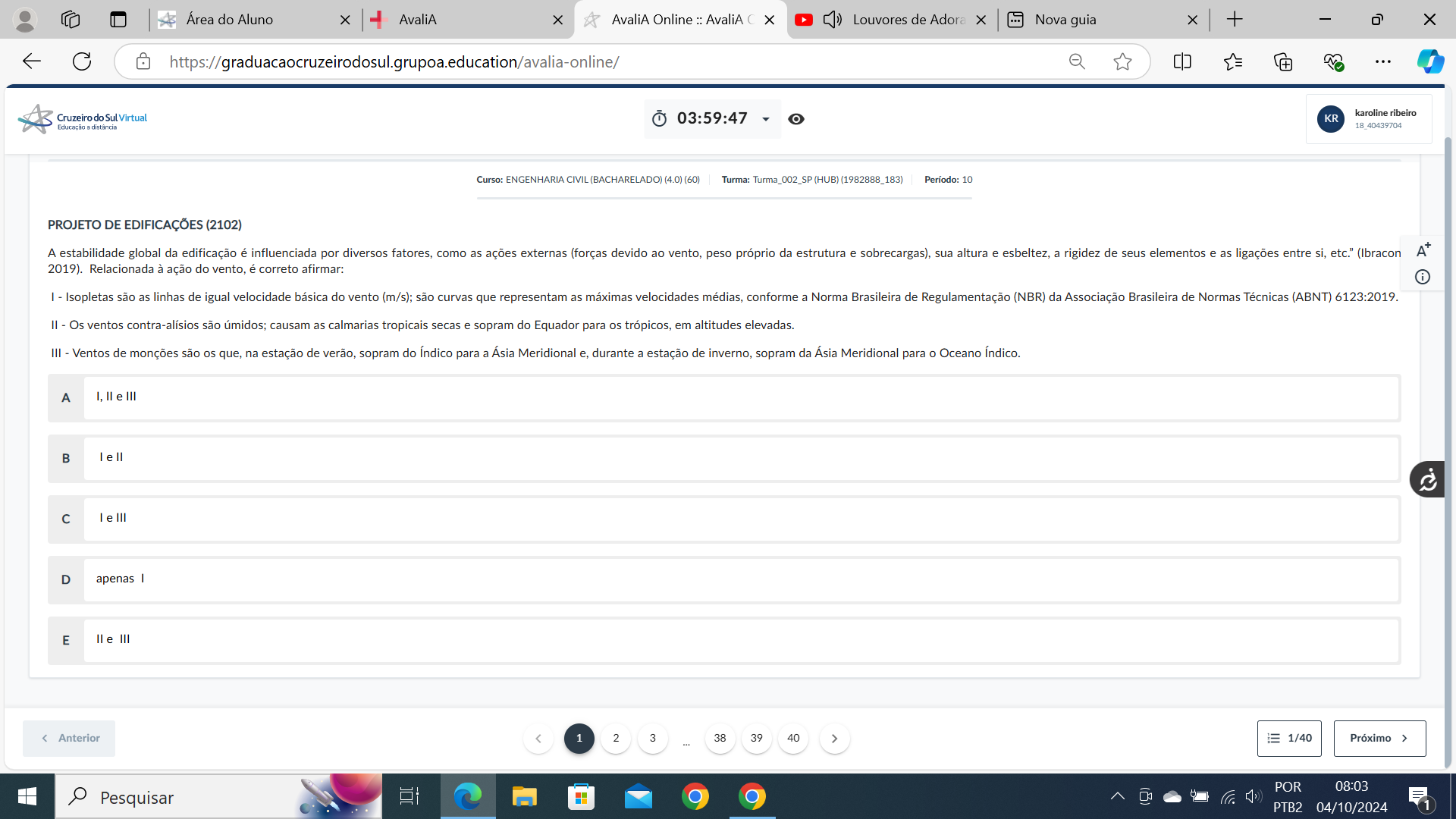 <p>Área do Aluno + AvaliA AvaliA Online AvaliA C Louvores de Adora Nova guia + Cruzeiro do Sul Virtual 03:59:47 karoline ribeiro KR Educação distância 18 40439704 Curso: ENGENHARIA CIVIL (4.0) (60) Turma: Turma SP (HUB) (1982888 183) Período: 10 PROJETO DE EDIFICAÇÕES (2102) A estabilidade global da edificação é influenciada por diversos fatores, como as ações externas (forças devido ao vento, peso próprio da estrutura e sobrecargas), sua altura e esbeltez, a rigidez de seus elementos e as ligações entre si, etc." (Ibracon 2019). Relacionada à ação do vento, é correto I - Isopletas são as linhas de igual velocidade básica do vento (m/s); são curvas que representam as máximas velocidades médias, conforme a Norma Brasileira de Regulamentação (NBR) da Associação Brasileira de Normas Técnicas (ABNT) II - Os ventos contra-alísios são úmidos; causam as calmarias tropicais secas e sopram do Equador para os trópicos, em altitudes elevadas. III Ventos de monções são os que, na estação de verão, sopram do para a Ásia Meridional e, durante a estação de inverno, sopram da Ásia Meridional para Oceano A I, III B II C III D apenas E III 1/40 Próximo > POR 08:03 Pesquisar = PTB2 04/10/2024 1</p>
