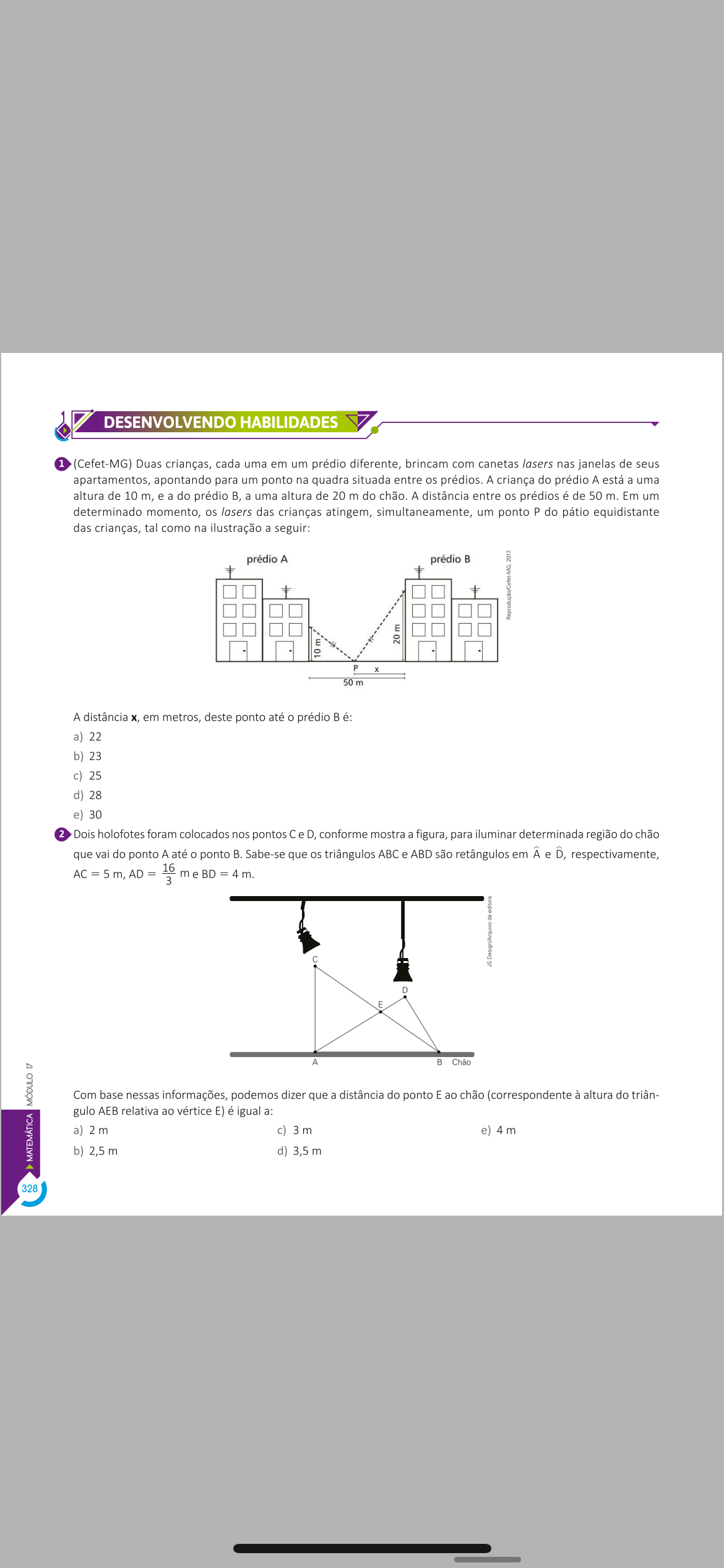 <p>DESENVOLVENDO HABILIDADES 1 (Cefet-MG) Duas crianças, cada uma em um prédio diferente, brincam com canetas lasers nas janelas de seus apartamentos, apontando para um ponto na quadra situada entre os prédios. A criança do prédio A está a uma altura de 10 m, e a do prédio B, a uma altura de 20 m do chão. A distância entre os prédios é de 50 m. Em um determinado momento, os lasers das crianças atingem, simultaneamente, um ponto P do pátio equidistante das crianças, tal como na ilustração a seguir: prédio A prédio B 2017 E 10 P 50 m A distância em metros, deste ponto até o prédio B é: a) 22 b) 23 c) 25 d) 28 e) 30 2 Dois holofotes foram colocados nos pontos e D, conforme mostra a figura, para iluminar determinada região do chão que vai do ponto A até o ponto B. Sabe-se que os triângulos ABC e ABD são retângulos em A e respectivamente, AC = 5 m, AD = 16 m e BD = 4 3 de D F A B Chão Com base nessas informações, podemos dizer que a distância do ponto E ao chão (correspondente à altura do triân- gulo AEB relativa ao vértice E) é igual a: a) 2 m c) m e) b) 2,5 m d) 3,5 m A 328</p>