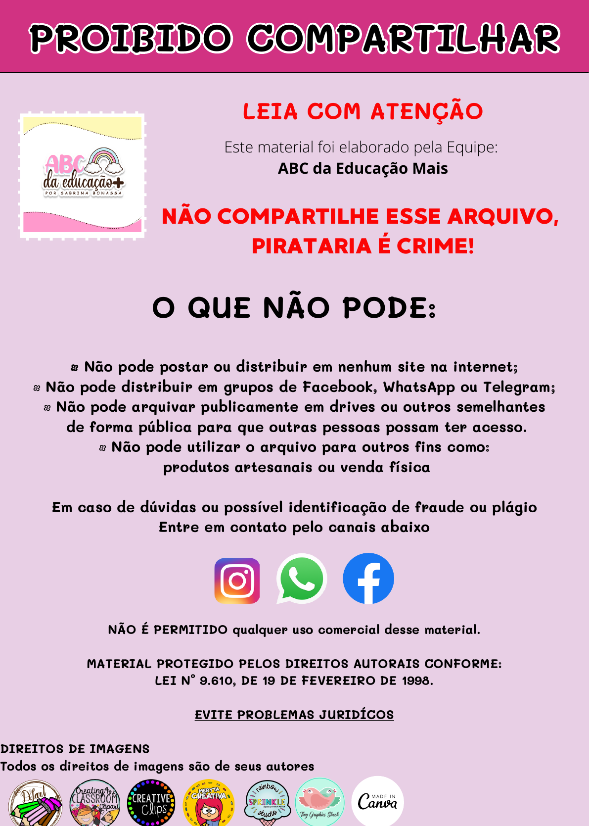 <p>O QUE NÃO PODE:</p><p>• Não pode postar ou distribuir em nenhum site na internet;</p><p>• Não pode distribuir em grupos de Facebook, WhatsApp ou Telegram;</p><p>• Não pode arquivar publicamente em drives ou outros semelhantes</p><p>de forma pública para que outras pessoas possam ter acesso.</p><p>• Não pode utilizar o arquivo para outros fins como:</p><p>produtos artesanais ou venda física</p><p>Em caso de dúvidas ou possível identificação de fraude ou plágio</p><p>Entre em contato pelo canais abaixo</p><p>NÃO É PERMITIDO qualquer uso comercial desse material.</p><p>MATERIAL PROTEGIDO PELOS DIREITOS AUTORAIS CONFORME:</p><p>LEI N° 9.610, DE 19 DE FEVEREIRO DE 1998.</p><p>EVITE PROBLEMAS JURIDÍCOS</p><p>DIREITOS DE IMAGENS</p><p>Todos os direitos de imagens são de seus autores</p><p>PROIBIDO COMPARTILHARPROIBIDO COMPARTILHAR</p><p>Este material foi elaborado pela Equipe:</p><p>ABC da Educação Mais</p><p>NÃO COMPARTILHE ESSE ARQUIVO,</p><p>PIRATARIA É CRIME!</p><p>LEIA COM ATENÇÃO</p><p>Licenciado para: Patricia Sasaki Barrozo - 19993440555 - patriciasasakibarrozo@gmail.com</p><p>https://www.instagram.com/abcdaeducacaomais/</p><p>http://wa.me/5548999294908</p><p>https://www.facebook.com/abcdaeducacaomais</p><p>FLIPBOOK DAS SÍLABAS COMPLEXAS</p><p>Olá, professores, educadores, pais e clientes, se você está lendo essa</p><p>mensagem é porque adquiriu algum de nossos produtos. Ficamos muito</p><p>felizes com seu investimento, sempre visando uma educação de qualidade</p><p>para o ensino das crianças. PARABÉNS!</p><p>MATERIAIS</p><p>• 24 flipbooks das sílabas complexas;</p><p>•Contém as sílabas: BR, CR, DR, FR, GR, PR, TR, VR, BL, CL, GL, PL, TL,</p><p>AR, NH, LH, CH, AL, AZ, AS, GU, QU, AM e AN;</p><p>Licenciado para: Patricia Sasaki Barrozo - 19993440555 - patriciasasakibarrozo@gmail.com</p><p>"PÁGINAS BR" PRODUZIDO POR ABCDAEDUCACAOMAIS</p><p>COLE AQUI</p><p>leitura</p><p>dentro do texto</p><p>COLE AQUI</p><p>A BRUXINHA BRUNA</p><p>NO INTERIOR DO BRASIL EM UM CASTELO</p><p>ENCANTADO, MORA A BRUXINHA BRUNA, A BRUXINHA</p><p>MAIS BRINCALHONA QUE EXISTE.</p><p>ELA MORA COM SEU AMIGO ESPANTALHO E A GATA</p><p>ARABELA.</p><p>NO DIA DAS BRUXAS, BRUNA DISTRIBUI MUITOS</p><p>DOCES PARA AS CRIANÇAS MONTADA EM SUA</p><p>VASSOURA MÁGICA.</p><p>RESPONDA:</p><p>1 - QUEM SÃO OS AMIGOS DE BRUNA?</p><p>R:_____________________________________________________</p><p>2 - ONDE ELA MORA?</p><p>R:_____________________________________________________</p><p>3 - COPIE DO TEXTO DUAS PALAVRAS DISSÍLABAS.</p><p>R:_____________________________________________________</p><p>4 - O QUE BRUNA FAZ COM SUA VASSOURA MÁGICA?</p><p>R:_____________________________________________________</p><p>BRA BRE</p><p>BRI</p><p>BRO</p><p>BRU</p><p>Licenciado para: Patricia Sasaki Barrozo - 19993440555 - patriciasasakibarrozo@gmail.com</p><p>"PÁGINAS BR" PRODUZIDO POR ABCDAEDUCACAOMAIS</p><p>PRODUÇÃO DE ESCRITA</p><p>COLE AQUI</p><p>ATIVIDADES</p><p>COLE AQUI</p><p>@abcdaeducaçãomais</p><p>ESCREVA AS PALAVRAS E SEPARE EM SÍLABAS. DESCREVA COM FRASES OU PEQUENOS TEXTOS AO</p><p>LADO DE CADA IMAGEM RELATANDO O QUE ESTÁ</p><p>ACONTECENDO:</p><p>_______________________________</p><p>_______________________________</p><p>_______________________________</p><p>_______________________________</p><p>_______________________________</p><p>_______________________________</p><p>_______________________________</p><p>_______________________________</p><p>_______________________________</p><p>_______________________________</p><p>_______________________________</p><p>_______________________________</p><p>_______________________________</p><p>Licenciado para: Patricia Sasaki Barrozo - 19993440555 - patriciasasakibarrozo@gmail.com</p><p>"PÁGINAS FR" PRODUZIDO POR ABCDAEDUCACAOMAIS</p><p>COLE AQUI</p><p>leitura</p><p>dentro do texto</p><p>COLE AQUI</p><p>AS FRUTAS</p><p>A MÃE DE FRANCISCO FOI AO MERCADO</p><p>COMPRAR FRUTAS FRESCAS.</p><p>AS FRUTAS SÃO SABOROSAS E SAUDÁVEIS.</p><p>A MÃE DE FRANCISCO FEZ SALADA DE FRUTAS</p><p>PARA SEUS AMIGOS.</p><p>ELES ADORARAM!</p><p>RESPONDA:</p><p>1 - QUEM COMPROU FRUTAS NO MERCADO?</p><p>R:__________________________________________________________</p><p>2 - O QUE A MÃE DE FRANCISCO FEZ PARA SEUS AMIGOS?</p><p>R:__________________________________________________________</p><p>3 - ESCREVA O NOME DE 3 FRUTAS QUE VOCÊ GOSTA.</p><p>R:__________________________________________________________</p><p>4 - POR QUE DEVEMOS COMER FRUTAS?</p><p>R:__________________________________________________________</p><p>____________________________________________________________</p><p>FRA FRE</p><p>FRI FRO FRU</p><p>Licenciado para: Patricia Sasaki Barrozo - 19993440555 - patriciasasakibarrozo@gmail.com</p><p>"PÁGINAS FR" PRODUZIDO POR ABCDAEDUCACAOMAIS</p><p>PRODUÇÃO DE ESCRITA</p><p>COLE AQUI</p><p>ATIVIDADES</p><p>RE GERANTE</p><p>COLE AQUI</p><p>@abcdaeducaçãomais</p><p>COMPLETE AS PALAVRAS COM AS SÍLABAS QUE</p><p>ESTÃO FALTANDO:</p><p>DITADO</p><p>OUÇA COM A ATENÇÃO AS PALAVRAS QUE O</p><p>PROFESSOR(A) DITAR E ESCREVA ABAIXO:</p><p>1-_________________________________</p><p>2-_________________________________</p><p>3-_________________________________</p><p>4-_________________________________</p><p>5-_________________________________</p><p>6-_________________________________</p><p>7-_________________________________</p><p>8-_________________________________</p><p>9-_________________________________</p><p>10-_________________________________</p><p>CO</p><p>DA</p><p>ESPINA</p><p>GIDEIRA</p><p>BOESA</p><p>Á CA</p><p>Sugestão para o ditado: fruteira, frete, fraco, freio, frutas, fronha, frasco, frio, fritura, frase, frango, França, refresco...</p><p>O</p><p>Licenciado para: Patricia Sasaki Barrozo - 19993440555 - patriciasasakibarrozo@gmail.com</p><p>"PÁGINAS CR" PRODUZIDO POR ABCDAEDUCACAOMAIS</p><p>COLE AQUI</p><p>leitura</p><p>dentro do texto</p><p>COLE AQUI