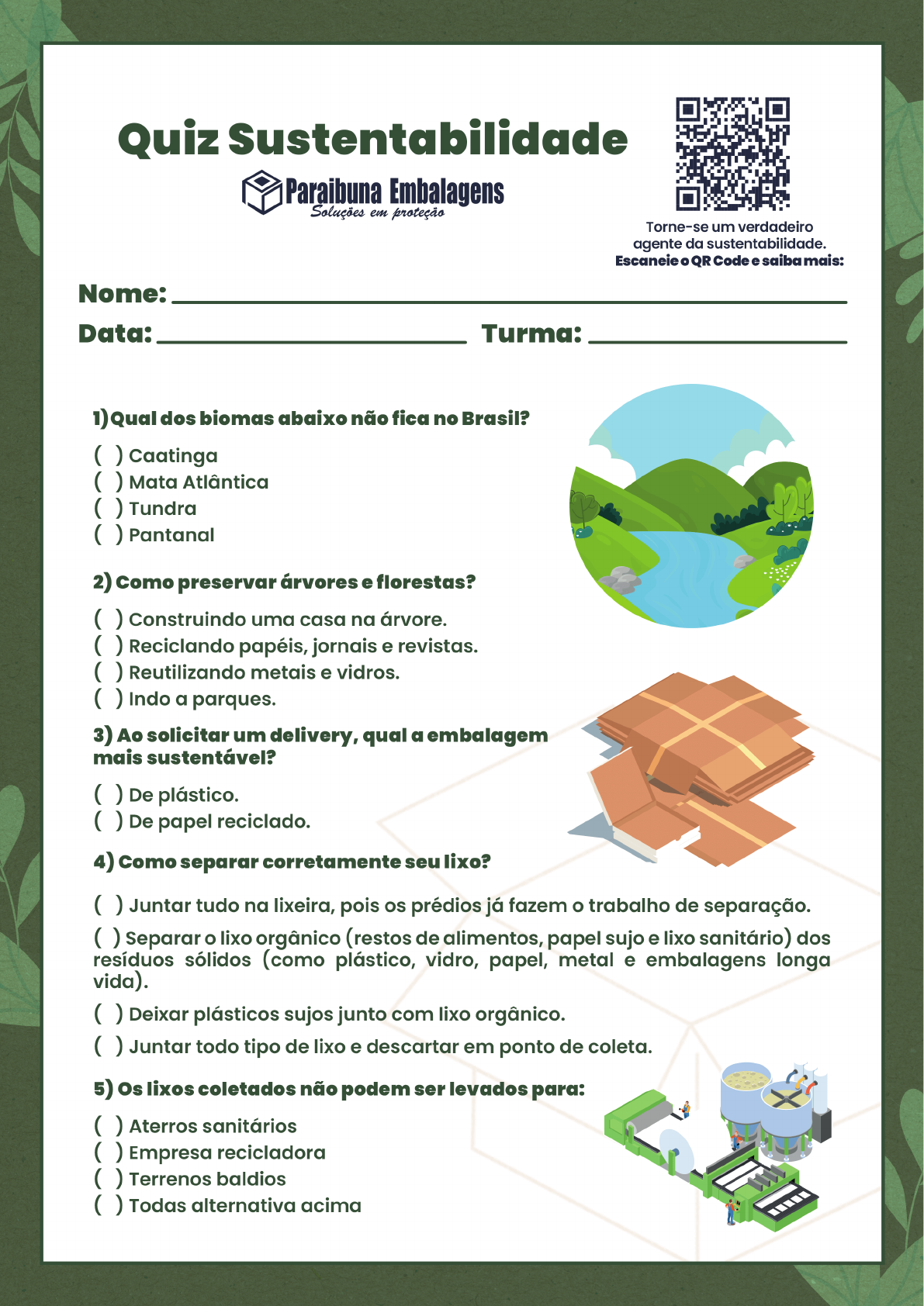 <p>Quiz Sustentabilidade Paraibuna Embalagens Soluções em proteção Torne-se um verdadeiro agente da Escaneie o QR Code e saiba mais: Nome: Data: Turma: 1) Qual dos biomas abaixo não fica no Brasil? Caatinga Mata Atlântica Tundra ( ) Pantanal 2) Como preservar árvores e florestas? Construindo uma casa na árvore. ( ) Reciclando papéis, jornais e revistas. ( ) Reutilizando metais e vidros. ( ) Indo a parques. 3) Ao solicitar um delivery, qual a embalagem mais sustentável? De plástico. De papel reciclado. 4) Como separar corretamente seu lixo? Juntar tudo na lixeira, pois os prédios já fazem o trabalho de separação. Separar o lixo orgânico (restos de alimentos, papel sujo e lixo sanitário) dos resíduos sólidos (como plástico, vidro, papel, metal e embalagens longa vida). Deixar plásticos sujos junto com lixo orgânico. Juntar todo tipo de lixo e descartar em ponto de coleta. 5) Os lixos coletados não podem ser levados para: ( ) Aterros sanitários Empresa recicladora Terrenos baldios ( ) Todas alternativa acima</p><p>6) Como consumir de forma consciente? Trocando todos os nossos objetos sempre que um novo do mesmo tipo for lançado. Usar a mangueira para lavar o quintal e o carro. ( ) Utilizando os recursos naturais para satisfazer nossas necessidades e das gerações futuras. Adquirindo qualquer tipo de produto, se for barato. 7) Qual tipo de lâmpada causa menos impacto ambiental? Fluorescente LED Halógena 8) Qual dos elementos abaixo não é utilizado como fonte de energia? Água corrente Petróleo Barra de ferro 9) Os lugares que não possuem coleta de lixo podem desenvolver problemas ambientais e de sérios, exceto: Aumento de insetos que são transmissores de doenças, como: a dengue, leptospirose e peste bubônica. Odor agradável. Produção de chorume que polui o lençol freático. Contaminação do solo e das pessoas em contato com o mesmo. 10) Estima-se que, em média, dois quilos de lixo sejam produzidos a cada dia por pessoa, incluindo o lixo doméstico. Com relação à questão do lixo e do seu tratamento, é correto afirmar que: ( ) A maior vantagem da compostagem é a transformação de resíduos orgânicos em compostos úteis como fertilizantes. ( ) Para que um aterro sanitário possa ser eficiente por muitos anos, periodicamente deve ser feita a incineração dos resíduos orgânicos e inorgânicos. lixão a céu aberto é eficiente meio de tratamento do lixo. Uma alternativa eficaz para tratar o problema do lixo urbano envolve a redução da utilização de produtos descartáveis.</p><p>11) A produção de lixo está aumentando a cada ano e as consequências desse processo são desastrosas. Neste sentido a responsabilidade é: Somente do governo. Do prefeito da minha cidade. ( ) Da empresa recicladora. ( ) É responsabilidade de todos. 12) Qual dos gases abaixo não é conhecido como um dos gases do efeito estufa - GEE? - óxido nitroso. oxigênio. - dióxido de carbono ou gás carbônico. - metano. 13) Por quantos por cento de água a Terra é coberta? 80% 71% 14) Ao escovar os dentes, você deve: Manter a torneira aberta. ( ) Abrir a torneira somente quando for enxaguar a boca. 15) Qual item abaixo não pode ser reciclado? ( ) Garrafa pet. Prego. Recicláveis Papel Papel Não 16) o que é reciclagem? "Jogar fora" o lixo produzido. Coletar todo tipo de material existente em lixos recicláveis. Nome dado para todo o processo do lixo após seu descarte. ( ) Processo de transformação de materiais usados em novos produtos para consumo.</p><p>17) Indique uma vantagem da energia solar. ( ) Não polui. Não é renovável. É eficaz em qualquer clima. É disponível a todo momento. 18) que causa, com maior frequência, a contaminação do lençol freático? Poluição do ar. Poluição do solo. Poluição sonora. 19) da sustentabilidade é baseado em três princípios, quais são eles? Social, sentimental e ambiental. Social, ambiental e político. Ambiental, econômico e social. Ambiental, econômico e político. 20) lixo pode ser encontrado no estado sólido, líquido e gasoso. Marque a alternativa incorreta: ( ) Lixo orgânico: restos de alimentos, folhas, sementes, entre outros. Lixo inorgânico: plásticos, metais, vidros, entre outros. Os lixos inorgânicos podem ser reciclados, sendo reaproveitados de outras maneiras. Lixo tóxico: pilhas, baterias, tintas, entre outros. Esse lixo não pode ser reutilizável. Não tóxico: nuclear e hospitalar, podendo ser 21) que é coleta seletiva? Processo de separação e recolhimento dos resíduos para o reaproveitamento por meio da reciclagem. Destinação de resíduos para lixões e aterros. Processo de envio de todo lixo produzido para cooperativas ou entrega para catadores de rua. A escolha aleatória do melhor lixo produzido. Paraibuna Embalagens Soluções em proteção</p><p>Gabarito 1) Tundra. 2) Construindo uma casa na árvore. 3) De papel reciclado. 4) Separar o lixo orgânico (restos de alimentos, papel sujo e lixo sanitário) dos resíduos sólidos (como plástico, vidro, papel, metal e embalagens longa vida). 5) Terrenos baldios 6) Utilizando os recursos naturais para satisfazer nossas necessidades e das gerações futuras. 7) LED 8) Barra de ferro 9) Odor agradável. 10) Uma alternativa eficaz para tratar o problema do lixo urbano envolve a redução da utilização de produtos descartáveis. 11) É responsabilidade de todos. - oxigênio. 13) 71% 14) Abrir a torneira somente quando for enxaguar a boca. 15) Papel celofane. 16) Processo de transformação de materiais usados em novos produtos para consumo. 17) É eficaz em qualquer clima. 18) Poluição do solo. 19) Ambiental, econômico e social. 20) Não tóxico: nuclear e hospitalar, podendo ser reciclável. 21) Processo de separação e recolhimento dos resíduos para o reaproveitamento por meio da reciclagem. Paraibuna Embalagens Soluções em proteção</p>