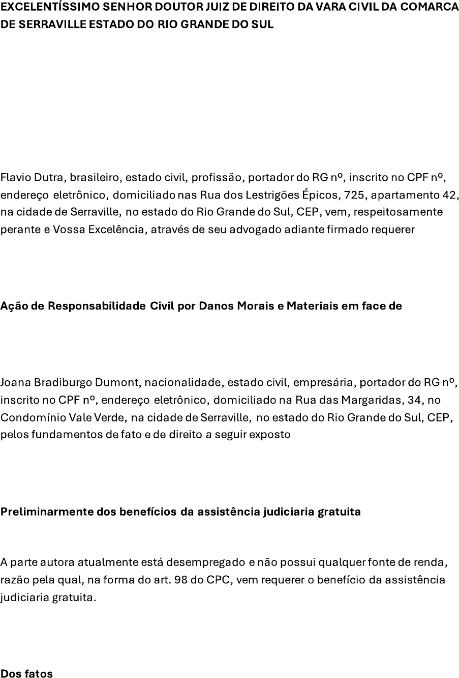 <p>EXCELENTÍSSIMO SENHOR DOUTOR JUIZ DE DIREITO DA VARA CIVIL DA COMARCA DE SERRAVILLE ESTADO DO RIO GRANDE DO SUL Flavio Dutra, brasileiro, estado civil, profissão, portador do RG inscrito no CPF n°, endereço eletrônico, domiciliado nas Rua dos Lestrigões Épicos, 725, apartamento 42, na cidade de Serraville, no estado do Rio Grande do Sul, CEP, vem, respeitosamente perante e Vossa Excelência, através de seu advogado adiante firmado requerer Ação de Responsabilidade Civil por Danos Morais e Materiais em face de Joana Bradiburgo Dumont, nacionalidade, estado civil, empresária, portador do RG inscrito no CPF n°, endereço eletrônico, domiciliado na Rua das Margaridas, 34, no Condomínio Vale Verde, na cidade de Serraville, no estado do Rio Grande do Sul, CEP, pelos fundamentos de fato e de direito a seguir exposto Preliminarmente dos benefícios da assistência judiciaria gratuita A parte autora atualmente está desempregado e não possui qualquer fonte de renda, razão pela qual, na forma do art. 98 do CPC, vem requerer o benefício da assistência judiciaria gratuita. Dos fatos</p><p>No dia 15 de marco de 2023, na cidade de Serraville/RS o senhor Flavio Dutra sofreu um acidente de trânsito, caudado pela senhora Joana Bradiburgo Dumont que dirigia em alta velocidade a acabou colidindo violentamente com o autor causando lesões físicas e Moraes graves impossibilitando o senhor Flavio de trabalhar. O autor procurou a senhora Joana em sua residência para poder resolver o problema, mas sem êxito. Do direito O acidente de transido ocorreu unicamente de forma ilícita, pela total imprudência da requerida pois ela estava em alta velocidade assim ferindo o Código de Trânsito Brasileiro. A reparação civil decorrente dos danos causados a alguém encontra guarida no Código Civil no Art.186 e o mesmo diploma legal tratou de garantir a obrigação de indenizar por ato ilícito, conforme prevê o Art. 927. Do pedido Em face do exposto requer A) O deferimento benefício da assistência judiciaria gratuita nos termos do art. 98 e seguintes do CPC/2015; B) Seja citada a executada no endereço inicialmente descrito a, para que, querendo, apresentar resposta, sob pena de decretação dos efeitos da revelia; C) A condenação da Requerida ao pagamento das perdas e danos materiais, no valor de R$ 72.000,00 (setenta e dois mil reais); D) A condenação da Requerida ao pagamento danos morais, no valor de R$ 5.000,00 (cinco mil reais); E) Que sejam julgados procedentes todos os pedidos da inicial; Da se A causa o valor de r$ 77.000,00 (setenta e sete mil reais) Nestes termos Pede deferimento data /local</p><p>Advogado OAB n°</p>