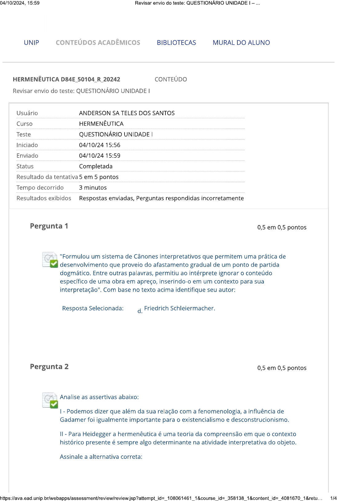 <p>04/10/2024, 15:59 Revisar envio do teste: QUESTIONÁRIO UNIDADE - - UNIP CONTEÚDOS ACADÊMICOS BIBLIOTECAS MURAL DO ALUNO HERMENÊUTICA D84E_50104_R_20242 CONTEÚDO Revisar envio do teste: QUESTIONÁRIO UNIDADE Usuário ANDERSON SA TELES DOS SANTOS Curso HERMENÊUTICA Teste QUESTIONÁRIO UNIDADE Iniciado 04/10/24 15:56 Enviado 04/10/24 15:59 Status Completada Resultado da tentativa 5 em 5 pontos Tempo decorrido 3 minutos Resultados exibidos Respostas enviadas, Perguntas respondidas incorretamente Pergunta 1 0,5 em 0,5 pontos "Formulou um sistema de Cânones interpretativos que permitem uma prática de desenvolvimento que proveio do afastamento gradual de um ponto de partida dogmático. Entre outras palavras, permitiu ao intérprete ignorar o conteúdo específico de uma obra em apreço, inserindo-o em um contexto para sua interpretação". Com base no texto acima identifique seu autor: Resposta Selecionada: d. Friedrich Schleiermacher. Pergunta 2 0,5 em 0,5 pontos Analise as assertivas abaixo: - Podemos dizer que além da sua relação com a fenomenologia, a influência de Gadamer foi igualmente importante para o existencialismo e desconstrucionismo. - Para Heidegger a hermenêutica é uma teoria da compreensão em que o contexto histórico presente é sempre algo determinante na atividade interpretativa do objeto. Assinale a alternativa correta: 1/4</p><p>04/10/2024, 15:59 Revisar envio do teste: QUESTIONÁRIO UNIDADE - Resposta Selecionada: e II são falsas a. Pergunta 3 0,5 em 0,5 pontos Em sua obra Verdade e Método, assegura que a hermenêutica não é um método para se chegar à verdade e que o problema hermenêutico não é, por sua vez, um problema de método. Nesse sentido, a hermenêutica não seria uma metodologia das ciências humanas, mas sim uma tentativa de compreender as ciências humanas. A obra acima referida pertence a: Resposta Selecionada: d. Gadamer. Pergunta 4 0,5 em 0,5 pontos Na interpretação pública administrativa a interpretação é realizada pelos membros do Poder Executivo. PORQUE A interpretação pública administrativa é aquela decorrente do direito consuetudinário, ou seja, da prática reiterada dos costumes. Assinale a alternativa correta: Resposta Selecionada: C. A primeira assertiva é verdadeira e a segunda é falsa. Pergunta 5 0,5 em 0,5 pontos Na interpretação sistemática procura-se examinar a norma em relação às demais normas do ordenamento jurídico PORQUE Neste tipo de interpretação a norma não é mais examinada no seu aspecto intrínseco. Assinale a alternativa correta: 2/4</p><p>04/10/2024, 15:59 Revisar envio do teste: QUESTIONÁRIO UNIDADE - Resposta d. Selecionada: As duas assertivas são verdadeiras e a segunda justifica a primeira. Pergunta 6 0,5 em 0,5 pontos Podemos dizer que a interpretação decorrente do direito consuetudinário, ou seja, da prática reiterada dos costumes configura a: Resposta Selecionada: a. Interpretação pública casuística. Pergunta 7 0,5 em 0,5 pontos Podemos dizer que a interpretação em que a própria lei revela significado de outra norma jurídica configura: Resposta Selecionada: b. Interpretação pública autêntica. Pergunta 8 0,5 em 0,5 pontos Podemos dizer que na obra "da interpretação" (tradução) faz-se uma relação entre os conceitos e a realidade, uma vez que o processo do conhecimento se faz por meio de abstrações mentais daquilo que é adquirido por meio da experiência sensível. Estamos falando da obra: Resposta Selecionada: Peri Hermeneias, de Aristóteles C. Pergunta 9 0,5 em 0,5 pontos</p><p>04/10/2024, 15:59 Revisar envio do teste: QUESTIONÁRIO UNIDADE - ... Por que dizemos que a interpretação histórica é uma continuação dos processos de interpretação gramatical e lógica com possibilidade de dar um conhecimento mais contundente da ciência jurídica? Resposta C. Selecionada: Porque a interpretação que faz uso da técnica histórica tem por fim esclarecer e interpretar a norma mediante uma verdadeira reconstrução do seu conteúdo significativo de origem no momento em que ela foi criada. Pergunta 10 0,5 em 0,5 pontos Qual o conceito de Hermenêutica? Resposta C. Selecionada: Podemos dizer que a hermenêutica jurídica relaciona-se com a ciência da interpretação da linguagem jurídica, a qual tem por objetivos sistematizar princípios e regras. Sexta-feira, 4 de Outubro de 2024 15h59min42s GMT-03:00 OK 4/4</p>