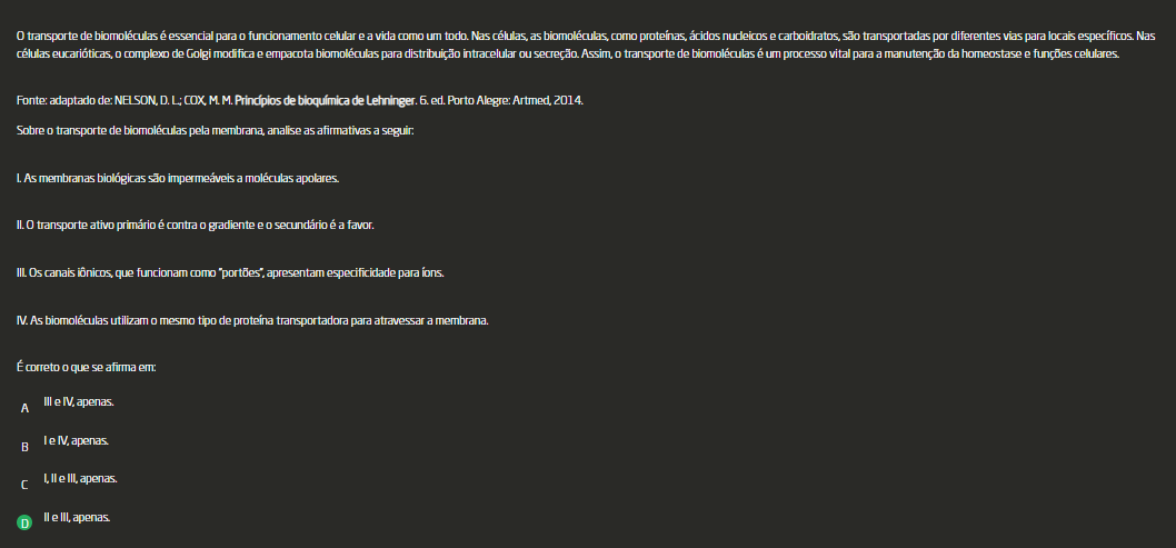 <p>transporte de biomoléculas é essencial para funcionamento celular ea vida como um Nas as biomoléculas como e carboidratos. são transportadas por diferentes vias para locais Nas células complexo de Golgi modifica e biomoléculas para distribuição intracelular ou secreção. Assim transporte de biomoléculas é um processo vital para a manutenção da homeostase funções Fonte: adaptado de NELSON D. COX M Princípios de bioquímica de 6 ed. Porto Alegre: Artmed 2014 Sobre transporte de biomoléculas pela membrana. analise as afirmativas a I As membranas biológicas são impermeáveis a moléculas apolares II. transporte ativo primário é contra gradiente PO secundário 6 a III. Os canais que funcionam como "portões", apresentam especificidade para IV. As biomoléculas utilizam mesmo tipo de proteína transportadora para atravessar a membrana É correto que se afirma em: A III IV, apenas le IV. apenas III. apenas D II III. apenas</p>