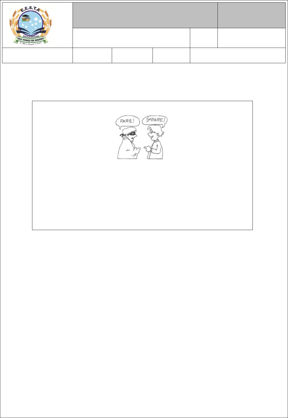 <p>ESCOLA ESTADUAL ‘’ SÃO TOMAZ DE AQUINO’’</p><p>ÉS O BERÇO SAGRADO DO ENSINO</p><p>3º Bimestre</p><p>NOME:</p><p>TURMA:</p><p>NOTA:</p><p>DATA: ___/___/2024</p><p>Avaliação Bimestral</p><p>______pontos</p><p>CONTEÚDO</p><p>PROF.:</p><p>Leia o pequeno texto abaixo e responda as perguntas;</p><p>Isso é um assalto?</p><p>Chega um ladrão aponta uma arma por</p><p>debaixo da roupa e grita para o louco:</p><p>-- Pare!</p><p>E o louco responde:</p><p>-- Imapare!</p><p>Ai o ladrão diz:</p><p>--Mas eu estou te roubando.</p><p>--Ah!... Então não brinco mais!</p><p>01- O louco compreendeu “Pare” com o sentido de :</p><p>( ) Brincar de imapar ou par.</p><p>( ) Deixar de andar.</p><p>( ) Ficar como uma estátua .</p><p>( ) Interromper uma ação.</p><p>02- O assaltante queria que o louco:</p><p>( ) Brincasse com ele.</p><p>( ) Deixasse de andar.</p><p>( ) Ficasse imóvel</p><p>( ) Interrompesse uma ação</p><p>03- Qual é o gênero textual do texto?</p><p>(A) Fábula</p><p>(B) Poesia</p><p>(C ) Piada</p><p>(D) Receita</p><p>04- Leia a tirinha abaixo e responda as perguntas em sequência:</p><p>Este texto tem a finalidade de;</p><p>A- Ensinar algo</p><p>B- Fazer uma critíca</p><p>C – Divertir o leitor</p><p>O que a Mônica deu de presente para sua mãe?</p><p>A -Uma blusa</p><p>B-Uma saia</p><p>C -Um vestido</p><p>D- Uma saia</p><p>05 - Retire do texto um substantivo e um adjetivo:</p><p>_______________________________________________________________________________________________________________________________________________________________________________________________________________</p><p>06- Observe as palavras abaixo, separe em sílabas e classifique de acordo com a sílaba tônica ( proparoxítona, paroxítona e oxítona):</p><p>07- Passe as palavras abaixo para o plural:</p><p>08- Passe as frases abaixo para o singular:</p><p>09- Classifique os encontros vocálicos de acordo com a sequência:</p><p>image6.jpeg</p><p>image1.png</p><p>image2.png</p><p>image3.png</p><p>image4.jpeg</p><p>image5.jpeg</p>