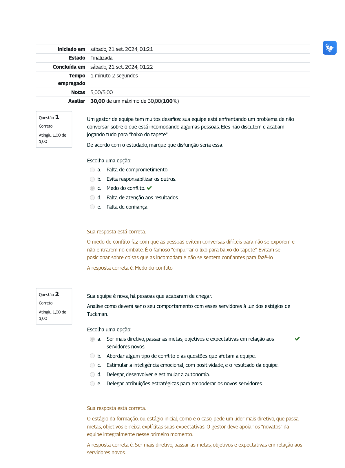 <p>Iniciado em sábado, 21 set. 2024, 01:21 Estado Finalizada Concluída em sábado, 21 set. 2024, 01:22 Tempo 1 minuto 2 segundos empregado Notas 5,00/5,00 Avaliar 30,00 de um máximo de 30,00(100%) Questão 1 Um gestor de equipe tem muitos desafios: sua equipe está enfrentando um problema de não Correto conversar sobre o que está incomodando algumas pessoas. Eles não discutem e acabam Atingiu 1,00 de jogando tudo para "baixo do tapete". 1,00 De acordo com o estudado, marque que disfunção seria essa. Escolha uma opção: a. Falta de comprometimento. b. Evita responsabilizar os outros. C. Medo do conflito. d. Falta de atenção aos resultados. e. Falta de confiança. Sua resposta está correta. medo de conflito faz com que as pessoas evitem conversas difíceis para não se exporem e não entrarem no embate. É o famoso "empurrar o lixo para baixo do tapete". Evitam se posicionar sobre coisas que as incomodam e não se sentem confiantes para fazê-lo. A resposta correta é: Medo do conflito. Questão 2 Sua equipe é nova, há pessoas que acabaram de Correto Analise como deverá ser o seu comportamento com esses servidores à luz dos estágios de Atingiu 1,00 de 1,00 Escolha uma opção: a. Ser mais diretivo, passar as metas, objetivos e expectativas em relação aos servidores novos. b. Abordar algum tipo de conflito e as questões que afetam a equipe. C. Estimular a inteligência emocional, com positividade, e o resultado da equipe. d. Delegar, desenvolver e estimular a autonomia. e. Delegar atribuições estratégicas para empoderan os novos servidores. Sua resposta está correta. estágio da formação, ou estágio inicial, como é o caso, pede um líder mais diretivo, que passa metas, objetivos e deixa explícitas suas expectativas. gestor deve apoiar os "novatos" da equipe integralmente nesse primeiro momento. A resposta correta é: Ser mais diretivo, passar as metas, objetivos e expectativas em relação aos servidores novos.</p><p>Questão 3 "Temos que fazer nosso diagnóstico de capacitação e gostaria de estimular o perfil T entre os Correto funcionários. Para elaborar a matriz de competências, o que devo priorizar?" Atingiu 1,00 de Considerando a necessidade do gestor, no enunciado, marque a alternativa mais adequada: 1,00 Escolha uma opção: a. Competências especializadas. b. Competências socioemocionais. C. Competências especializadas e transversais. d. Competências técnicas. e. Competências comportamentais. Sua resposta está correta. perfil T é assim denominado por ter, na sua linha vertical, a representação das competências técnicas ou especializadas que as pessoas detêm relativas à sua área de atuação ou formação, de forma mais aprofundada. Já na linha horizontal do "T", temos as competências mais transversais, ou seja, aquelas que não fazem parte da formação aprofundada, mas são de interesse da pessoa, são conhecimentos mais genéricos. A resposta correta é: Competências especializadas e transversais. Questão 4 "Para elaborar o PDI de alguns servidores, nesse ano, vou mesclar o desenvolvimento formal e o Correto não formal". Atingiu 1,00 de De acordo com o enunciado, marque a alternativa que melhor representa essa mescla de ações 1,00 que o gestor pretende fazer. Escolha uma opção: a. Certificações em determinados conhecimentos e grupos de estudos. b. Apresentação de filmes e debates. C. Rodas de conversas e diálogos. d. Bolsa de pós-graduação e graduação. e. Visitas técnicas e estágios. Sua resposta está correta. A alternativa "A" é a adequada: o desenvolvimento formal é aquele que ocorre de forma sistematizada, programada e planejada, como certificações; já o informal é também sistematizado, mas é menos burocrático, como um grupo de estudo, que pode ocorrer em qualquer lugar, mas tem uma pauta, uma agenda, um número de pessoas, etc. A resposta correta é: Certificações em determinados conhecimentos e grupos de estudos.</p><p>Questão 5 Está na época de organizar o planejamento estratégico do órgão e você, como gestor, precisa Correto decidir quais projetos sua equipe irá ao final do ano. Sendo um gestor democrático, Atingiu 1,00 de como será a sua delegação para a participação da equipe? 1,00 Marque a alternativa que mais se adequa ao enunciado. Escolha uma opção: a. Diz à equipe que os projetos não podem ser superiores a determinados valores orçamentários e deixa livre para decidirem obedecendo esse limite. b. Apresenta à equipe o que decidiu e que já foi enviado para a área de estratégia. C. Diz para a equipe decidir o que eles quiserem. d. Apresenta ideias provisórias à equipe, sujeitas a mudanças de acordo com as sugestões de todos. e. Toma a decisão e depois tenta vender para a equipe. Sua resposta está correta. A alternativa "D" é a correta, uma vez que "Apresentar ideias e aceitar as mudanças com a participação da equipe" faz parte do papel do líder democrático, segundo o quadro do continuum de comportamentos da liderança A resposta correta é: Apresenta ideias provisórias à equipe, sujeitas a mudanças de acordo com as sugestões de todos.</p>