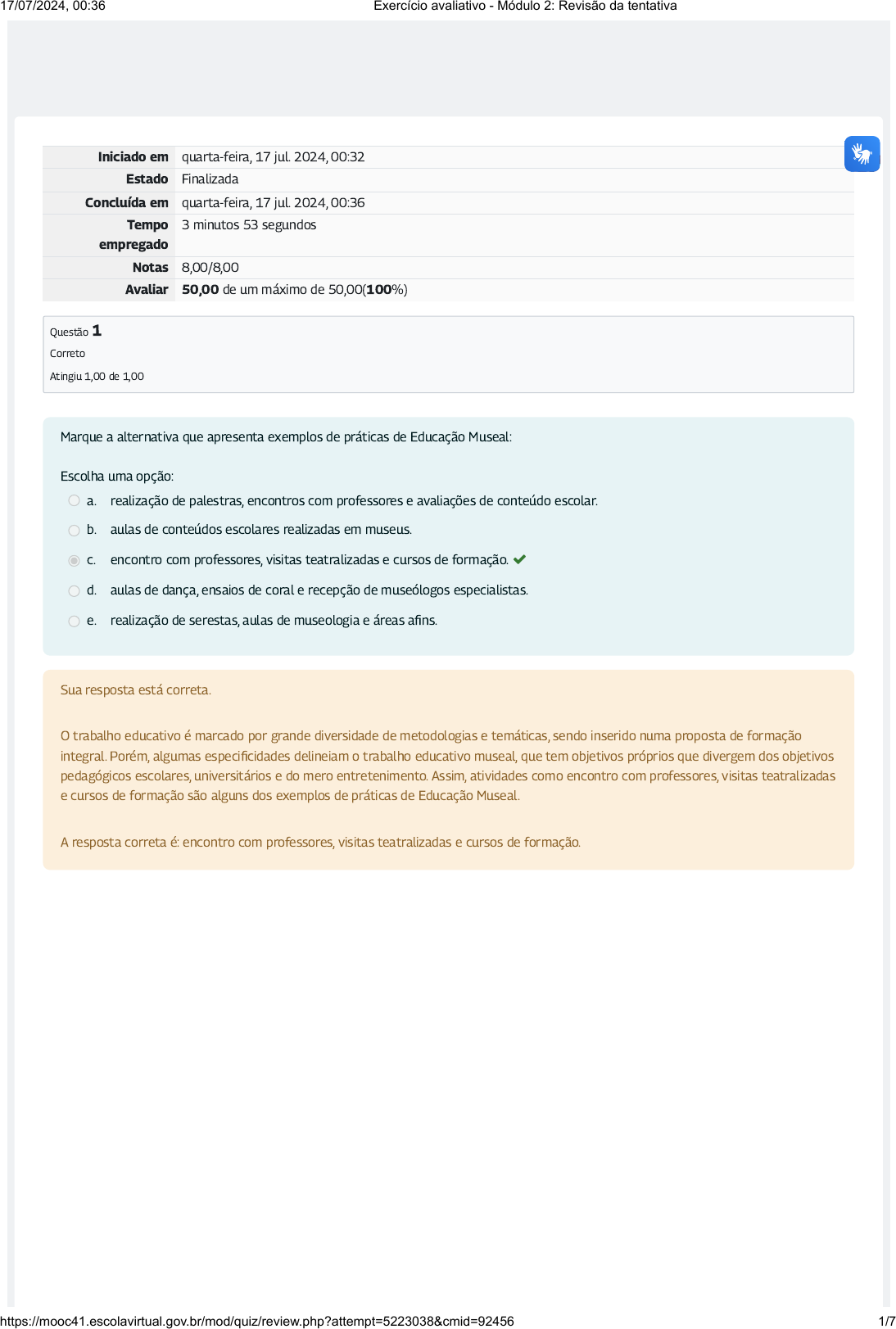 <p>Iniciado em quarta-feira, 17 jul. 2024, 00:32</p><p>Estado Finalizada</p><p>Concluída em quarta-feira, 17 jul. 2024, 00:36</p><p>Tempo</p><p>empregado</p><p>3 minutos 53 segundos</p><p>Notas 8,00/8,00</p><p>Avaliar 50,00 de um máximo de 50,00(100%)</p><p>Questão 1</p><p>Correto</p><p>Atingiu 1,00 de 1,00</p><p>Marque a alternativa que apresenta exemplos de práticas de Educação Museal:</p><p>Escolha uma opção:</p><p>a. realização de palestras, encontros com professores e avaliações de conteúdo escolar.</p><p>b. aulas de conteúdos escolares realizadas em museus.</p><p>c. encontro com professores, visitas teatralizadas e cursos de formação. </p><p>d. aulas de dança, ensaios de coral e recepção de museólogos especialistas.</p><p>e. realização de serestas, aulas de museologia e áreas a�ns.</p><p>Sua resposta está correta.</p><p>O trabalho educativo é marcado por grande diversidade de metodologias e temáticas, sendo inserido numa proposta de formação</p><p>integral. Porém, algumas especi�cidades delineiam o trabalho educativo museal, que tem objetivos próprios que divergem dos objetivos</p><p>pedagógicos escolares, universitários e do mero entretenimento. Assim, atividades como encontro com professores, visitas teatralizadas</p><p>e cursos de formação são alguns dos exemplos de práticas de Educação Museal.</p><p>A resposta correta é: encontro com professores, visitas teatralizadas e cursos de formação.</p><p>17/07/2024, 00:36 Exercício avaliativo - Módulo 2: Revisão da tentativa</p><p>https://mooc41.escolavirtual.gov.br/mod/quiz/review.php?attempt=5223038&cmid=92456 1/7</p><p>Questão 2</p><p>Correto</p><p>Atingiu 1,00 de 1,00</p><p>Questão 3</p><p>Correto</p><p>Atingiu 1,00 de 1,00</p><p>Quais as vantagens do audioguia como recurso educativo?</p><p>Escolha uma opção:</p><p>a. Não há vantagens, o audioguia não é um recurso educativo.</p><p>b. O audioguia tem apenas uma vantagem, que é o visitante não se sentir sozinho no museu.</p><p>c. Não há vantagens, pois o audioguia é um recurso muito caro, pois ainda não é produzido no Brasil.</p><p>d. O audioguia pode ser editado em várias línguas e pode auxiliar pessoas com de�ciência visual e baixa visão. </p><p>e. O audioguia é um recurso voltado para pessoas com de�ciência, apresentando vantagens limitadas.</p><p>Sua resposta está correta.</p><p>Como visto nesta Unidade: “Trata-se de um recurso bastante caro, pois ainda é produzido de forma limitada no Brasil, mas de grande</p><p>utilidade para o visitante individual no museu, podendo ainda ser editado em várias línguas. Os audioguias podem ter diferentes</p><p>programações, com textos e locução voltados para públicos diversos: de diferentes faixas etárias, com audiodescrição para pessoas</p><p>cegas ou com baixa visão, que apresentem diferentes circuitos possíveis ou ainda que contenham jogos e propostas de análise de</p><p>objetos, ultrapassando a simples oferta de informações técnicas ou descritivas”.</p><p>A resposta correta é: O audioguia pode ser editado em várias línguas e pode auxiliar pessoas com de�ciência visual e baixa visão.</p><p>Apesar de não ser uma realidade para a maior parte das instituições museais, um site é uma ferramenta cada vez mais utilizada e</p><p>representa um importante espaço de divulgação das ações educativas, podendo também conter propostas de interação com o público.</p><p>Essa a�rmação é verdadeira ou falsa?</p><p>Escolha uma opção:</p><p>Verdadeiro </p><p>Falso</p><p>O site institucional é uma ferramenta cada vez mais utilizada nas instituições e representa um importante espaço de divulgação do</p><p>trabalho que está sendo desenvolvido. É fundamental que os setores educativos possuam seu espaço dentro do portal institucional e</p><p>nele devem constar os objetivos do setor, os projetos em andamento e demais informações. Vale, ainda, dedicar um espaço ao público</p><p>infantojuvenil com caráter lúdico e didático, visando aproximar esse segmento, de laços tão estreitos com o mundo virtual, das</p><p>questões relacionadas à preservação do patrimônio. Em geral, devem constar jogos e passatempos, textos de apoio ao professor e ao</p><p>aluno, agenda, imagens e outras informações, sempre com uma linguagem adequada à faixa etária à qual se destina.</p><p>A resposta correta é 'Verdadeiro'.</p><p>17/07/2024, 00:36 Exercício avaliativo - Módulo 2: Revisão da tentativa</p><p>https://mooc41.escolavirtual.gov.br/mod/quiz/review.php?attempt=5223038&cmid=92456 2/7</p><p>Questão 4</p><p>Correto</p><p>Atingiu 1,00 de 1,00</p><p>O que podemos a�rmar sobre a realização de parcerias para o trabalho educativo dos museus?</p><p>Escolha uma opção:</p><p>a. Não é possível realizar parcerias quando não há recursos envolvidos.</p><p>b. Patrocínios são uma forma de marketing cultural e não se con�guram como parceria.</p><p>c. As parcerias só existem quando envolvem contrapartidas �nanceiras entre as instituições.</p><p>d. É possível estabelecer parcerias com grandes empresas e com pequenos parceiros, como representantes do comércio</p><p>local, um visitante, ou envolvendo trocas de experiência entre pro�ssionais.</p><p></p><p>e. Qualquer relação com o público pode ser considerada uma forma de parceria.</p><p>Sua resposta está correta.</p><p>Nesta Unidade, vimos que: “As parcerias podem envolver recursos �nanceiros ou não. As contrapartidas institucionais podem ser, por</p><p>exemplo, a troca de experiência entre pro�ssionais ou a cessão de recursos físicos e de estrutura. Patrocínios também são uma forma</p><p>de parceria e não precisam acontecer somente em grandes projetos. Às vezes o comércio local, um visitante ou mesmo uma empresa</p><p>de pequeno porte podem ter interesse em se envolver com as ações de um museu”.</p><p>A resposta correta é: É possível estabelecer parcerias com 