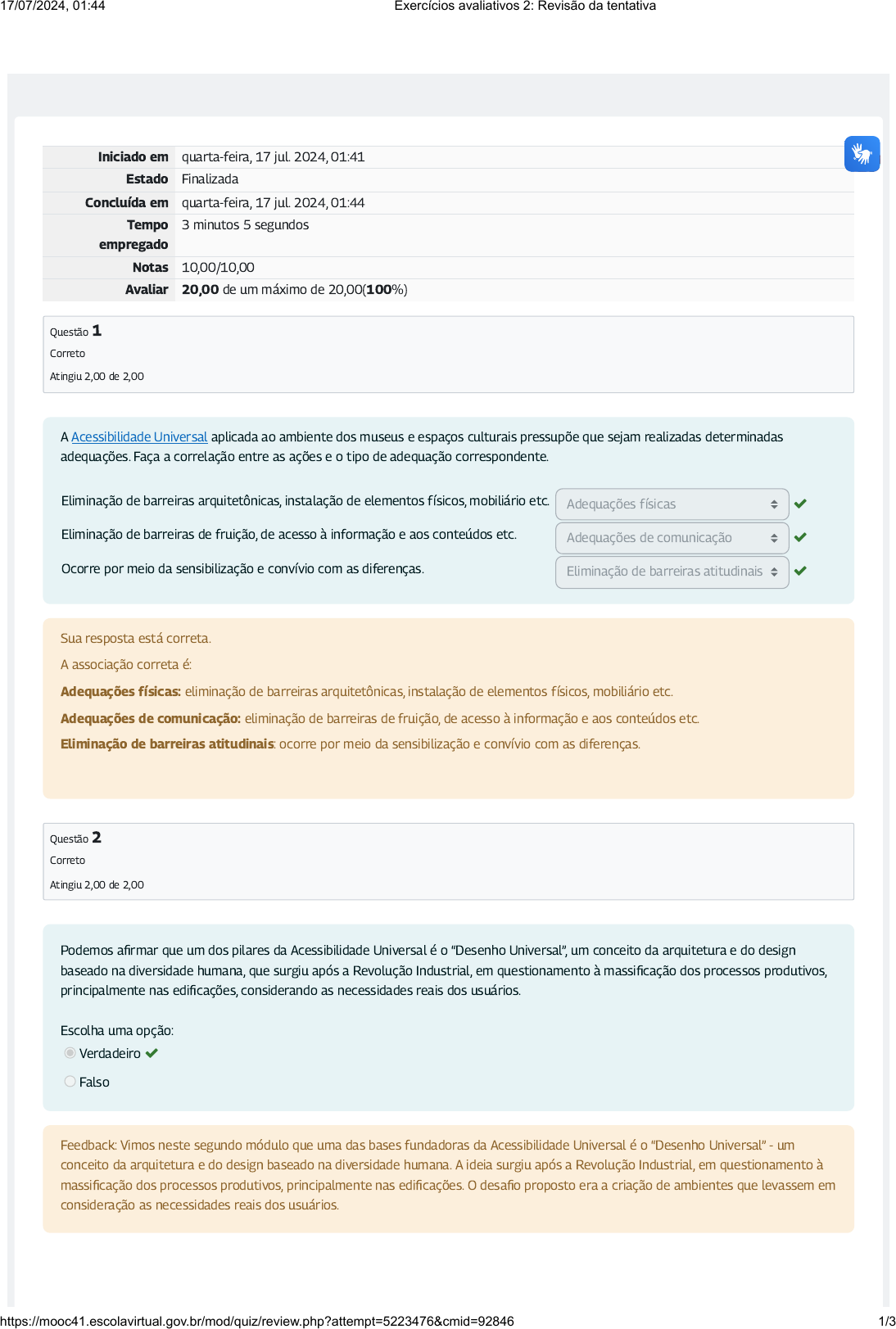 <p>Iniciado em quarta-feira, 17 jul. 2024, 01:41</p><p>Estado Finalizada</p><p>Concluída em quarta-feira, 17 jul. 2024, 01:44</p><p>Tempo</p><p>empregado</p><p>3 minutos 5 segundos</p><p>Notas 10,00/10,00</p><p>Avaliar 20,00 de um máximo de 20,00(100%)</p><p>Questão 1</p><p>Correto</p><p>Atingiu 2,00 de 2,00</p><p>Questão 2</p><p>Correto</p><p>Atingiu 2,00 de 2,00</p><p>A Acessibilidade Universal aplicada ao ambiente dos museus e espaços culturais pressupõe que sejam realizadas determinadas</p><p>adequações. Faça a correlação entre as ações e o tipo de adequação correspondente.</p><p>Eliminação de barreiras arquitetônicas, instalação de elementos físicos, mobiliário etc. </p><p>Eliminação de barreiras de fruição, de acesso à informação e aos conteúdos etc. </p><p>Ocorre por meio da sensibilização e convívio com as diferenças. </p><p>Adequações físicas</p><p>Adequações de comunicação</p><p>Eliminação de barreiras atitudinais</p><p>Sua resposta está correta.</p><p>A associação correta é:</p><p>Adequações físicas: eliminação de barreiras arquitetônicas, instalação de elementos físicos, mobiliário etc.</p><p>Adequações de comunicação: eliminação de barreiras de fruição, de acesso à informação e aos conteúdos etc.</p><p>Eliminação de barreiras atitudinais: ocorre por meio da sensibilização e convívio com as diferenças.</p><p>Podemos a�rmar que um dos pilares da Acessibilidade Universal é o “Desenho Universal”, um conceito da arquitetura e do design</p><p>baseado na diversidade humana, que surgiu após a Revolução Industrial, em questionamento à massi�cação dos processos produtivos,</p><p>principalmente nas edi�cações, considerando as necessidades reais dos usuários.</p><p>Escolha uma opção:</p><p>Verdadeiro </p><p>Falso</p><p>Feedback: Vimos neste segundo módulo que uma das bases fundadoras da Acessibilidade Universal é o “Desenho Universal” - um</p><p>conceito da arquitetura e do design baseado na diversidade humana. A ideia surgiu após a Revolução Industrial, em questionamento à</p><p>massi�cação dos processos produtivos, principalmente nas edi�cações. O desa�o proposto era a criação de ambientes que levassem em</p><p>consideração as necessidades reais dos usuários.</p><p>17/07/2024, 01:44 Exercícios avaliativos 2: Revisão da tentativa</p><p>https://mooc41.escolavirtual.gov.br/mod/quiz/review.php?attempt=5223476&cmid=92846 1/3</p><p>https://mooc41.escolavirtual.gov.br/mod/page/view.php?id=92844</p><p>Questão 3</p><p>Correto</p><p>Atingiu 2,00 de 2,00</p><p>Questão 4</p><p>Correto</p><p>Atingiu 2,00 de 2,00</p><p>Os sete princípios do Desenho Universal foram criados nas décadas de 1980 e 1990, pelo arquiteto americano Ron Mace (que utilizava</p><p>cadeira de rodas e um respirador arti�cial) e um grupo de colegas defensores da causa. Estes princípios têm sido amplamente</p><p>divulgados por institutos e organizações em todo mundo.</p><p>Faça a associação entre os princípios e de�nições.</p><p>Uso equiparável: espaços, objetos e produtos que podem ser utilizados por pessoas com diferentes</p><p>capacidades, tornando os ambientes iguais para todos.</p><p></p><p>Uso Flexível: design de produtos ou espaços que atendam pessoas com diferentes habilidades e diversas</p><p>preferências, sendo adaptáveis para qualquer uso.</p><p></p><p>Uso simples e intuitivo: fácil entendimento para que uma pessoa possa compreender, independentemente de</p><p>sua experiência, conhecimento, habilidades de linguagem, ou nível de concentração.</p><p></p><p>Informação de fácil percepção: quando a informação necessária é transmitida de forma a atender as</p><p>necessidades do receptador, seja ela uma pessoa estrangeira, com di�culdades de visão ou audição.</p><p></p><p>Tolerante ao erro: previsto para minimizar os riscos e possíveis consequências de ações acidentais ou não</p><p>intencionais.</p><p></p><p>Baixo esforço físico: para ser usado e�cientemente, com conforto e com o mínimo de fadiga.</p><p></p><p>Dimensão e espaço para aproximação e uso: que estabelece dimensões e espaços apropriados para o acesso, o</p><p>alcance, a manipulação e o uso, independentemente do tamanho do corpo (obesos, pessoas de baixa estatura</p><p>etc.), da postura ou mobilidade do usuário (pessoas em cadeiras de rodas, com carrinhos de bebê, bengalas</p><p>etc.).</p><p></p><p>IGUALITÁRIO</p><p>ADAPTÁVEL</p><p>ÓBVIO</p><p>CONHECIDO</p><p>SEGURO</p><p>SEM ESFORÇO</p><p>ABRANGENTE</p><p>Sua resposta está correta.</p><p>Para promover uma experiência espacial inclusiva em uma exposição, basta oferecer espaço para circulação de cadeiras de rodas.</p><p>Escolha uma opção:</p><p>Verdadeiro</p><p>Falso </p><p>Conforme apresentado no módulo 2, a Experiência espacial inclusiva prevê espaço e recursos de comunicação acessíveis para pessoas</p><p>em cadeira de rodas, usuários de equipamentos de mobilidade, de diferentes estaturas, com limitação sensorial e com diferentes níveis</p><p>de conhecimento promovem uma experiência inclusiva.</p><p>17/07/2024, 01:44 Exercícios avaliativos 2: Revisão da tentativa</p><p>https://mooc41.escolavirtual.gov.br/mod/quiz/review.php?attempt=5223476&cmid=92846 2/3</p><p>Questão 5</p><p>Correto</p><p>Atingiu 2,00 de 2,00</p><p>Acessibilidade atitudinal em museus pressupõe:</p><p>a) Conhecimento e reconhecimento de direitos e leis que amparam o direito de ir e vir, de escolha, de equiparação de oportunidades e</p><p>de uso de recursos e equipamentos de tecnologia assistiva, locomoção, cães-guia e de companhia.</p><p>b) Recepção e acolhimento de visitantes com de�ciência sem atitudes discriminatórias e estigmatizadas, respeito à sua autonomia e</p><p>direito de escolha.</p><p>c) Evitar atitudes segregacionistas, limitantes e capacitistas, uso de termos ultrapassados, comentários e olhares preconceituoso