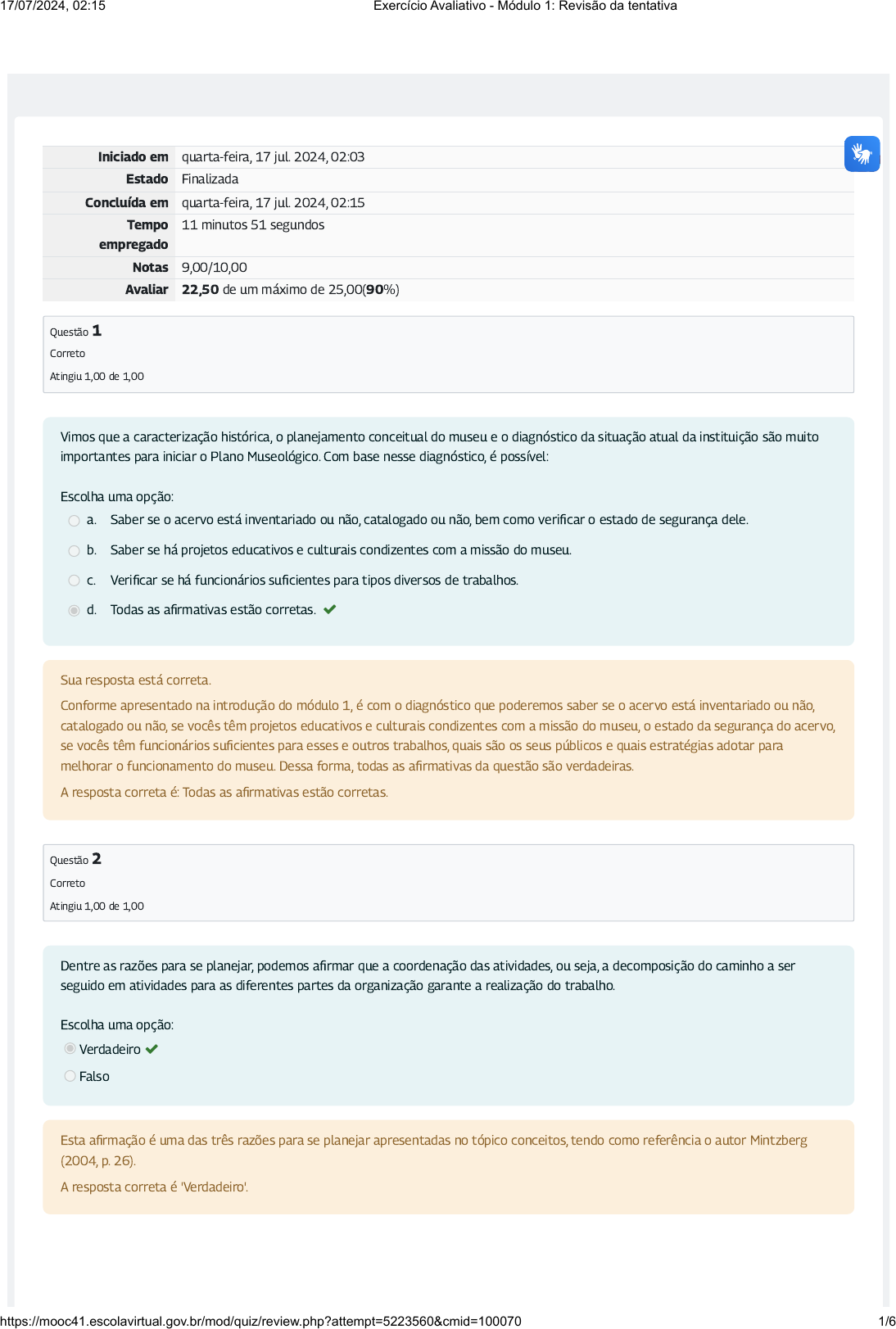 <p>Iniciado em quarta-feira, 17 jul. 2024, 02:03</p><p>Estado Finalizada</p><p>Concluída em quarta-feira, 17 jul. 2024, 02:15</p><p>Tempo</p><p>empregado</p><p>11 minutos 51 segundos</p><p>Notas 9,00/10,00</p><p>Avaliar 22,50 de um máximo de 25,00(90%)</p><p>Questão 1</p><p>Correto</p><p>Atingiu 1,00 de 1,00</p><p>Questão 2</p><p>Correto</p><p>Atingiu 1,00 de 1,00</p><p>Vimos que a caracterização histórica, o planejamento conceitual do museu e o diagnóstico da situação atual da instituição são muito</p><p>importantes para iniciar o Plano Museológico. Com base nesse diagnóstico, é possível:</p><p>Escolha uma opção:</p><p>a. Saber se o acervo está inventariado ou não, catalogado ou não, bem como veri�car o estado de segurança dele.</p><p>b. Saber se há projetos educativos e culturais condizentes com a missão do museu.</p><p>c. Veri�car se há funcionários su�cientes para tipos diversos de trabalhos.</p><p>d. Todas as a�rmativas estão corretas. </p><p>Sua resposta está correta.</p><p>Conforme apresentado na introdução do módulo 1, é com o diagnóstico que poderemos saber se o acervo está inventariado ou não,</p><p>catalogado ou não, se vocês têm projetos educativos e culturais condizentes com a missão do museu, o estado da segurança do acervo,</p><p>se vocês têm funcionários su�cientes para esses e outros trabalhos, quais são os seus públicos e quais estratégias adotar para</p><p>melhorar o funcionamento do museu. Dessa forma, todas as a�rmativas da questão são verdadeiras.</p><p>A resposta correta é: Todas as a�rmativas estão corretas.</p><p>Dentre as razões para se planejar, podemos a�rmar que a coordenação das atividades, ou seja, a decomposição do caminho a ser</p><p>seguido em atividades para as diferentes partes da organização garante a realização do trabalho.</p><p>Escolha uma opção:</p><p>Verdadeiro </p><p>Falso</p><p>Esta a�rmação é uma das três razões para se planejar apresentadas no tópico conceitos, tendo como referência o autor Mintzberg</p><p>(2004, p. 26).</p><p>A resposta correta é 'Verdadeiro'.</p><p>17/07/2024, 02:15 Exercício Avaliativo - Módulo 1: Revisão da tentativa</p><p>https://mooc41.escolavirtual.gov.br/mod/quiz/review.php?attempt=5223560&cmid=100070 1/6</p><p>Questão 3</p><p>Correto</p><p>Atingiu 1,00 de 1,00</p><p>Questão 4</p><p>Correto</p><p>Atingiu 1,00 de 1,00</p><p>A seguir, marque as opções que completam corretamente a sentença: Mintzberg (2004) aponta alguns perigos quando se fala em</p><p>formação de estratégias, as quais não devem:</p><p>Escolha uma ou mais:</p><p>a. Inibir o olhar para novas possibilidades. </p><p>b. Simpli�car demais o entendimento da instituição. </p><p>c. Alinhar ações à estratégia.</p><p>d. Inibir a criatividade. </p><p>Sua resposta está correta.</p><p>Os perigos relativos à formação de estratégias apontados por Mintzberg (2004) são:</p><p>- não deve inibir o olhar para novas possibilidades;</p><p>- não deve simpli�car demais o entendimento da instituição; ou</p><p>- não deve inibir a criatividade.</p><p>A a�rmativa “alinhar ações à estratégia” não está entre os pontos apresentados pelo autor neste tópico.</p><p>As respostas corretas são: Inibir o olhar para novas possibilidades. , Simpli�car demais o entendimento da instituição., Inibir a</p><p>criatividade.</p><p>Faça a associação do conceito e a de�nição correta:</p><p>É o instrumento mais amplo, genérico, sintético e abrangente. Envolve toda a instituição e seu foco</p><p>é a longo prazo. (Missão, Visão e Objetivos Estratégicos)</p><p></p><p>Abrange as atividades especí�cas a serem desenvolvidas imediatamente, no curto prazo.</p><p>(Projetos/Ações)</p><p></p><p>Abrange as unidades ou funções da instituição, sendo mais detalhado e está voltado para o médio</p><p>prazo. (Programas)</p><p></p><p>Planejamento estratégico</p><p>Planejamento operacional</p><p>Planejamento tático</p><p>Sua resposta está correta.</p><p>A associação correta é:</p><p>- O planejamento estratégico é o instrumento mais amplo, genérico, sintético e abrangente. Envolve toda a instituição e seu foco é a</p><p>longo prazo. (Missão, Visão e Objetivos Estratégicos)</p><p>- O planejamento tático abrange as unidades ou funções da instituição, sendo mais detalhado e está voltado para o médio prazo.</p><p>(Programas)</p><p>- O planejamento operacional abrange as atividades especí�cas a serem desenvolvidas imediatamente, no curto prazo. (Projetos/Ações)</p><p>A resposta correta é: É o instrumento mais amplo, genérico, sintético e abrangente. Envolve toda a instituição e seu foco é a longo</p><p>prazo. (Missão, Visão e Objetivos Estratégicos) → Planejamento estratégico, Abrange as atividades especí�cas a serem desenvolvidas</p><p>imediatamente, no curto prazo. (Projetos/Ações) → Planejamento operacional, Abrange as unidades ou funções da instituição, sendo</p><p>mais detalhado e está voltado para o médio prazo. (Programas) → Planejamento tático.</p><p>17/07/2024, 02:15 Exercício Avaliativo - Módulo 1: Revisão da tentativa</p><p>https://mooc41.escolavirtual.gov.br/mod/quiz/review.php?attempt=5223560&cmid=100070 2/6</p><p>Questão 5</p><p>Correto</p><p>Atingiu 1,00 de 1,00</p><p>Questão 6</p><p>Correto</p><p>Atingiu 1,00 de 1,00</p><p>O planejamento operacional diz respeito aos passos para realização de uma atividade.</p><p>Escolha uma opção:</p><p>Verdadeiro </p><p>Falso</p><p>O planejamento operacional diz respeito aos passos necessários para se realizar.</p><p>A resposta correta é 'Verdadeiro'.</p><p>A ampliação do diálogo com o campo museal estabeleceu as principais diretrizes para a de�nição de uma política para o setor de forma</p><p>estratégica. Com base nisso, leia as a�rmativas e marque a opção correta.</p><p>I - O Plano Museológico deve ser elaborado com a �nalidade de 