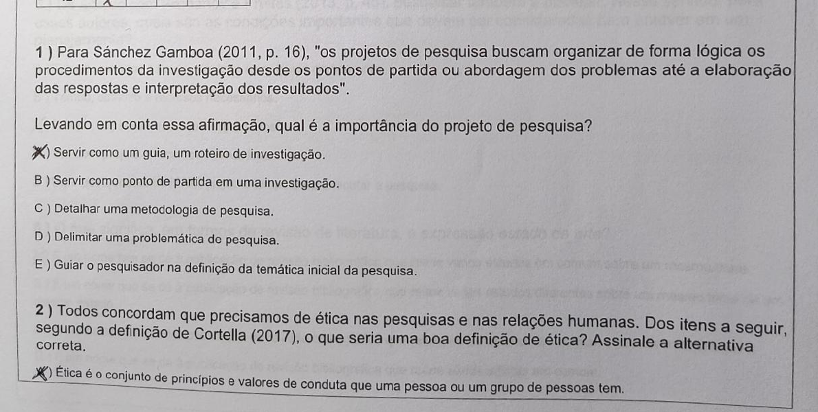 <p>1) Para Sánchez Gamboa (2011, p. 16), "os projetos de pesquisa buscam organizar de forma lógica os procedimentos da investigação desde os pontos de partida ou abordagem dos problemas até a elaboração das respostas e interpretação dos resultados". Levando em conta essa afirmação, qual é a importância do projeto de pesquisa? Servir como um guia, um roteiro de investigação. B) Servir como ponto de partida em uma investigação. C ) Detalhar uma metodologia de pesquisa. D ) Delimitar uma problemática de pesquisa. E) Guiar o pesquisador na definição da temática inicial da pesquisa. 2) Todos concordam que precisamos de ética nas pesquisas e nas relações humanas. Dos itens a seguir, segundo a definição de Cortella (2017), o que seria uma boa definição de ética? Assinale a alternativa Ética é o conjunto de e valores de conduta que uma pessoa ou um grupo de pessoas tem.</p><p>B C ) Ética é um conjunto de e valores que você usa para definir o que deve ser D ) Ética é um conjunto de e valores que você usa para resolver grandes dilemas ) Ética é um conjunto de principios e valores que você usa para decidir o que pode E ) Ética é um conjunto de e valores que você usa para definir o que quer Dentre os itens a seguir, marque aqueles que caracterizam uma revisão de literatura sistemática. Análise de II. Etapas bem III. Resposta a uma pergunta específica. IV. Reúne estudos sobre um mesmo Assinale a alternativa correta. A) É correto o que se afirma em I, III e IV apenas. É correto o que se afirma em II É correto o que se afirma em II, III e IV apenas. É correto o que se afirma em II e III apenas. E) É correto o que se afirma em II e IV apenas. assinale informação. Sobre informações e produções de considere as alternativas a seguir e 4) Ao se trabalhar com pesquisa existem diferenças entre a produção de conhecimentos e a a qual denota o que é A) Conhecimento é o que precisamos para conhecer um tema. B Conhecimento trata-se de fatos cumulativos sobre um tema. Conhecimento é o que fica em você quando acaba uma pesquisa. Conhecimento é variável e fácil de encontrar. E ) Conhecimento é o que se esquece facilmente após uma pesquisa. 5 ) De acordo com Prodanov e Freitas (2013, p. 45), pesquisar também é planejar. Nesse sentido, para esses autores, quais são as condições importantes que devem ser consideradas para antever em um planejamento? A ) Tempo, espaços e estar vinculado a um grupo de pesquisa. B Tempo, dinheiro e recursos necessários. Tempo, espaços e recursos Um bom projeto e recursos E) Uma boa questão de investigação e tempo para executar a pesquisa. 6 o que significa, em termos de revisão de literatura, a expressão estado da arte? É um nome que se dá à publicação de revisão bibliográfica que reúne vários estudos em comum sobre um mesmo tema, B É um nome que se dá à publicação de revisão bibliográfica que reúne vários estudos diferentes sobre um mesmo tema de um mesmo C ) É um nome que se dá à publicação de revisão bibliográfica que reúne vários estudos em comum sobre diversos temas. D ) É um nome que se dá à publicação de revisão bibliográfica que reúne vários artistas em comum.</p><p>E ) É um nome que se dá à publicação que reúne várias artes de determinado autor. No Brasil, a regulamentação de pesquisas tem iniciativa por parte do Conselho Nacional de Saúde (CNS) e deriva, principalmente, da necessidade de regulamentar as atividades de pesquisas envolvendo seres Nesse sentido, assinale a alternativa que indica qual item faz parte das atribuições do CNS no que tange às definições de pesquisa. A) Fiscalizar órgãos regulatórios de pesquisa B ) Definir normas técnicas para pesquisa C ) Regulamentar as normas de pesquisa acadêmica. Implantar Comitês de Ética em Pesquisa. E Fazer a gestão financeira de recursos públicos destinados às pesquisas científicas no Brasil. 8 ) Nos relatórios de pesquisa são apresentados elementos pré-textuais, textuais e pós-textuais para essa forma de trabalho. Nesse sentido, os elementos pré-textuais se referem: ) a todos os itens que aparecem antes do texto formal do relatório de pesquisa, como resumo, sumário, dedicatórias, listas, capa e folha de rosto. à apresentação do texto no relatório de pesquisa. à introdução do texto no relatório de pesquisa. à capa e à ficha catalográfica no relatório de pesquisa. E) às dedicatórias e aos agradecimentos no relatório de pesquisa. 9 ) Assim como a qualidade do conteúdo apresentado nos relatórios de pesquisas e em trabalhos científicos, a "forma" como esses trabalhos são apresentados é extremamente importante também. Qual das alternativas a seguir melhor expressa essa importância? A) A forma dá estrutura estética ao conteúdo. ) A forma dá estrutura ao conteúdo. A forma é a essência do trabalho. D ) A forma melhora o conteúdo. E) A forma exemplifica o conteúdo. 10 ) Em uma pesquisa, a escolha dos instrumentos para coletar dados faz parte da definição da sua metodologia. Com relação aos itens a seguir, indique V para verdadeiro, se forem considerados instrumentos de coleta de dados, e F para falso, se não forem considerados instrumentos de coleta de dados. Questionários. ( ) Grupo focal. ( ) Formulários eletrônicos e filmagens. ( ) Roteiros de entrevistas estruturadas e semiestruturadas. A) V, V, V, F B) F, F, F, F</p><p>F, F, V V. V. V E) F. V. F 11) Considere as alternativas a seguir, marcando V para verdadeiro e F para falso. ( ) Em um TCC, a capa, a folha de rosto e o sumário são sempre elementos obrigatórios. Em um TCC, os anexos são obrigatórios. As listas apresentadas em TCC são opcionais. Resumo e resumo em língua estrangeira são obrigatórios em TCCs. A lista de referências ao final do TCC é um item opcional. Assinale a alternativa que apresenta a sequência A) F. V. F B V. F. V, V V, F, V, F D) V, F. V. F E) F. V, V. F 12 ) A A