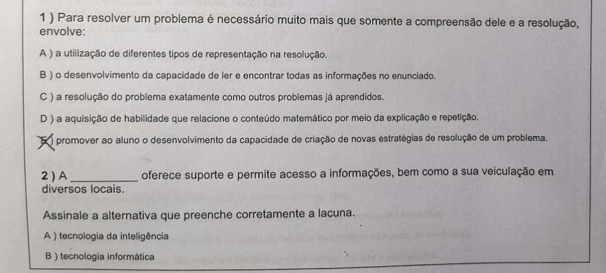 <p>1) Para resolver um problema é necessário muito mais que somente a compreensão dele e a resolução, envolve: A) a utilização de diferentes tipos de representação na resolução. B) o desenvolvimento da capacidade de ler e encontrar todas as informações no enunciado. C ) a resolução do problema exatamente como outros problemas já aprendidos. D ) a aquisição de habilidade que relacione o conteúdo matemático por meio da explicação e repetição. promover ao aluno o desenvolvimento da capacidade de criação de novas estratégias de resolução de um problema. 2) A oferece suporte e permite acesso a informações, bem como a sua veiculação em diversos locais. Assinale a alternativa que preenche corretamente a lacuna. A) tecnologia da inteligência tecnologia informática</p><p>tecnologia de comunicação e informação midiáticas D) tecnologia digital tecnologia da comunicação e informação 3 Com relação à Didática da Matemática, assinale a alternativa correta. A) A Didática da envolve a orientação das tarefas de ensino, sem se preocupar com o desenvolvimento crítico do aluno. B ) A Didática da Matemática visa trabalhar modelos e receitas de ensino. C ) A Didática da Matemática envolve a prática docente alicerçada em teorias que se distanciam das necessidades atuais da A Didática da é uma didática dessa disciplina, que abrange a relação entre o ensino e a aprendizagem do E ) A Didática da Matemática envolve conteúdos e métodos de ensino que buscam favorecer a aprendizagem do conhecimento matemático 4) A modelagem matemática tem como objetivo: A chegar a considerações com base em situações prontas que são impostas aos alunos. inserir a cultura popular no conhecimento matemático, por meio da incorporação desta nas situações de ensino e aprendizagem do aluno. modelar situações da realidade vivenciadas pelo aluno. D ) levar o aluno a refletir sobre as situações vividas com base somente na matemática E ) incorporar os modelos matemáticos na cultura do aluno, mostrando que a matemática científica é mais importante que a matemática cultural. 5) Leias as afirmativas a seguir e, em seguida, assinale V (vantagens) ou D (desvantagens) sobre a utilização dos jogos no processo de ensino e aprendizagem de Matemática: ( ) auxílio na compreensão de conceitos que podem parecer incompreensíveis num primeiro momento. ( ) A compreensão de que todos os conceitos a serem ensinados ao alunos devem ter uma atividade jogo. ( ) jogo pode ser trabalhado para iniciar um conceito ou conteúdo, reforçar ou recuperar conceitos já aprendidos e recuperar habilidades necessárias. ) A falta de disponibilidade de recursos para o uso de jogos, sejam materiais ou digitais, pode vir a dificultar o trabalho docente. Assinale a alternativa que contempla a sequência correta. A ) D, V, V, V B) D, D, V C D, V, D, V V, V, V, V V, D. V, D 6 ) Sobre a investigação matemática, é correto afirmar que: A ) seu principal objetivo é usar conhecimento matemático para propor resoluções diferentes. B ) uma hipótese ou conjectura levantada na tarefa exploratória investigativa não pode ser modificada. C ) no âmbito da matemática, não envolve o trabalho com hesitações, dúvidas e contradições.</p><p>identificar as propriedades a serem utilizadas na resolução do problema. busca levar à compreensão das relações existentes entre objetos matemáticos, conceitos e procedimentos que permitam E ) essa tendência busca fazer com que os alunos aprendam como um matemático profissional. 7) o processo de avaliação da aprendizagem no contexto dos jogos nos permite compreender que: conhecimento a forma de se avaliar o aluno se modifica, pois ele passa a não ter o medo de errar, se expondo mais e fazendo uso do seu B ) a avaliação no jogo não permite que se acompanhe a assimilação do aluno. C ) a avaliação no contexto do jogo, envolve somente o registro do aluno sobre o jogo e as estratégias. D) o simples ato de jogar garante ao professor que o aluno expresse as dificuldades dele com o E ) a avaliação considera que o desempenho e a participação do aluno são os fatores principais. A matemática surge da necessidade humana de: problemas que surgem no cotidiano da população ao longo dos tempos. contar, medir e cobrar impostos dos súditos, permitindo que os espaços de plantio fossem organizados ou seja, resolve os B ) socializar os conhecimentos aprendidos, a fim de que sejam propagados em diferentes C ) conhecer a matemática como uma ciência que pode ser empregada em nosso cotidiano. seu D ) propagar cotidiano. fazendo com que todos os conteúdos por ela propostos, apesar de não a utilizarem em E ) manter as preocupações culturais, mostrando que o conhecimento permanece o mesmo. 9) Assinale a alternativa que melhor corresponde à semirrealidade. A ) Trata-se da criação de problemas baseadas em situações imaginárias. B ) Ela surge do interesse real dos alunos. É uma realidade observada do cotidiano. É uma realidade construída por um autor, com base em uma situação que é artificial. E É uma situação do cotidiano que envolve a investigação prática. 10 ) A investigação matemática pode ser descrita como: uma tendência metodológica na qual o aluno é levado à descoberta entre objetos matemáticos e suas propriedades, sendo eles conhecidos ou não. B ) um momento da aula no qual o aluno é levado próximo à investigação científica. C uma atividade que desenvolve o questionamento, a busca por evidências e a comunicação. D uma prática na qual o aluno é levado a descobrir e justificar suas descobertas. E ) o caminho percorrido pelo aluno para descobrir um conteúdo, justificando suas descobertas. 11 ) Com relação à modelagem matemática é correto afirmar que: A ) os saberes docentes se iniciam antes mesmo de sua formação e se constituem ao longo da vida. B ) ela e a modelação matemática são a mesma cois