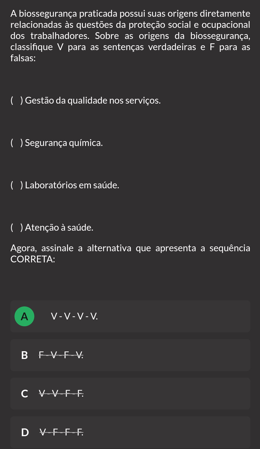 <p>A biossegurança praticada possui suas origens diretamente relacionadas às questões da proteção social e ocupacional dos trabalhadores. Sobre as origens da biossegurança, classifique V para as sentenças verdadeiras e F para as falsas: ( ) Gestão da qualidade nos serviços. ( ) Segurança química. ( ) Laboratórios em saúde. ( ) Atenção à saúde. Agora, assinale a alternativa que apresenta a sequência CORRETA: A V F. D</p>