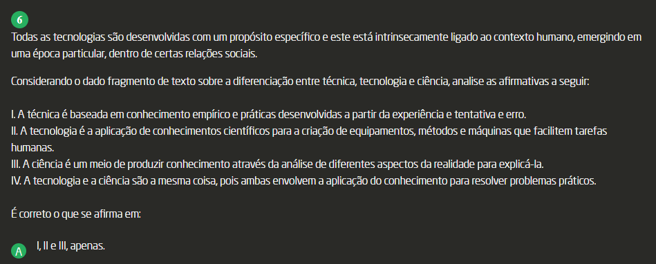 <p>6 Todas as tecnologias são desenvolvidas com um propósito específico e este está intrinsecamente ligado ao contexto humano, emergindo em uma época particular, dentro de certas relações sociais. Considerando 0 dado fragmento de texto sobre a diferenciação entre técnica, tecnologia e ciência, analise as afirmativas a seguir: I. A técnica é baseada em conhecimento empírico e práticas desenvolvidas a partir da experiência e tentativa e erro. II. A tecnologia é a aplicação de conhecimentos científicos para a criação de equipamentos, métodos e máquinas que facilitem tarefas humanas. III. A ciência é um meio de produzir conhecimento através da análise de diferentes aspectos da realidade para explicá-la. IV. A tecnologia e a ciência são a mesma coisa, pois ambas envolvem a aplicação do conhecimento para resolver problemas práticos. É correto 0 que se afirma em: I, II e III, apenas.</p>