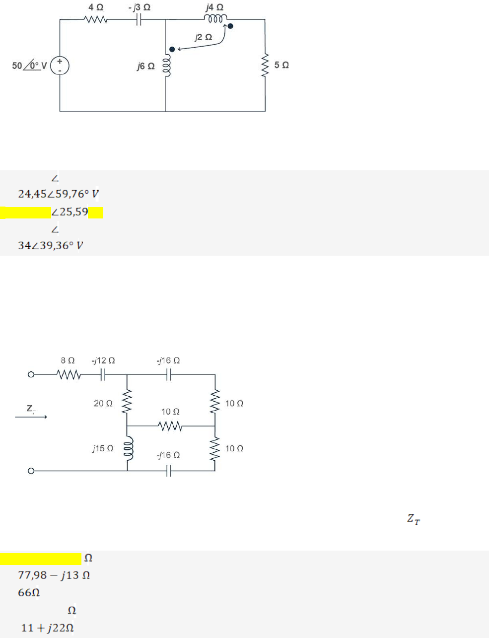 <p>CIRCUITOS ELETRICOS II</p><p>Atividade 4 – Prova N2</p><p>1. Analise o circuito a seguir:</p><p>Fonte: ALEXANDER, C. K.; SADIKU, M. N. O. Fundamentos de Circuitos Elétricos. 5. ed. São Paulo: Editora Bookman, 2013, p. 500. (Adaptado).</p><p>Considerando essas informações e o conteúdo estudado sobre tensão induzida, encontre a tensão no resistor de 5Ω no circuito apresentado.</p><p>· 37,15 86,57° V</p><p>·</p><p>· 22,25 ° V</p><p>· 54,17 54,11° V</p><p>·</p><p>2. As transformações delta-estrela e estrela-delta são muito importantes nas análises de circuitos trifásicos. Para isso, precisamos entender as transformações e identificar essas associações entre impedâncias, para simplificar os circuitos.</p><p>Analise o circuito a seguir:</p><p>Fonte: ALEXANDER, C. K.; SADIKU, M. N. O. Fundamentos de Circuitos Elétricos. 5. ed. São Paulo: Editora Bookman, 2013, p. 350. (Adaptado).</p><p>Considerando essas informações e o conteúdo estudado, calcule a impedância total no circuito apresentado.</p><p>· 34,69-j6,93</p><p>·</p><p>·</p><p>· 14,56 -j7</p><p>·</p><p>3. O coeficiente de acoplamento é uma relação entre os fluxos magnéticos do enrolamento primário e do enrolamento secundário de um transformador. Idealmente, teríamos um transformador com coeficiente de acoplamento k = 1, ou seja, todo fluxo que atravessa o primário atravessaria também o secundário.</p><p>Considerando essas informações e o conteúdo estudado, pode-se afirmar que, para um transformador com duas bobinas com , e indutância mútua de 3H, o coeficiente de acoplamento vale:</p><p>· 1,5.</p><p>· 0,6667.</p><p>· 0,75.</p><p>· 0,82.</p><p>· 4.</p><p>4. Uma fonte conectada em delta está fornecendo energia para uma carga conectada em estrela, em um sistema trifásico balanceado. Sabe-se que a impedância de linha é de 2 +j1Ω por fase e que a impedância de carga é de 6 + j2Ω por fase.</p><p>Assim, e considerando o conteúdo estudado, determine o módulo da tensão de linha na carga, sabendo que a tensão na fonte vale .</p><p>· 91,78 V.</p><p>· 76,56 V</p><p>· 88,89 V.</p><p>· 98,19 V.</p><p>· 220,02 V</p><p>5. Leia o trecho a seguir:</p><p>“Quando dois circuitos com ou sem contatos entre eles se afetam por meio do campo magnético gerado por um deles, diz-se que estão acoplados magneticamente. Os transformadores são um dispositivo elétrico projetado tendo como base o conceito de acoplamento magnético, pois usam bobinas acopladas magneticamente para transferir energia de um circuito para outro.”</p><p>Fonte: ALEXANDER, C. K.; SADIKU, M. N. O. Fundamentos de Circuitos Elétricos. 5. ed. São Paulo: Editora Bookman, 2013. p. 330.</p><p>O texto apresentado trata de acoplamento magnético, que é a base da teoria dos transformadores. Considerando essas informações e o conteúdo estudado sobre os conceitos envolvendo transformadores e acoplamento magnético, analise as afirmativas a seguir.</p><p>I. Duas bobinas estão mutuamente acopladas se o fluxo magnético de uma bobina passa pela outra com indutância mútua , medida em henrys (H).</p><p>II. A polaridade de tensão mútua, induzida nos circuitos com transformadores, é determinada pela convenção dos pontos.</p><p>III. Transformador é um dispositivo de quatro terminais, que tem duas ou mais boninas acopladas magneticamente e tem como função o abaixamento de tensão.</p><p>IV. Para um transformador ideal, tensão e corrente são diretamente proporcionais à relação de transformação a.</p><p>· II e IV.</p><p>· I e III.</p><p>· I, III e IV.</p><p>· I e II.</p><p>· II, III e IV.</p><p>6. Analise o circuito a seguir:</p><p>Fonte: ALEXANDER, C. K.; SADIKU, M. N. O. Fundamentos de Circuitos Elétricos. 5. ed. São Paulo: Editora Bookman, 2013, p. 365. (Adaptado).</p><p>Na maioria dos circuitos, é preciso utilizar ferramentas e teoremas para simplificar a configuração e encontrar a impedância equivalente. Considerando essas informações e o conteúdo estudado, encontre a impedância equivalente para o circuito o circuito apresentado.</p><p>·</p><p>·</p><p>·</p><p>·</p><p>·</p><p>7. Na análise de circuitos trifásicos equilibrados, quando dada a sequência de fase e as informações sobre as fontes e cargas, após algumas simplificações, é possível encontrar as correntes de fase e de linha para qualquer configuração. Agora, analise o circuito trifásico em estrela-delta a seguir:</p><p>Fonte: ALEXANDER, C. K.; SADIKU, M. N. O. Fundamentos de Circuitos Elétricos. 5. ed. São Paulo: Editora Bookman, 2013, p. 486.</p><p>Considerando essas informações e o conteúdo estudado sobre a configuração estrela-delta, determine as correntes de fase na carga para .</p><p>· ( ; A.</p><p>· ( ; A.</p><p>· ( ; A.</p><p>· ( ; A.</p><p>· ( A.</p><p>8. As fontes de tensão e corrente são projetos bastante complexos e estudados na Engenharia Elétrica. Para projetar, os teoremas de Thévenin e Norton são muito utilizados, pois não se conhece a carga que a fonte projetada irá alimentar. As fontes são, também, circuitos que envolvem transformadores.</p><p>Analise o circuito a seguir:</p><p>Fonte: ALEXANDER, C. K.; SADIKU, M. N. O. Fundamentos de Circuitos Elétricos. 5. ed. São Paulo: Editora Bookman, 2013, p. 535. (Adaptado).</p><p>Considerando essas informações e o conteúdo estudado, encontre a corrente de Norton no circuito com transformador apresentado.</p><p>· 1,62 -12,91° A</p><p>· 4 13,33° A</p><p>· 6,18 44,46° A</p><p>· 3 12,08° A</p><p>· 6,76 A</p><p>9. Analise o circuito a seguir:</p><p>Fonte: ALEXANDER, C. K.; SADIKU, M. N. O. Fundamentos de Circuitos Elétricos. 5. ed. São Paulo: Editora Bookman, 2013, p. 399. (Adaptado).</p><p>Considerando essas informações e o conteúdo estudado sobre, encontre a corrente de Norton no circuito a partir dos terminais a-b:</p><p>·</p><p>·</p><p>·</p><p>·</p><p>·</p><p>10. “A potência instantânea total em um sistema trifásic