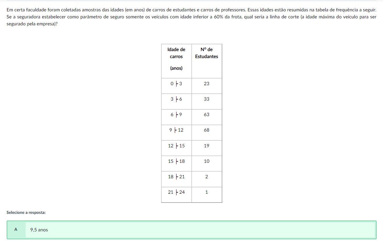 <p>Em certa faculdade foram coletadas amostras das idades (em anos) de carros de estudantes e carros de professores. Essas idades estão resumidas na tabela de frequência a seguir. Se a seguradora estabelecer como parâmetro de seguro somente os veículos com idade inferior a 60% da frota, qual seria a linha de corte (a idade máxima do veículo para ser segurado pela empresa)? Idade de de carros Estudantes (anos) 23 3 6 33 6 63 9 12 68 12 15 19 15 H 18 10 18 H 21 2 21 H 24 1 Selecione a resposta: A 9,5 anos</p>
