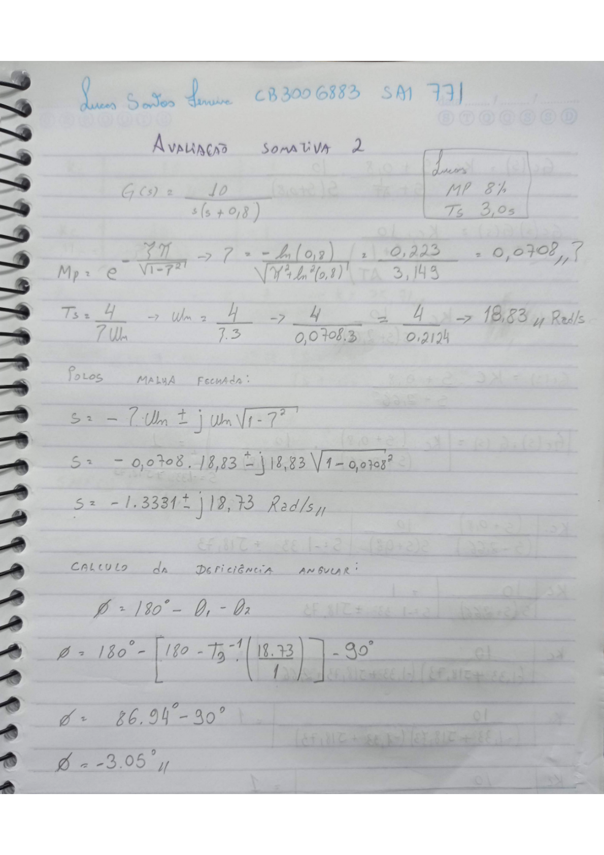<p>CB3006883 SAI 771 SOMATIVA 2 2 10 MP 8% Ts 3,0s 7 e TA 3,149 4 2 4 4 4 18,83 Red/s 7 3.3 0,0708.3 0.2124 POLOS S2 - - V 1-0,0708 - CALCULO ANGULAR - 180°- 18.73</p><p>S AT 10 KC . S Gc(s) (s) Kc 10 1 +J18,73 Kc. 10 + Kc t 10 Kc 10 = (-1,33 + + Kc 10 ) Ke 10 1 +</p><p>data S Kc 10 - Kc 10 0,02821 K2 1 0,028 G(s) 2 35,71. 10 +2.66) . = 357,1 + 2 2 357,1 +357,11</p>