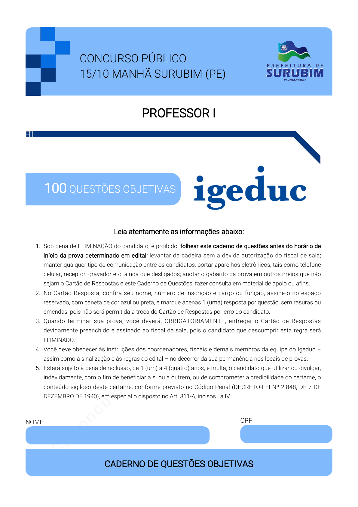 <p>pcimarkpci MDAwMDowMDAwOjAwMDA6MDAwMDowMDAwOmZmZmY6OGFiOTo5NDFm:RnJpLCAyNyBTZXAgMjAyNCAwODo0OToyNCAtMDMwMA==</p><p>www.pciconcursos.com.br</p><p>CONCURSO PÚBLICO</p><p>15/10 MANHÃ SURUBIM (PE)</p><p>PROFESSOR I</p><p>_</p><p>100 QUESTÕES OBJETIVAS</p><p>Leia atentamente as informações abaixo:</p><p>Sob pena de ELIMINAÇÃO do candidato, é proibido: folhear este caderno de questões antes do horário de1.</p><p>início da prova determinado em edital; levantar da cadeira sem a devida autorização do fiscal de sala;</p><p>manter qualquer tipo de comunicação entre os candidatos; portar aparelhos eletrônicos, tais como telefone</p><p>celular, receptor, gravador etc. ainda que desligados; anotar o gabarito da prova em outros meios que não</p><p>sejam o Cartão de Respostas e este Caderno de Questões; fazer consulta em material de apoio ou afins.</p><p>No Cartão Resposta, confira seu nome, número de inscrição e cargo ou função, assine-o no espaço2.</p><p>reservado, com caneta de cor azul ou preta, e marque apenas 1 (uma) resposta por questão, sem rasuras ou</p><p>emendas, pois não será permitida a troca do Cartão de Respostas por erro do candidato.</p><p>Quando terminar sua prova, você deverá, OBRIGATORIAMENTE, entregar o Cartão de Respostas3.</p><p>devidamente preenchido e assinado ao fiscal da sala, pois o candidato que descumprir esta regra será</p><p>ELIMINADO.</p><p>Você deve obedecer às instruções dos coordenadores, fiscais e demais membros da equipe do Igeduc –4.</p><p>assim como à sinalização e às regras do edital – no decorrer da sua permanência nos locais de provas.</p><p>Estará sujeito à pena de reclusão, de 1 (um) a 4 (quatro) anos, e multa, o candidato que utilizar ou divulgar,5.</p><p>indevidamente, com o fim de beneficiar a si ou a outrem, ou de comprometer a credibilidade do certame, o</p><p>conteúdo sigiloso deste certame, conforme previsto no Código Penal (DECRETO-LEI Nº 2.848, DE 7 DE</p><p>DEZEMBRO DE 1940), em especial o disposto no Art. 311-A, incisos I a IV.</p><p>NOME CPF</p><p>_</p><p>CADERNO DE QUESTÕES OBJETIVAS</p><p>pcimarkpci MDAwMDowMDAwOjAwMDA6MDAwMDowMDAwOmZmZmY6OGFiOTo5NDFm:RnJpLCAyNyBTZXAgMjAyNCAwODo0OToyNCAtMDMwMA==</p><p>www.pciconcursos.com.br</p><p>PROFESSOR I - Página 2 de 6</p><p>Leia atentamente as informações abaixo:</p><p>Cada um dos itens desta prova objetiva está vinculado a um comando que o antecede, permitindo, portanto, que o</p><p>candidato marque, no cartão resposta, para cada item: o campo designado com o código V, caso julgue o item CERTO,</p><p>VERDADEIRO ou CORRETO; ou o campo designado com o código F, caso julgue o item ERRADO, FALSO ou INCORRETO.</p><p>Para as devidas marcações, use a Folha de Respostas, único documento válido para a correção da sua prova objetiva, o</p><p>qual deve ser preenchido com cuidado pois marcações incorretas, rasuras ou a falta de marcação anularão a questão.</p><p>Para a análise dos itens (proposições / assertivas), considere seus conhecimentos, o teor do item e, quando aplicável, o</p><p>texto a ele vinculado.</p><p>Nos itens que avaliarem conhecimentos de informática e(ou) tecnologia da informação, a menos que seja explicitamente</p><p>informado o contrário, considere que todos os programas mencionados estão em configuração-padrão e que não há</p><p>restrições de proteção, de funcionamento e de uso em relação aos programas, arquivos, diretórios, recursos e</p><p>equipamentos mencionados.</p><p>Você poderá consultar a cópia digital desta prova, dos gabaritos preliminar e final e acessar o formulário de recursos em</p><p>concursos.igeduc.org.br.</p><p>QUESTÕES DE CONHECIMENTOS GERAIS</p><p>(de 1 a 30)</p><p>Julgue os itens a seguir.</p><p>01. Nas orações subordinadas adverbiais causais, a</p><p>conjunção “porque” introduz a causa da ação.</p><p>02. O acento agudo é utilizado em palavras proparoxítonas</p><p>apenas para indicar a sílaba mais forte.</p><p>03. As orações subordinadas adjetivas explicativas são</p><p>introduzidas por pronomes relativos.</p><p>04. Os vocábulos “semi-intensivo” e “anti-horário” têm hífen</p><p>porque possuem prefixo ou falso prefixo terminado pela</p><p>mesma vogal que inicia a palavra seguinte ou se essa</p><p>palavra seguinte começar com “H”.</p><p>05. A palavra “dói” é acentuada porque possui um hiato.</p><p>06. As palavras “diferir” e “deferir” possuem grafias</p><p>semelhantes, sendo, portanto, termos homófonos.</p><p>07. Substantivos concretos são aqueles que representam</p><p>ideias, conceitos e sentimentos.</p><p>08. Nas sentenças “Disse QUE viria”, “Trouxe o livro QUE pedi”</p><p>e “QUE carro!” , o vocábulo QUE exerce função,</p><p>respectivamente, de conjunção integrante, pronome</p><p>relativo e pronome adjetivo indefinido.</p><p>09. A regra de acentuação das palavras paroxítonas não se</p><p>aplica às palavras estrangeiras incorporadas ao</p><p>português por meio de aportuguesamento.</p><p>10. Os pronomes pessoais do caso reto são usados como</p><p>sujeito da frase.</p><p>11. O volume de um cubo com aresta igual a “x” é dado por</p><p>x³. Ao mesmo tempo, a área da superfície desse cubo é</p><p>dado por 6x².</p><p>12. O Decreto Federal nº 1.171, de 22 de junho de 1994, não</p><p>estabelece punições para o descumprimento de suas</p><p>diretrizes éticas.</p><p>13. A Lei Municipal nº 482/2023 determina critérios</p><p>quantitativos para a racionalização da estrutura</p><p>administrativa do município de Surubim (PE), adaptando</p><p>os órgãos que compõem a administração do município</p><p>às prioridades do governo estadual (Art. 2º da Lei nº</p><p>482/2023).</p><p>14. De acordo com o Art. 29 da Lei Municipal de Surubim nº</p><p>482/2023, compete à Diretoria de Tecnologia da</p><p>Informação gerenciar as atividades da área de</p><p>informática, avaliando e identificando soluç
