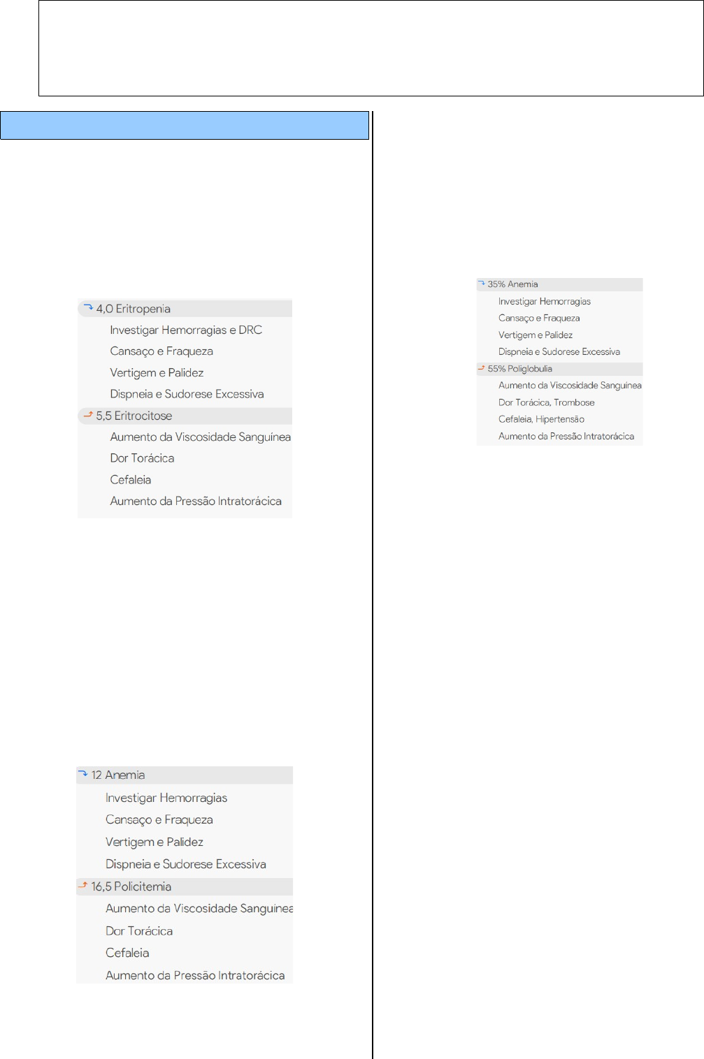 <p>HemogramaExames Laboratoriais</p><p>Hemácias (série vermelha):</p><p>- Célula sanguínea, também conhecida como eritrócito ou glóbulo vermelho, responsável pelo transporte de O2.</p><p>- Seus valores de referência são de 4 a 4,9 para mulheres, e de 4,5 a 5,5 para homens.</p><p>Hemoglobina (série vermelha):</p><p>- Proteína presente nas hemácias, responsável por carregar oxigênio no sangue.</p><p>- Útil no diagnóstico de anemia, devendo ser o primeiro a ser observado.</p><p>- Se 3x, encontra-se o valor do hematócrito.</p><p>- Seus valores de referência são de 12 a 15 para mulheres, e de 13,5 a 16,5 para homens.</p><p>Hematócrito (série vermelha):</p><p>- Porcentagem de volume ocupada pelas hemácias no volume total de sangue (por exemplo, um hematócrito de 40% significa que em 100ml de sangue, 40ml é composto somente de hemácias).</p><p>- Seus valores de referência são de 35 a 45% para mulheres, e de 40 a 55% para homens.</p><p>Basófilos (série branca):</p><p>- Leucócito menos comum no sangue, que é um mediador inflamatório e antimicrobiano, ou seja, indica alergia, histamina e anafilaxia (hipersensibilidade imediata).</p><p>Eosinófilos (série branca):</p><p>- Leucócito capaz de matar parasitas grandes demais para serem fagocitados, ou seja, tem relação com infecção helmíntica e parasitoses.</p><p>- Também possui relação em processos alérgicos.</p><p>Neutrófilos (série branca):</p><p>- Leucócito mais comum no sangue, que, geralmente é o primeiro a responder a um processo infeccioso bacteriano agudo. Sua principal função é a fagocitose.</p><p>Linfócitos (série branca):</p><p>- São células de defesa, ou célula exterminadora natural. Há 3 tipos:</p><p>· Linfócito B – produz anticorpo e memória imunológica, além de ativar o sistema complemento;</p><p>· Linfócito T – CD4 (auxiliares) participam na coordenação imunológica e CD8 (citotóxicos) agem nos vírus e tumores;</p><p>· Natural Killers (NK) – distinguem células sadias de tumorais ou infectadas por vírus.</p><p>Monócitos (série branca):</p><p>- São os maiores leucócitos, e são especializados em fagocitose. Sustentam a sua atividade por mais tempo, migram para o tecido, tornando-se macrófago tecidual, orquestram a resposta imunológica e possuem versatilidade imunológica, ou seja, estão onde os neutrófilos não estão.</p><p>- Seu aumento pode estar relacionado à vigência de infecções como tuberculose, sífilis, leucemias e doenças autoimunes.</p><p>Lipidograma</p><p>- Conjunto de exames laboratoriais usado para analisar possíveis irregularidades nos lipídios (moléculas de gorduras encontradas no sangue).</p><p>- São fatores de risco para doenças cardiovasculares.</p><p>Colesterol Total:</p><p>- É a soma do HDL, LDL e do VLDL, sendo que ter um colesterol total alto representa um risco elevado para doenças cardiovasculares.</p><p>- 140 mg/dl, sendo a taxa aceitável entre 35 e 40 mg/dl.</p><p>Triglicerídeos:</p><p>- 3 moléculas de glicose associadas ao lipídeo.</p><p>- Principal molécula de gordura que circula pelo corpo.</p><p>-</p>