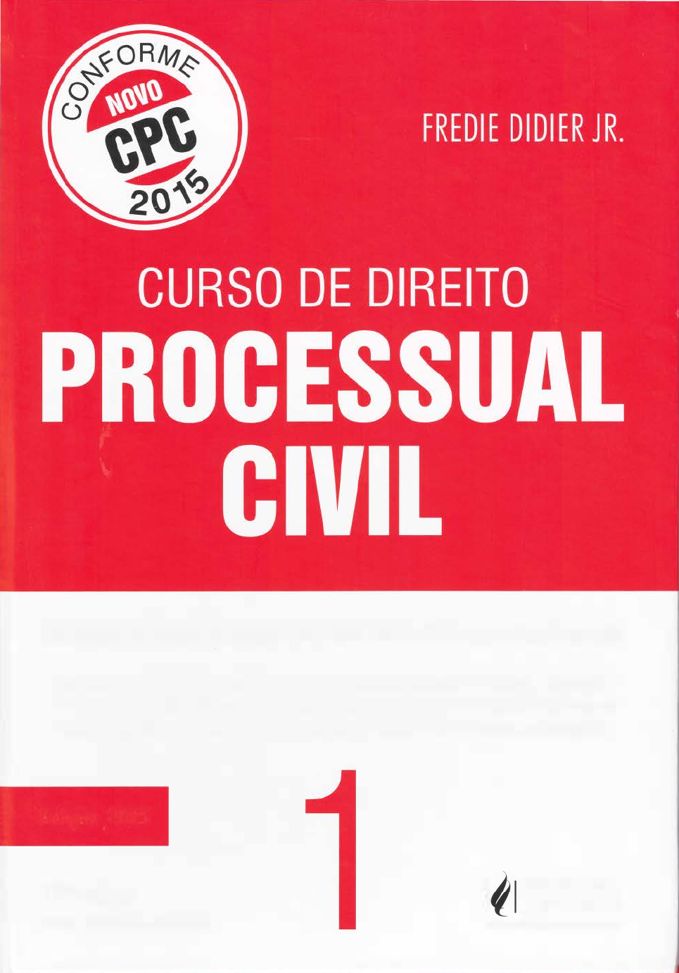 <p>Introdução ao Direito Processual Civil, Parte Geral e Processo de Conhecimento</p><p>Conforme o Novo CPC, o Provimento n° 37/2014 (Conselho Nacional de Justiça), a Resolução</p><p>n° 118/2014 (Conselho Nacional do Ministério Público) e as Leis nos 13.015/2014 (Recursos de</p><p>Revista Repetitivos), 13.043/2014, 13.058/2014 e 13.089/2015 (Estatuto da Metrópole)</p><p>Edi�ão 201 S</p><p>17° edi�ão</p><p>revista, ampliada e atualizada</p><p>I )11 EDITORA</p><p>f fo.sPODIVM</p><p>www.editorajuspodivm.com.br</p><p>INTRODUÇÃO AO DIREITO PROCESSUAL CIVIL,</p><p>PARTE GERAL E PROCESSO DE CONHECIMENTO</p><p>Fredie Didier jr.</p><p>Professor-associado da Faculdade de Direito da Universidade Federal da Bahia (graduação,</p><p>mestrado e doutorado). Coordenador do curso de graduação da Faculdade Baiana de Direito,</p><p>Membro da Associação Internacional de Direito Processual (IAPL), do Instituto lberoamericano</p><p>de Direito Processual, do Instituto Brasileiro de Direito Processual e da Associação Norte e Nordeste</p><p>de Professores de Processo. Mestre (UFBA), Doutor (PUC/SP), Livre-docente (USP)</p><p>e Pós-doutorado (Universidade de Lisboa). Advogado e consultor jurídico. www.fred ied id ie r.com.br</p><p>INTRODUÇÃO AO DIREITO PROCESSUAL CIVIL,</p><p>PARTE GERAL E PROCESSO DE CONHECIMENTO</p><p>17a edição</p><p>Conforme o Novo CPC, o Provimento no 37/2014 (Conselho Nacional de justiça),</p><p>a Resolução no 118/2014 (Conselho Nacional do Ministério Público) e as Leis</p><p>nos 13.015/2014 (Recursos de Revista Repetitivos), 13.043/2014, 13.058/2014</p><p>e 13.089/2015 (Estatuto da Metrópole)</p><p>2015</p><p>I JJI EDITORA f fosPODIVM</p><p>www.editorajuspodivm.com.br</p><p>EDITORA</p><p>JUsPODIVM</p><p>www.editorajuspodivm.com.br</p><p>Rua Mato Grosso, 175- Pituba, CEP: 41830-151 - Salvador- Bahia</p><p>Tel: (71) 3363-8617 I Fax: (71) 3363-5050 • E-mail: fale@editorajuspodivm.com.br</p><p>Copyright: Edições JusPODIVM</p><p>Conselho Editorial: Dirley da Cunha Jr., Leonardo de Medeiros Garcia, Fredie Didier Jr., José Henrique Mouta,</p><p>José Marcelo Vigliar, Marcos Ehrhardt Júnior, Nestor Távora, Robério Nunes Filho, Roberval Rocha Ferreira Filho,</p><p>Rodolfo Pamplona Filho, Rodrigo Reis Mazzei e Rogério Sanches Cunha.</p><p>Capa: Rene Bueno e Daniela Jardim (www.buenojardim.com.br)</p><p>Diagramação: Maitê Coelho</p><p>D556</p><p>Didier Jr., Fredie</p><p>Curso de direito processual civil: introdução ao direito processual</p><p>civil, parte geral e processo de conhecimento I Fredie Didier Jr. -</p><p>17. ed. - Salvador: Ed. Jus Podivm, 2015.</p><p>v. I.</p><p>Inclui bibliografia.</p><p>ISBN: 978-85-442-0353-8</p><p>I. Direito processual - Brasil. 2. Processo civil - Brasil.</p><p>3. Jurisdição. 4. Competência (Autoridade legal). 5. Conciliação</p><p>(Processo civil). 6. Preclusão (Direito processual). 7. Litisconsórcio.</p><p>8. Extinção do processo. 9. Suspensão do processo. I. Título.</p><p>CDD: 34 7.81053</p><p>Todos os direitos desta edição reservados à Edições ./usPODIVM.</p><p>É terminantemente proibida a reprodução total ou parcial desta obra, por qualquer meio ou processo, sem a expressa autorização</p><p>do autor e da Edições ./usPODJVM. A violação dos direitos autorais caracteriza crime descrito na legislação em vigor, sem</p><p>prejuízo das sanções civis cabíveis.</p><p>A josé Joaquim Calmon de Passos.</p><p>5</p><p>Sumário</p><p>Nota do autor à 1 7• edição. . . . . . . . . . . . . . . . . . . . . . . . . . . . . . . . . . . . . . . . . . . . . . . . . . . . . . . . . . . . . . . . . . . . . . . . . . . . . . . . . . . . . . . . . . . . . . . . . . . . . . . . . . . . . . . 21</p><p>Prefácio . . . . . . . . . . . . . . . . . . . . . . . . . . . . . . . . . . . . . . . . . . . . . . .... . . . . . . . . . . . . . . . . . . . . . . . . . . . . . . . . . . . . . . . . . . . . . . . . . . . . . . . . . . . . . . . . . . . . . . . . . . . . . . . . . . . . . . . . . . 25</p><p>capítulo 1 .,. Introdução ao Direito Processual Civil................................................... 29</p><p>1 . I nt rodução . . . . . . . . . . . . . . . . . . . . . . . . . . . . . . . . . . . . . . . . . . . . . . . . . . . . . . . . . . . . . . . . . . . . . . . . . . . . . . . . . . . . . . . . . . . . . . . . . . . . . . . . . ... . . . . . .... . . . . . . . . . . . . 29</p><p>2. Conceito de processo. . . . . . . . . . . . . . . . . . . . . . . . . . . . . . . . . . . . . . . . . . . . . . . . . . . . . . . . . . . . . . . . . . . . . . . . . . . . . . . . . . . . . . . . . . . . . . . . . . . . . . . . . . . . . . . . . 30</p><p>3 . Teoria Geral do Processo, Ciência do Direito Processual Civil e Di reito Processual Civil . . . . . . . . . . . . . 34</p><p>4. Processo e di reito material . Instrumental idade do processo.</p><p>Relação circu lar entre o direito material e o p rocesso . . . . . . . . . . . . . . . . . . . . . . . . . . . . . . . . . . . . . . . . . . . . . . . . . . . . . . . . . . . . . . . 37</p><p>5 . Algumas características do pensamento j u rídico contemporâneo . . . . . . . . . . . . . . . . . . .. . . . . . . . . . . . . . . . . . . . . . . . . . 39</p><p>6 . Neoconstitucionalismo, neoprocessualismo ou formalismo valorativo.</p><p>A atual fase metodológica da ciência do processo . . . . . . . . . . . . . . . . . . . . . . . . . . . . . . . . . . . . . . . . . .. . . . . . . . . . . . . . . . . . . . . . . . . . 42</p><p>7. A ciência do p rocesso e a nova metodologia j u rídica . . . . . . . . . . . . . . . . ... . . . . . . . . . . . . . . . . . . . . . . . . . . . . . . . . . . . . . . . . . . . . . 46</p><p>7 . 1 . Constituição e p rocesso. o art. 1 ° do CPC . . . . . . . . . . . . . . . . . . . . . . . . . ... . . . . . . . . . . . . . . . . . . . . . . . . . . . . . . . . . . . . . . . .. . . . . 46</p><p>7 .2 . Princípios processuais . . . . . . . . . . . . . 