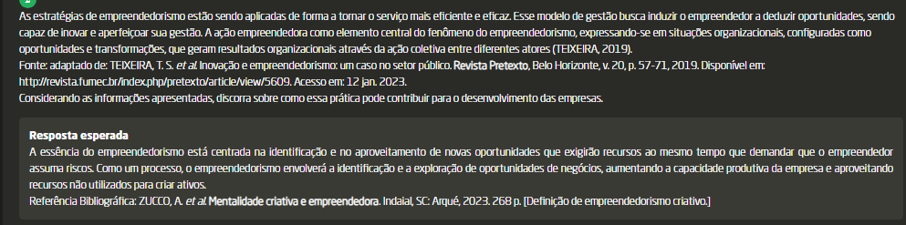 <p>As estratégias de empreendedorismo estão sendo aplicadas de forma a tornar serviço mais eficiente e Esse modelo de gestão busca empreendedor a deduzir oportunidades, sendo capaz de inovar e aperfeiçoar sua gestão. A ação empreendedora como elemento central do fenômeno do empreendedorismo, expressando-se em situações organizacionais, configuradas como oportunidades e transformações, que geram resultados organizacionais através da ação coletiva entre diferentes atores 2019). Fonte: adaptado de: TEIXEIRA, T.S. et Inovação e um caso no setor público Revista Belo Horizonte, V. 20, p. 57-71, 2019. Disponível em: http://revista Acesso em 12 jan 2023. Considerando as informações apresentadas discorra sobre como essa prática pode contribuir para desenvolvimento das empresas. Resposta esperada A essência do empreendedorismo está centrada na identificação e no aproveitamento de novas oportunidades que exigirão recursos ao mesmo tempo que demandar que empreendedor assuma Como um empreendedorismo envolverá a identificação e a exploração de oportunidades de negócios, aumentando a capacidade produtiva da empresa e aproveitando recursos não utilizados para criar ativos. Referência ZUCCO, et Mentalidade criativa e empreendedora Indaial SC Arqué, 2023. 268 p. [Definição de empreendedorismo criativo.]</p>