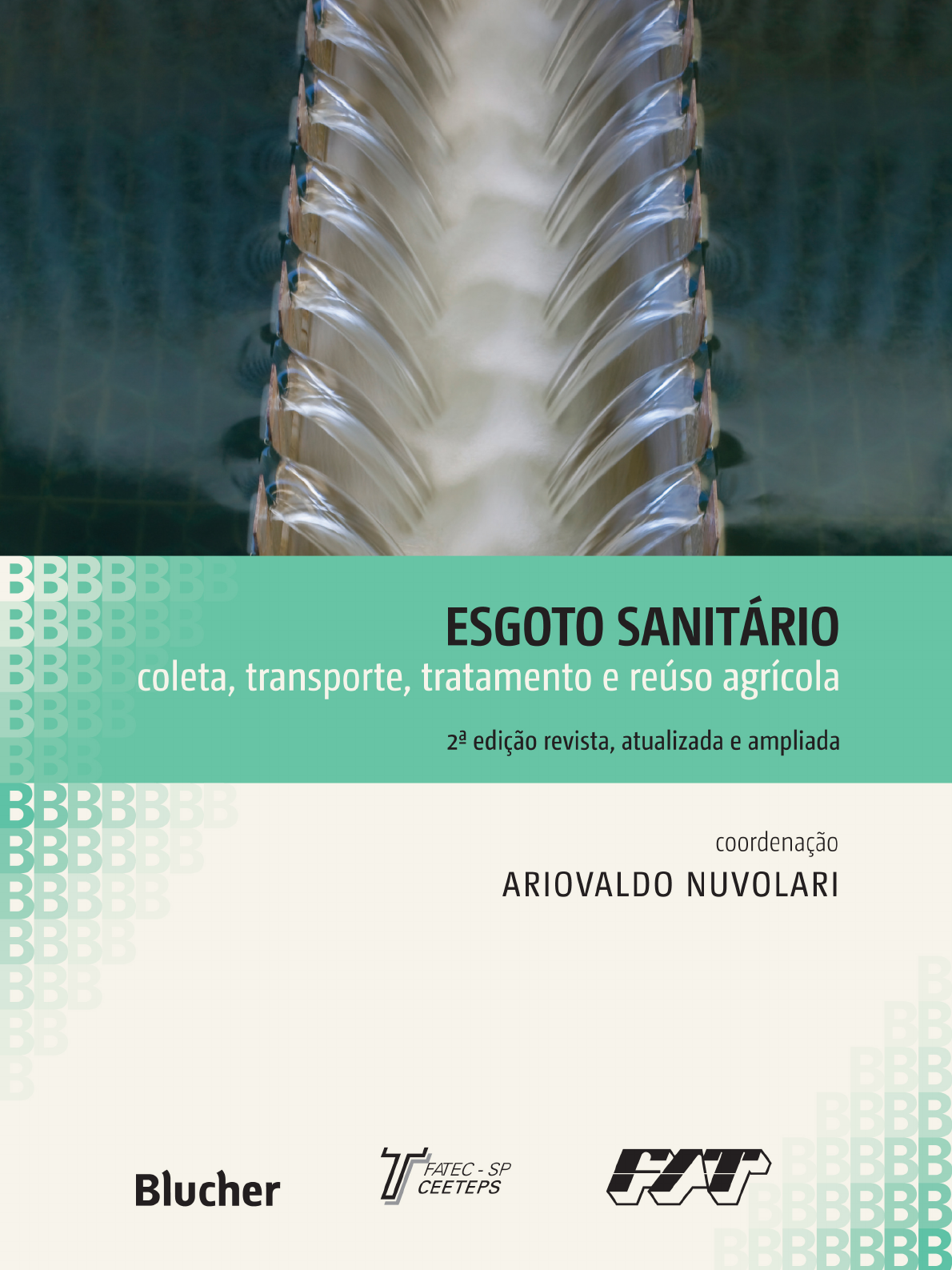 <p>1Conteúdo</p><p>ESGOTO</p><p>SANITÁRIO</p><p>COLETA</p><p>TRANSPORTE</p><p>TRATAMENTO</p><p>E REÚSO AGRÍCOLA</p><p>2 Conteúdo</p><p>3Conteúdo</p><p>ESGOTO</p><p>SANITÁRIO</p><p>COLETA</p><p>TRANSPORTE</p><p>TRATAMENTO</p><p>E REÚSO AGRÍCOLA</p><p>2.ª edição revista, atualizada e ampliada</p><p>Coordenação: ARIOVALDO NUVOLARI</p><p>Coautores: ALEXANDRE MARTINELLI</p><p>ARIOVALDO NUVOLARI</p><p>DIRCEU D’ALKMIN TELLES</p><p>JOSÉ TARCÍSIO RIBEIRO</p><p>NELSON JUNZO MIYASHITA</p><p>ROBERTA BAPTISTA RODRIGUES</p><p>ROBERTO DE ARAUJO</p><p>FATEC - SP</p><p>CEETEPS</p><p>Rua Pedroso Alvarenga, 1245, 4º andar</p><p>04531-012 – São Paulo – SP – Brasil</p><p>Tel 55 11 3078-5366</p><p>contato@blucher.com.br</p><p>www.blucher.com.br</p><p>Segundo Novo Acordo Ortográfico, conforme 5. ed.</p><p>do Vocabulário Ortográfico da Língua Portuguesa,</p><p>Academia Brasileira de Letras, março de 2009.</p><p>É proibida a reprodução total ou parcial por quaisquer</p><p>meios, sem autorização escrita da Editora.</p><p>Todos os direitos reservados pela Editora Edgard Blücher Ltda.</p><p>FICHA CATALOGRÁFICA</p><p>Esgoto sanitário: coleta, transporte, tratamento e reúso</p><p>agrícola / coordenação Ariovaldo Nuvolari – 2ª ed. rev.</p><p>atualizada e ampl. – São Paulo: Blucher, 2011.</p><p>Vários autores</p><p>Bibliografia.</p><p>ISBN 978-85-212-0568-5</p><p>1. Engenharia sanitária 2. Esgotos sanitários</p><p>I. Nuvolari, Ariovaldo.</p><p>10.11549 CDD-628.3</p><p>Índices para catálogo sistemático:</p><p>1. Esgotos sanitários: Engenharia sanitária 628.3</p><p>Esgoto Sanitário – coleta, transporte,</p><p>tratamento e reúso agrícola</p><p>© 2011 Alexandre Martinelli</p><p>Ariovaldo Nuvolari</p><p>Dirceu D’Alkmin Telles</p><p>José Tarcísio Ribeiro</p><p>Nelson Junzo Miyashita</p><p>Roberta Baptista Rodrigues</p><p>Roberto de Araujo</p><p>1ª reimpressão – 2012</p><p>Editora Edgard Blücher Ltda.</p><p>5Conteúdo</p><p>AUTORES</p><p>ALEXANDRE MARTINELLI</p><p>Biólogo (UNESP), Mestre em Biologia Celular e Molecular (UNESP), ex-</p><p>professor da graduação e professor da pós-graduação (FATEC-SP), ex-</p><p>funcionário do DAIA-SMA-SP. Atualmente atua em consultoria ambiental.</p><p>E-mail: am.martinelli@gmail.com</p><p>ARIOVALDO NUVOLARI</p><p>Tecnólogo (FATEC-SP), doutor em Saneamento (FEC-UNICAMP), pro-</p><p>fessor da graduação e da pós-graduação (FATEC-SP), com atuação em</p><p>engenharia civil em empresas mistas e privadas: THEMAG Engenharia</p><p>Ltda., Paulo Abib Engenharia S/A., SEMASA e PETROBRAS.</p><p>E-mail: nuvolari@fatecsp.br</p><p>DIRCEU D’ALKMIN TELLES</p><p>Engenheiro civil (POLI-USP), doutor em Engenharia Hidráulica (POLI-</p><p>USP), ex-professor da graduação e professor da pós-graduação (FATEC-</p><p>SP), professor convidado da pós-graduação (POLI-USP). Foi presidente</p><p>da ABID, Diretor da FATEC-SP, membro da ABNT, com maior vivência em</p><p>Recursos Hídricos no DAEE-SP, tendo prestado consultoria para diversas</p><p>empresas.</p><p>E-mail: dirceu.telles@fatgestao.org.br</p><p>JOSÉ TARCÍSIO RIBEIRO (in memorian)</p><p>Tecnólogo (FATEC-SP), mestre em saneamento (FEC-UNICAMP), foi</p><p>professor da graduação e da pós-graduação (FATEC-SP), com maior</p><p>vivência em obras de saneamento na SABESP.</p><p>NELSON JUNZO MIYASHITA</p><p>Engenheiro civil (POLI-USP) e de Segurança do Trabalho (MACKENZIE),</p><p>ex-professor (FATEC-SP), com maior vivência em gerenciamento de pro-</p><p>jetos (THEMAG Engenharia).</p><p>E-mail: nelson.junzo@gmail.com</p><p>ROBERTA BAPTISTA RODRIGUES</p><p>Tecnóloga (FATEC-SP), doutora em Recursos Hídricos (POLI-USP), di-</p><p>retora da empresa RB Recursos Hídricos.</p><p>E-mail: roberta@rbrecursoshidricos.com</p><p>ROBERTO DE ARAUJO (in memorian)</p><p>Engenheiro civil (Mackenzie), mestre em Saneamento (POLI-USP),</p><p>especialista em Saúde Pública (FSP-USP), foi professor da graduação</p><p>(FATEC-SP), membro da ABNT, com maior vivência em projetos na área</p><p>de saneamento (SABESP).</p><p>6 Conteúdo</p><p>7Conteúdo</p><p>PREFÁCIO</p><p>DA 2ª EDIÇÃO</p><p>Decorridos 7 anos da publicação da 1ª edição deste livro, os seus autores</p><p>verificaram a necessidade de atualização. Durante os trabalhos, infelizmente,</p><p>também foram detectadas algumas incorreções, devidamente corrigidas nesta</p><p>2ª edição. Aproveitou-se a oportunidade para incluir os assuntos mais recen-</p><p>tes, relacionados, principalmente, às novas técnicas de tratamento de esgoto</p><p>surgidas nos últimos anos.</p><p>As principais mudanças em relação à 1ª edição ocorreram nos seguintes</p><p>capítulos:</p><p>• Proêmio: correções, atualizações e inclusões de dados mais recentes;</p><p>• Capítulo 1: inclusão de uma tabela de conversão de unidades;</p><p>• Capítulo 5: o item 5.1 foi totalmente reescrito;</p><p>• Capítulo 7: foram feitas correções, atualizações, principalmente relacio-</p><p>nadas com a substituição da Resolução CONAMA 20/1986 pela Resolução</p><p>CONAMA 357/2005;</p><p>• Capítulo 8: foi totalmente reescrito;</p><p>• Capítulo 9: foram feitas correções, atualizações e inclusão do item 9.10</p><p>– Outras técnicas de tratamento mais recentes;</p><p>• Capítulo 11: correções e atualizações;</p><p>• Referências bibliográficas: inclusões.</p><p>Os autores agradecem à Editora Blucher pela pronta acolhida da proposta</p><p>desta 2ª edição, e a coordenação agradece o empenho dos autores na exe-</p><p>cução do trabalho.</p><p>Prof. Dr. ARIOVALDO NUVOLARI</p><p>Coordenador</p><p>8 Conteúdo</p><p>9Conteúdo</p><p>PREFÁCIO</p><p>DA 1ª EDIÇÃO</p><p>Este livro Esgoto sanitário: coleta, transporte, tratamento e reúso agrí-</p><p>cola é publicado em momento oportuno: o governo e a sociedade brasileira</p><p>estão empenhados em melhorar a qualidade de vida dos cidadãos. Tal objetivo</