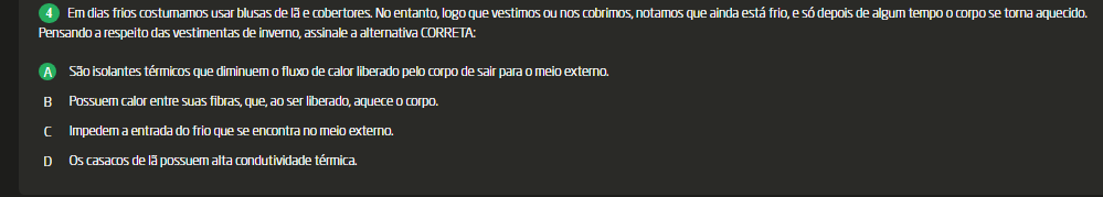 <p>4 Em dias frios costumamos usar blusas de la e cobertores No entanto, logo que vestimos ou nos cobrimos, notamos que ainda está frio, e depois de algum tempo corpo se torna aquecido. Pensando a respeito das vestimentas de inverno, assinale a alternativa CORRETA: São isolantes térmicos que diminuem fluxo de calor liberado pelo corpo de sair para meio externo Possuem calor entre suas fibras, que, ao ser liberado, aquece corpo. C Impedem a entrada do frio que se encontra no meio externo. D Os casacos de la possuem alta condutividade</p>