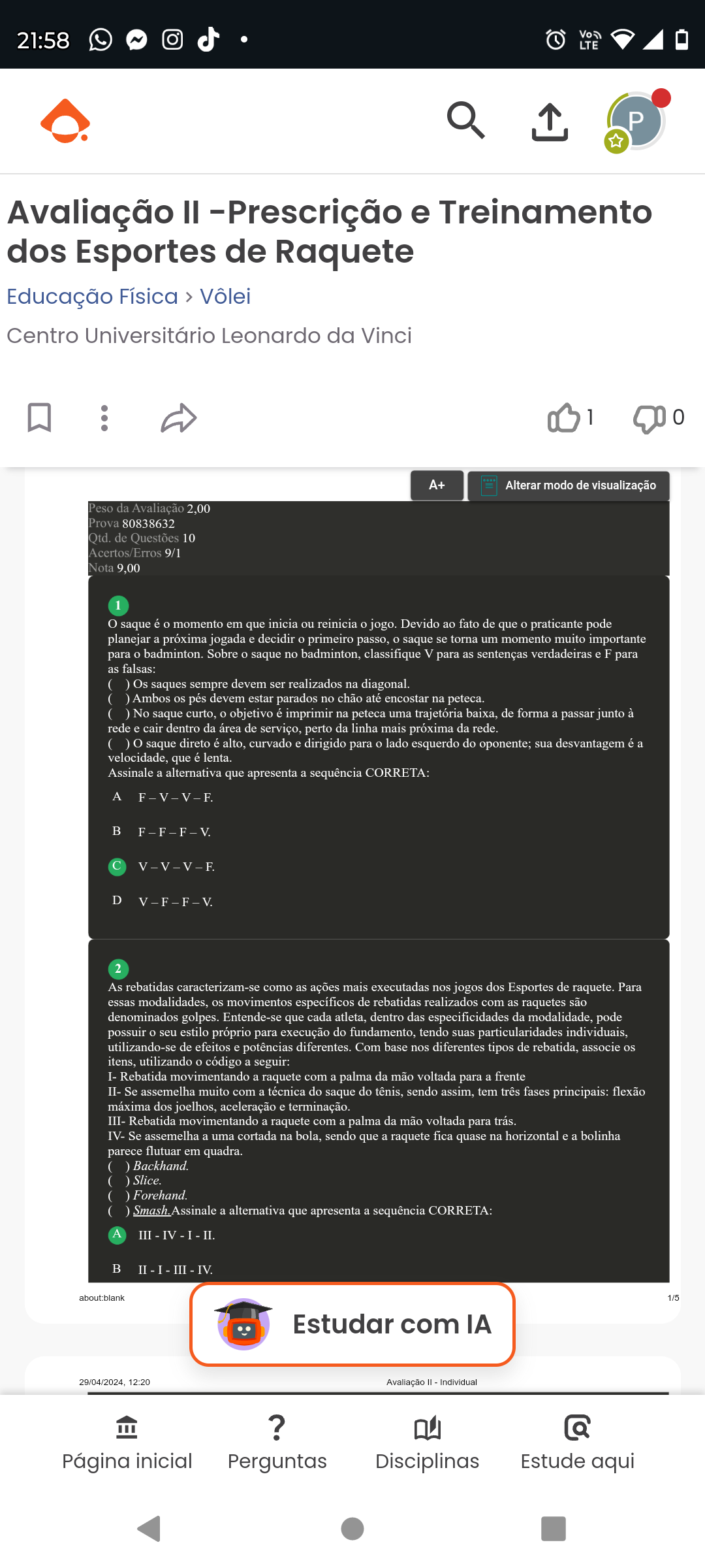 <p>21:58 LTE P Avaliação - -Prescrição e Treinamento dos Esportes de Raquete Educação Física > Vôlei Centro Universitário Leonardo da Vinci 0 A+ Alterar modo de visualização Peso da Avaliação 2,00 Prova 80838632 Otd. de Questões 10 Acertos/Erros 9/1 Nota 9,00 1 O saque é momento em que inicia ou reinicia jogo. Devido ao fato de que praticante pode planejar a próxima jogada e decidir primeiro passo, saque se torna um momento muito importante para badminton. Sobre saque no badminton, classifique V para as sentenças verdadeiras e F para as falsas: ( ) Os saques sempre devem ser realizados na diagonal. ( ) Ambos os pés devem estar parados no chão até encostar na peteca. ( ) No saque curto, objetivo é imprimir na peteca uma trajetória baixa, de forma a passar junto à rede e cair dentro da área de serviço, perto da linha mais próxima da rede. ( ) O saque direto é alto, curvado e dirigido para lado esquerdo do oponente; sua desvantagem é a velocidade. que é lenta. Assinale a alternativa que apresenta a sequência CORRETA: A B C D 2 As rebatidas caracterizam-se como as ações mais executadas nos jogos dos Esportes de raquete. Para essas modalidades, os movimentos específicos de rebatidas realizados com as raquetes são denominados golpes. Entende-se que cada atleta. dentro das especificidades da modalidade, pode possuir seu estilo próprio para execução do fundamento, tendo suas particularidades individuais, utilizando-se de efeitos e potências diferentes. Com base nos diferentes tipos de rebatida, associe os itens, utilizando código a seguir: I- Rebatida movimentando a raquete com a palma da mão voltada para a frente II- Se assemelha muito com a técnica do saque do tênis, sendo assim, tem três fases principais: flexão máxima dos joelhos, aceleração e III- Rebatida movimentando a raquete com a palma da mão voltada para IV- Se assemelha a uma cortada na bola, sendo que a raquete fica quase na horizontal e a bolinha parece flutuar em quadra. ( ) Backhand. ( Slice. ( ) Forehand ( ) Smash. Assinale a alternativa que apresenta a sequência CORRETA: A III IV II. B II I III IV. about:blank 1/5 Estudar com IA 12:20 Avaliação Individual ? Q Página inicial Perguntas Disciplinas Estude aqui</p>