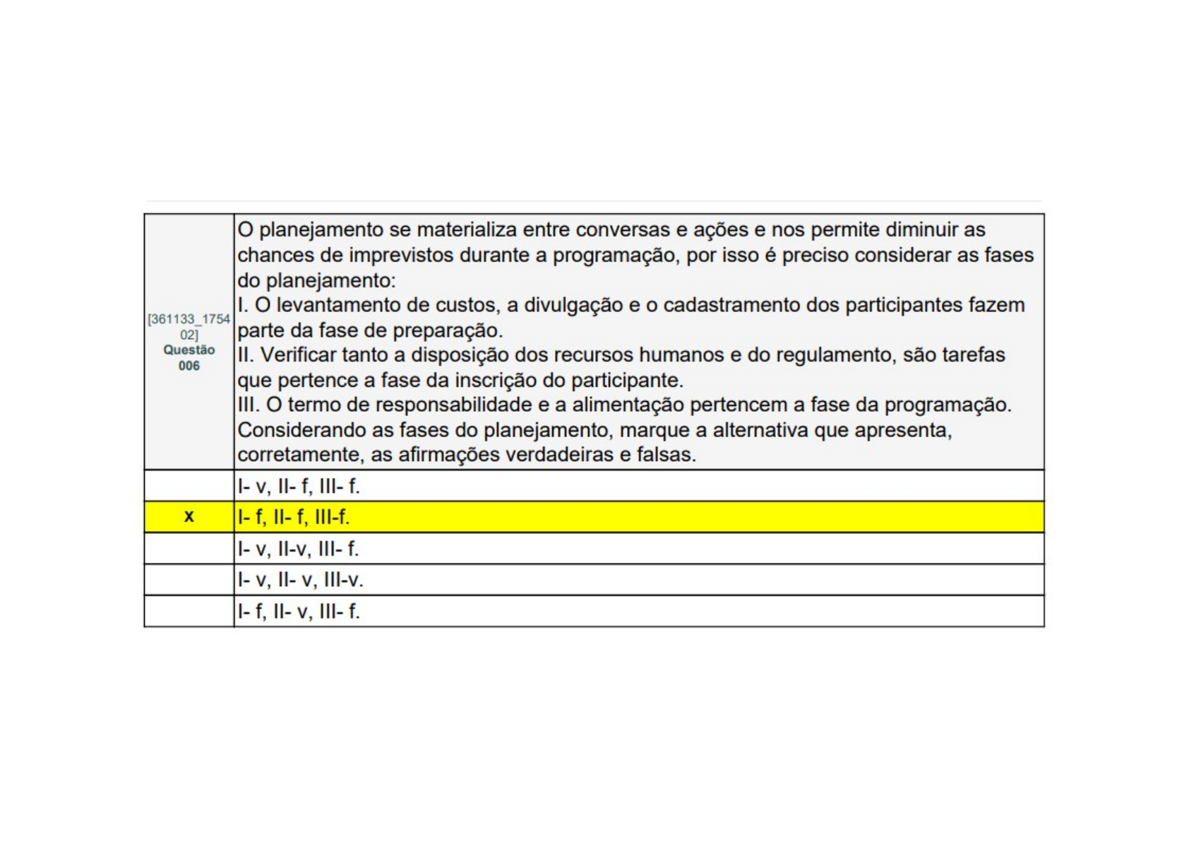 <p>planejamento se materializa entre conversas e ações e nos permite diminuir as chances de imprevistos durante a programação, por isso é preciso considerar as fases do planejamento: I. levantamento de custos, a divulgação e o cadastramento dos participantes fazem [361133_1754 02] parte da fase de preparação. Questão II. Verificar tanto a disposição dos recursos humanos e do regulamento, são tarefas 006 que pertence a fase da inscrição do participante. III. O termo de responsabilidade e a alimentação pertencem a fase da programação. Considerando as fases do planejamento, marque a alternativa que apresenta, corretamente, as afirmações verdadeiras e falsas. I- V, f. II- V,</p>