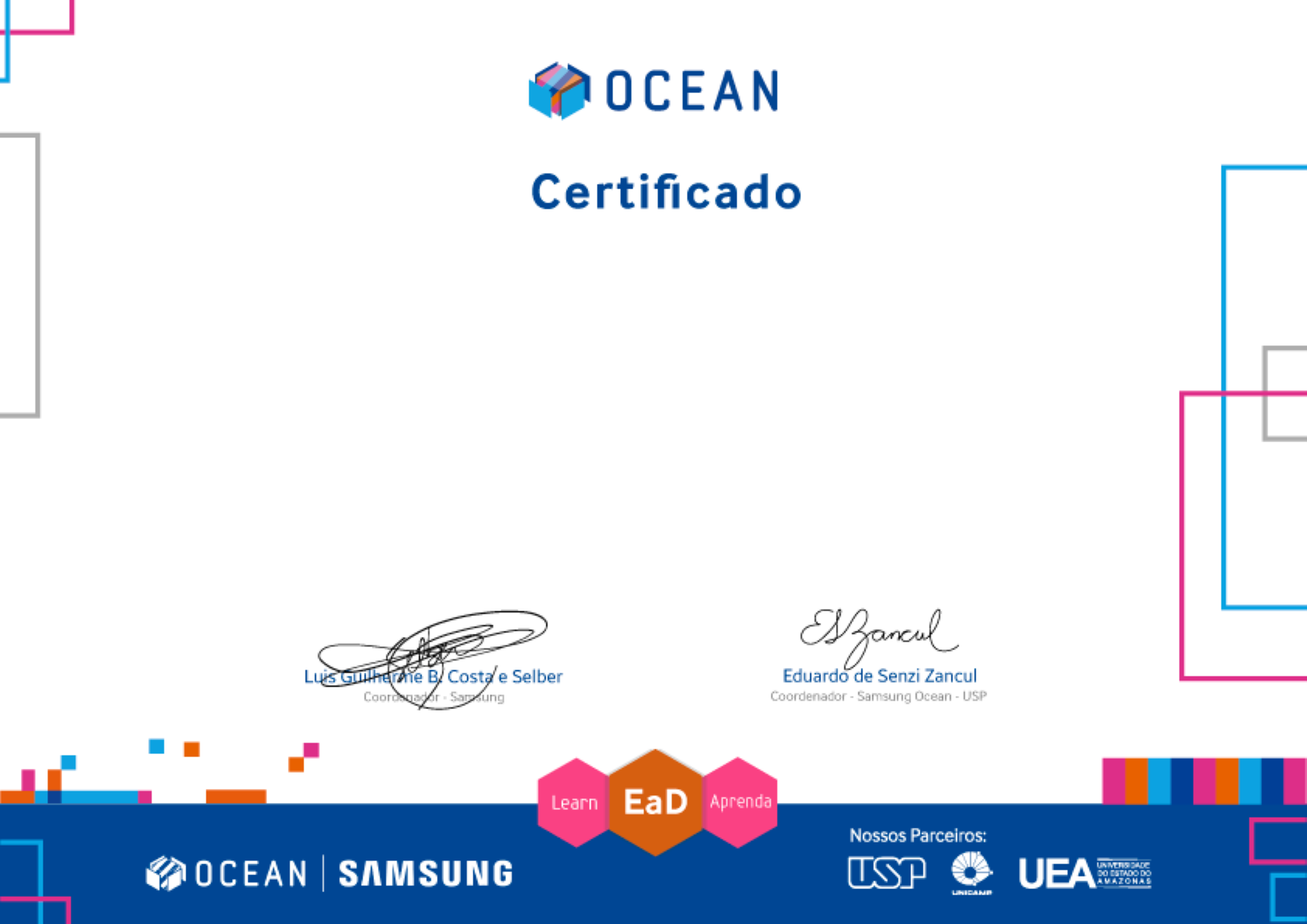 <p>O Samsung Ocean, centro de capacitação em tecnologia</p><p>e de apoio à criação de empresas de base tecnológica, confere a</p><p>Edward Pinto Pimenta Junior</p><p>o presente certificado, referente à sua participação no(a) curso/palestra</p><p>Backend com NodeJs e Express (Parte 1)</p><p>ministrado por Prof. Paulo Salvatore</p><p>em 09/05/2022 com duração total de 03:00 hora(s).</p>