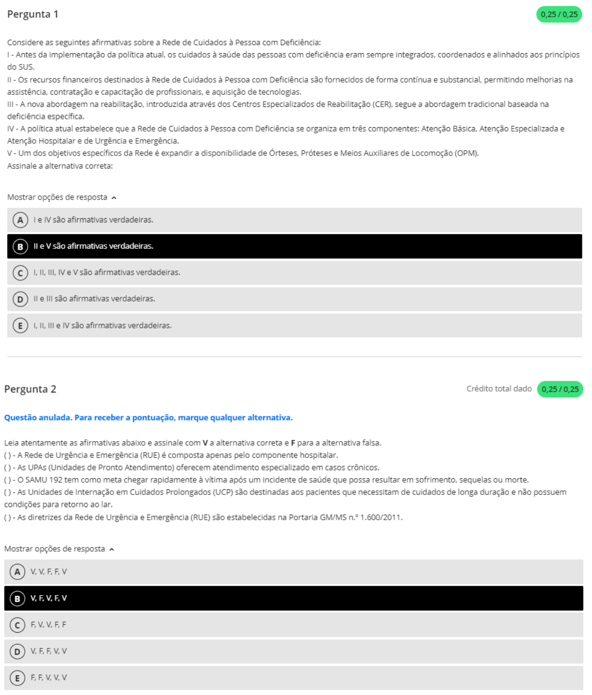 <p>Pergunta 1 Considere as seguintes afirmativas sobre a Rede de Cuidados à Pessoa com Deficiência: Antes da implementação da política atual, os cuidados à saúde das pessoas com deficiência eram sempre integrados, coordenados e alinhados aos princípios do SUS. II Os recursos financeiros destinados à Rede de Cuidados à Pessoa com Deficiência são fornecidos de forma contínua e substancial, permitindo melhorias na assistência, contratação e capacitação de profissionais, e aquisição de tecnologias. III A nova abordagem na reabilitação, introduzida através dos Centros Especializados de Reabilitação (CER), segue a abordagem tradicional baseada na deficiência específica. IV A política atual estabelece que a Rede de Cuidados à Pessoa com Deficiência se organiza em três componentes: Atenção Básica, Atenção Especializada e Atenção Hospitalar e de Urgência e Emergência. V - Um dos objetivos específicos da Rede é expandir a disponibilidade de Órteses, Próteses e Meios Auxiliares de Locomoção (OPM). Assinale a alternativa correta: Mostrar opções de resposta A e IV são afirmativas II e V são afirmativas verdadeiras. I, II, III, IV e V são afirmativas verdadeiras. D e III são afirmativas verdadeiras. E I, II, III e IV são afirmativas verdadeiras. Pergunta 2 Crédito total dado Questão anulada. Para receber a pontuação, marque qualquer alternativa. Leia atentamente as afirmativas abaixo e assinale com V a alternativa correta e F para a alternativa falsa. A Rede de Urgência e Emergência (RUE) é composta apenas pelo componente hospitalar. - As UPAs (Unidades de Pronto Atendimento) oferecem atendimento especializado em casos () - SAMU 192 tem como meta chegar rapidamente à vítima após um incidente de saúde que possa resultar em sofrimento, sequelas ou morte. As Unidades de Internação em Cuidados Prolongados (UCP) são destinadas aos pacientes que necessitam de cuidados de longa duração e não possuem condições para retorno ao lar. - As diretrizes da Rede de Urgência e Emergência (RUE) são estabelecidas na Portaria GM/MS 1.600/2011. Mostrar opções de resposta A C D E</p><p>Pergunta 3 Qual dos seguintes itens é uma característica do Modelo de Atenção às Condições Crônicas (MACC)? Mostrar opções de resposta No primeiro nível do MACC, são realizadas intervenções de prevenção de doenças, direcionadas a indivíduos e subpopulações, com ênfase na A modificação de fatores de risco comportamentais, como alimentação inadequada, sedentarismo, tabagismo, excesso de peso e uso excessivo de álcool. B MACC baseia-se principalmente no modelo de atenção à saúde centrado na doença, priorizando o tratamento curativo sobre a prevenção. No quarto nível do MACC, atende-se a com doenças crônicas estabelecidas, de baixo ou médio risco, ou que apresentam fatores de C risco biopsicológicos. As intervenções no quinto nível do MACC envolvem geralmente o autocuidado apoiado e a atenção clínica fornecida exclusivamente pela atenção D básica. E segundo nível do MACC enfoca intervenções de promoção da saúde para toda a população, incluindo ações intersetoriais. Pergunta 4 0,25/0,25 Assinale a alternativa correta quanto ao componente hospitalar da Rede de Atenção às Urgências e Emergências, mais especificamente a que descreve corretamente as Unidades de Terapia Intensiva Mostrar opções de resposta Possuem tecnologia avançada e são projetadas para cuidar de pacientes em estado crítico, exigindo monitoramento rigoroso e assistência A especializada. B São espaços com equipamentos básicos, principalmente destinados a pacientes com necessidades de reabilitação. C São utilizadas principalmente para procedimentos cirúrgicos de emergência. D São destinadas ao cuidado primário de pacientes com condições de saúde leves e moderadas E Oferecem principalmente cuidados paliativos para pacientes em fase terminal de doenças crônicas.</p>