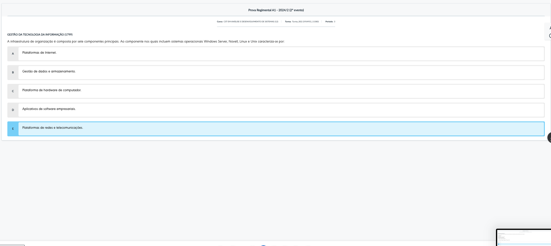 <p>Prova Regimental A1 2024/2 evento) E DESENVOLVIMENTO DE SISTEMAS (12) Turma: Turma Periodo 3 GESTÃO DA TECNOLOGIA DA INFORMAÇÃO (1799) A infrgestrutura de organização é composto por sete componentes principais. Ao componente nos quais incluem sistemas operacionais Windows Server, Novell, Linux e Unix caracteriza-se por: A Plataformas de Internet B Gestão de dados e Plataforma de hardware de computador. D Aplicativos de software E Plataformas de redes e</p>