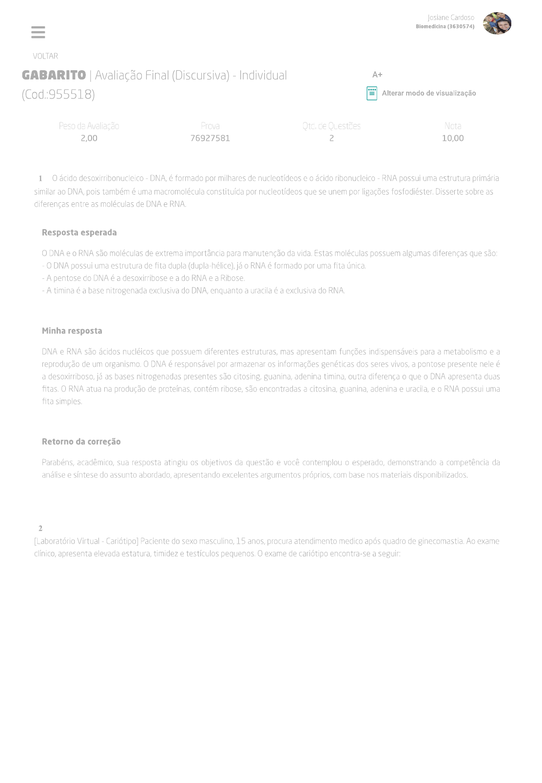<p>Josiane Cardoso Biomedicina (3630574) VOLTAR GABARITO Avaliação Final (Discursiva) Individual A+ (Cod.:955518) Alterar modo de visualização Peso da Avaliação Prova de Questões Nota 2,00 76927581 2 10,00 1 0 ácido desoxirribonucleico DNA, é formado por milhares de nucleotídeos e ácido ribonucleico RNA possui uma estrutura primária similar ao DNA, pois também é uma macromolécula constituída por nucleotídeos que se unem por ligações Disserte sobre as diferenças entre as moléculas de DNA e RNA. Resposta esperada O DNA e RNA são moléculas de extrema importância para manutenção da vida. Estas moléculas possuem algumas diferenças que são: O DNA possui uma estrutura de fita dupla (dupla-hélice), já RNA é formado por uma fita única. A pentose do DNA é a desoxirribose e a do RNA e a A timina é a base nitrogenada exclusiva do DNA, enquanto a uracila é a exclusiva do Minha resposta DNA e RNA são ácidos nucléicos que possuem diferentes estruturas, mas apresentam funções indispensáveis para a metabolismo e a reprodução de um organismo. O DNA é responsável por armazenar informações genéticas dos seres vivos, a pontose presente nele é a desoxirriboso, já as bases nitrogenadas presentes são citosing, guanina, adenina timina, outra diferença que DNA apresenta duas fitas. O RNA atua na produção de proteínas, contém ribose, são encontradas a citosina, guanina, adenina e uracila, e RNA possui uma fita Retorno da correção Parabéns, acadêmico, sua resposta atingiu os objetivos da questão e você contemplou esperado, demonstrando a competência da análise e síntese do assunto abordado, apresentando excelentes argumentos próprios, com base nos materiais disponibilizados. 2 [Laboratório Virtual Cariótipo] Paciente do sexo masculino, 15 anos, procura atendimento medico após quadro de ginecomastia. Ao exame clínico, apresenta elevada estatura, timidez e testículos pequenos. 0 exame de cariótipo encontra-se a seguir:</p><p>Cardoso Biomedicina (3630574) I 2 3 45 XX 6 7 8 9 10 11 12 XX HX 13 14 15 16 17 18 XX 19 20 21 22 De acordo com os dados analisados no laboratório indique cariótipo e provável diagnóstico desse paciente. Resposta esperada O paciente em questão apresenta cariótipo XXY, qual determina a presença da Síndrome de Klinefelter. Minha resposta O cariótipo do paciente provavelmente é Indicando uma trissomia do cromossomo sexual, com dois cromossomos X e um Y caracterizando a síndrome de Essa síndrome está associada à baixa estatura, timidez e testículos pequenos. Retorno da correção Parabéns, acadêmico, sua resposta atingiu os objetivos da questão e você contemplou esperado, demonstrando a competência da análise e síntese do assunto abordado, apresentando excelentes argumentos próprios, com base nos materiais disponibilizados. Imprimir</p>
