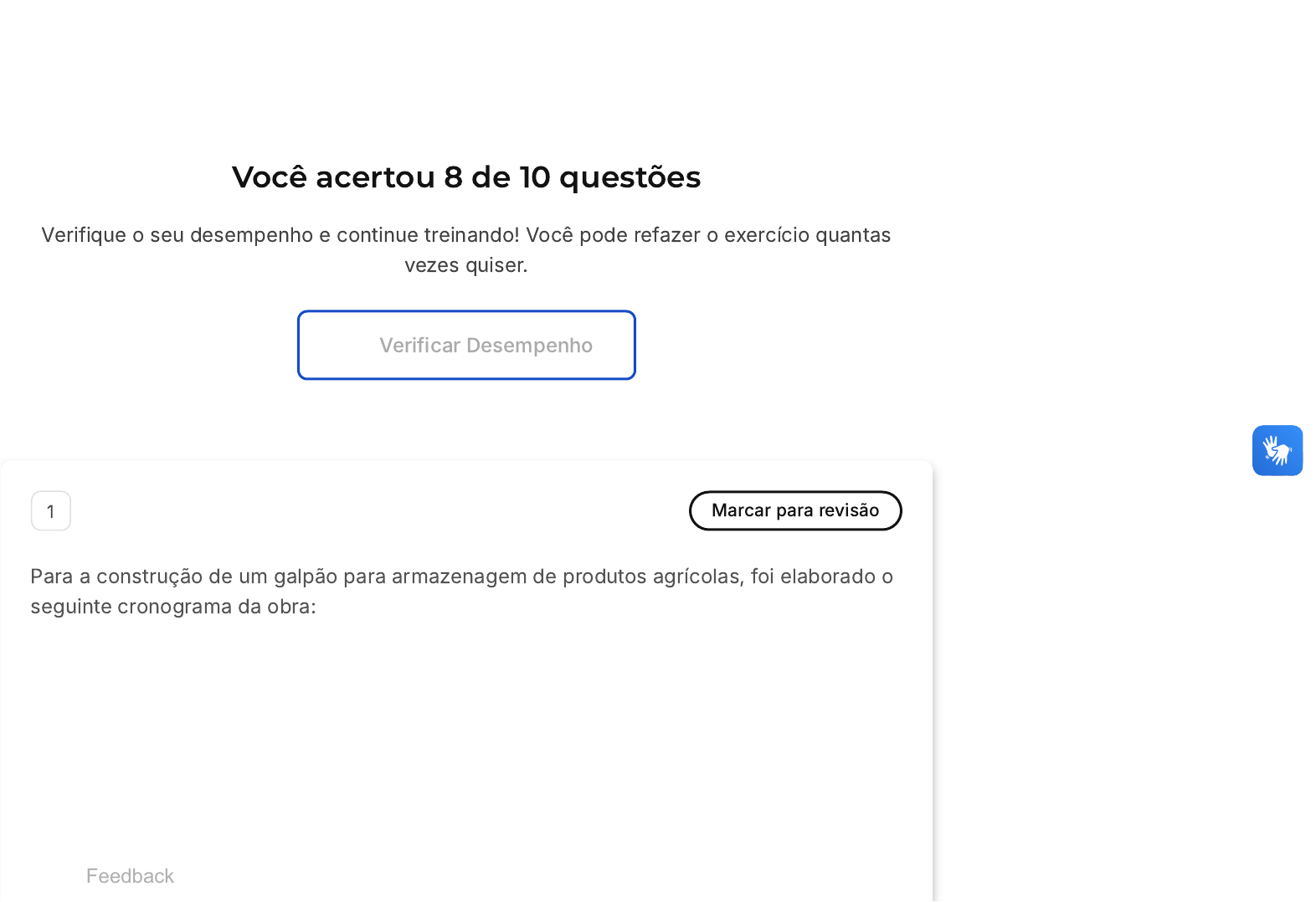 <p>Você acertou 8 de 10 questões</p><p>Verifique o seu desempenho e continue treinando! Você pode refazer o exercício quantas</p><p>vezes quiser.</p><p>Verificar Desempenho</p><p>1 Marcar para revisão</p><p>Para a construção de um galpão para armazenagem de produtos agrícolas, foi elaborado o</p><p>seguinte cronograma da obra:</p><p>Feedback</p><p>A</p><p>B</p><p>C</p><p>No final do terceiro mês o engenheiro civil responsável pelo acompanhamento da obra</p><p>resolveu verificar o seu andamento. O percentual de serviços executados acumulados é:</p><p>59,00 %</p><p>61,52 %</p><p>62,00 %</p><p>D</p><p>E</p><p>68,60 %</p><p>74,00 %</p><p>Resposta incorreta</p><p>Opa! A alternativa correta é a letra B. Confira o gabarito comentado!</p><p>Gabarito Comentado</p><p>A</p><p>B</p><p>C</p><p>D</p><p>E</p><p>2 Marcar para revisão</p><p>Ao coletar os dados de valor agregado para seu projeto, você obtém os seguintes dados:</p><p>PV � $ 1.500.000, EV � $ 1.200.000, AC � $ 1.000.000. Você espera que os fatores de</p><p>variação de custo continuem da mesma forma no futuro. O valor do trabalho restante é de</p><p>$ 1.000.000. Qual deve ser o novo EAC para o projeto?</p><p>$ 2.400.000</p><p>$ 2.233.333</p><p>$ 2.000.000</p><p>$ 1.833.333</p><p>$ 2.200,00</p><p>Resposta correta</p><p>Parabéns, você selecionou a alternativa correta. Confira o gabarito comentado!</p><p>Gabarito Comentado</p><p>A</p><p>B</p><p>Para encontrar o novo EAC �Estimativa no Final do Trabalho), precisamos usar a</p><p>fórmula EAC � BAC/CPI. Primeiro, calculamos o BAC �Orçamento no Final do Trabalho),</p><p>que é a soma do valor ganho �EV) e o valor do trabalho restante, resultando em</p><p>1.200.000 � 1.000.000 � 2.200.000. Em seguida, calculamos o CPI �Índice de</p><p>Desempenho de Custo), que é a divisão do valor ganho �EV) pelo custo real �AC�,</p><p>resultando em 1.200.000/1.000.000 � 1,2. Por fim, aplicamos os valores encontrados</p><p>na fórmula EAC � BAC/CPI, resultando em 2.200.000/1,2 � 1.833.333. Portanto, o novo</p><p>EAC para o projeto é $ 1.833.333.</p><p>3 Marcar para revisão</p><p>Uma atividade que agrega valor é qualquer ação tomada que aumente o benefício de um</p><p>bem ou serviço para um cliente. Uma empresa pode aumentar enormemente sua</p><p>lucratividade reconhecendo quais atividades aumentam o valor e quais não, e eliminando</p><p>as atividades que não agregam valor. Na maioria das organizações, há uma proporção</p><p>muito menor de atividades de valor agregado do que de atividades sem valor agregado.</p><p>Portanto com base a este conceito, o que é uma atividade de valor agregado �VA�?</p><p>Trabalho que é solicitado pela equipe de aplicação.</p><p>Trabalho que deixará a equipe de gestão orgulhosa.</p><p>C</p><p>D</p><p>E</p><p>Trabalho que o cliente está disposto a pagar.</p><p>Trabalho que deve ser concluído imediatamente.</p><p>Trabalho que a equipe está disposta a executar.</p><p>Resposta correta</p><p>Parabéns, você selecionou a alternativa correta. Confira o gabarito comentado!</p><p>Gabarito Comentado</p><p>Uma atividade de valor agregado �VA) é uma atividade que o cliente está disposto a</p><p>pagar. Isso significa que a atividade agrega valor ao produto ou serviço para o cliente.</p><p>4 Marcar para revisão</p><p>O projeto está orçado em $ 1.000.000. Os seguintes valores de valor agregado foram</p><p>derivados. VP � $ 500.000, EV � $ 450.000, AC � $ 550.000. As variações de custo no</p><p>projeto são causadas por fatores pontuais que não são mais eficazes. Qual será a</p><p>estimativa na conclusão do projeto?</p><p>A</p><p>B</p><p>C</p><p>D</p><p>E</p><p>$ 1.000.000</p><p>$ 1.100.000</p><p>$ 900.000</p><p>$ 1.222.222</p><p>$ 954.784</p><p>Resposta correta</p><p>Parabéns, você selecionou a alternativa correta. Confira o gabarito comentado!</p><p>Gabarito Comentado</p><p>Para calcular a Estimativa na Conclusão �EAC) de um projeto, quando a variação de</p><p>custo é causada por um evento único e não se espera que continue, utilizamos a</p><p>fórmula EAC� AC�BAC�EV. Neste caso, AC é o Custo Real, BAC é o Custo Orçado no</p><p>Final e EV é o Valor Agregado.</p><p>A</p><p>B</p><p>C</p><p>D</p><p>E</p><p>Substituindo os valores dados na questão na fórmula, temos: EAC � 550.000 �</p><p>1.000.000 � 450.000. Realizando a operação, obtemos EAC � 1.100.000. Portanto, a</p><p>estimativa na conclusão do projeto será de $ 1.100.000.</p><p>5 Marcar para revisão</p><p>Você realiza uma análise de valor agregado para seu projeto, resultando nos seguintes</p><p>números: EV� 354.000; VP� 454.000; CA� 474.000. Quais resultados estão corretos?</p><p>CV� �120.000; SV� �100.000</p><p>CV� �100.000; SV� �120.000</p><p>CV� �100.000; SV� �120.000</p><p>CV� �120.000; SV� �100.000</p><p>CV� �120.000; SV� �100.000</p><p>Resposta correta</p><p>Parabéns, você selecionou a alternativa correta. Confira o gabarito comentado!</p><p>Gabarito Comentado</p><p>Para encontrar a resposta correta, precisamos calcular o Valor do Custo �CV) e o Valor</p><p>do Agendamento �SV�. O CV é calculado subtraindo o Custo Atual �CA) do Valor Ganho</p><p>�EV�, enquanto o SV é calculado subtraindo o Valor Planejado �VP) do Valor Ganho</p><p>�EV�.</p><p>Portanto, CV � EV � CA � 354.000 � 474.000 = �120.000;</p><p>E SV � EV � PV � 354.000 � 454.000 = �100.000.</p><p>Logo, a alternativa correta é: CV é �120.000 e SV é �100.000.</p><p>6 Marcar para revisão</p><p>Você está gerenciando um projeto de construção. Você completou metade do trabalho do</p><p>projeto. O custo total planejado nesta fase é de $ 1.000. O trabalho real que foi concluído</p><p>nesta fase vale $ 1200. Você já gastou $ 1500 no projeto. Qual é o CPI?</p><p>A</p><p>B</p><p>C</p><p>D</p><p>E</p><p>0,5.</p><p>0,8.</p><p>4.</p><p>1,25.</p><p>0,9.<