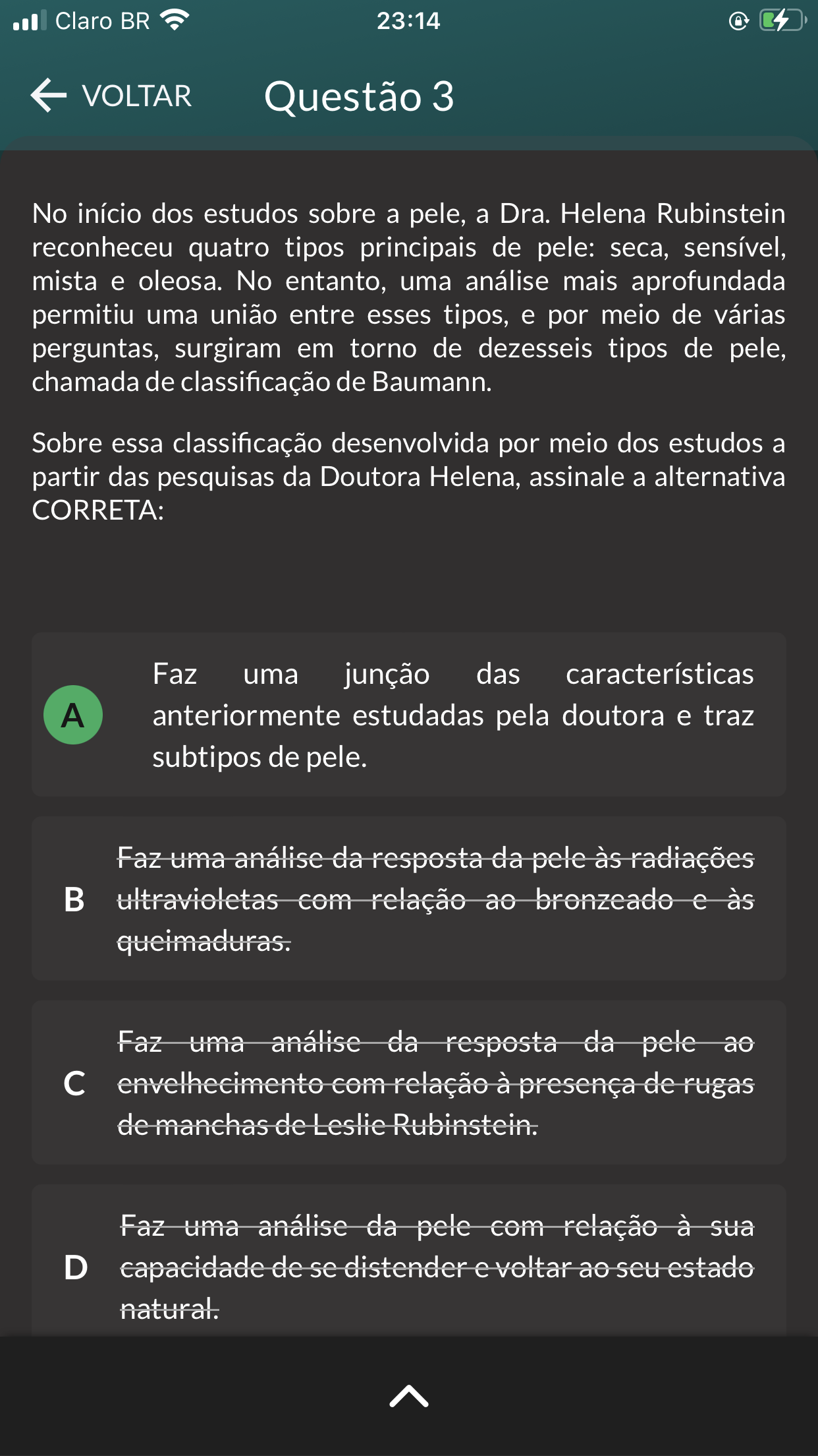 <p>Claro BR 23:14 VOLTAR Questão 3 No início dos estudos sobre a pele, a Dra. Helena Rubinstein reconheceu quatro tipos principais de pele: seca, sensível, mista e oleosa. No entanto, uma análise mais aprofundada permitiu uma união entre esses tipos, e por meio de várias perguntas, surgiram em torno de dezesseis tipos de pele, chamada de classificação de Baumann. Sobre essa classificação desenvolvida por meio dos estudos a partir das pesquisas da Doutora Helena, assinale a alternativa CORRETA: Faz uma junção das características A anteriormente estudadas pela doutora e traz subtipos de pele. Faz uma análise da resposta da pele às radiações ultravioletas com relação ao bronzeado e às queimaduras. Faz uma análise da resposta da pele ao envelhecimento com relação à presença de rugas de manchas de Leslie Rubinstein. Faz uma análise da pele com relação à sua D capacidade de se distender e voltar ao seu estado natural.</p>