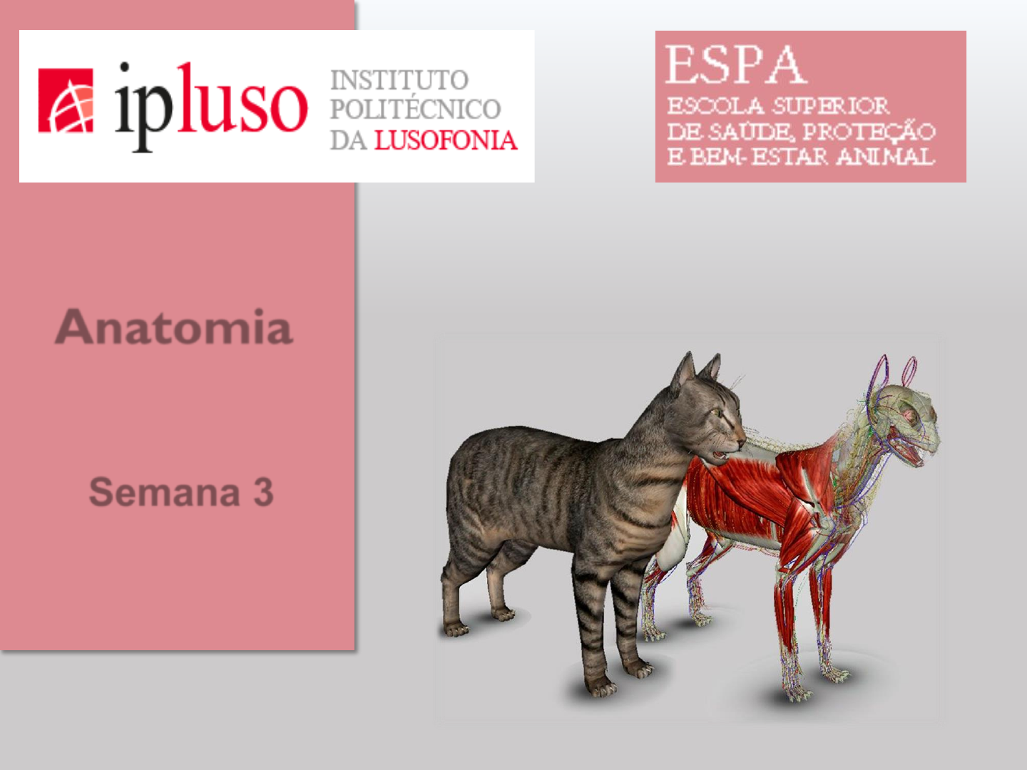 <p>Anatomia</p><p>Semana 3</p><p>Anatomia</p><p>Esqueleto axial</p><p>Cabeça</p><p>Esqueleto da cabeça</p><p>- Comporta e protege o encéfalo, órgãos dos sentidos e porções do aparelho</p><p>respiratório e digestivo</p><p>- Formado por inúmeros ossos que se fundem no animal adulto num estrutura</p><p>única e compacta (exceto a mandíbula e aparelho hioide)</p><p>Esqueleto da cabeça</p><p>• Crânio: ossos ímpares (occipital, interparietal, esfenoide e etmoide)</p><p>• Face: ossos pares (parietal, temporal e frontal, zigomático, lacrimal, maxilar, nasal, incisivo,</p><p>mandibula, palatino, pterigoide, conchas nasais) e ímpar (vómer e aparelho hioide).</p><p>Occipital</p><p>Interparietal</p><p>Parietal Frontal</p><p>Temporal</p><p>Zigomático</p><p>Maxilar</p><p>Lacrimal</p><p>Nasal</p><p>Incisivo</p><p>Mandibula</p><p>Esfenoide, palatino</p><p>Esqueleto da cabeça</p><p>Occipital</p><p>Interparietal</p><p>Parietal Frontal</p><p>Temporal</p><p>Zigomático</p><p>Maxilar</p><p>Lacrimal</p><p>Nasal</p><p>Incisivo</p><p>Mandibula</p><p>Esfenoide, palatino</p><p>Esqueleto da cabeça</p><p>Meato acústico</p><p>externo</p><p>Órbita</p><p>Côndilos occipitais</p><p>Forame magno</p><p>Arco zigomático</p><p>Processo jugular</p><p>Bolha timpânica</p><p>Crista sagital externa</p><p>Forame</p><p>infraorbitário</p><p>Fossa massetérica</p><p>Forames</p><p>mentonianos</p><p>Esqueleto da cabeça</p><p>Dolicocéfalos</p><p>Braquicéfalos</p><p>Mesocéfalos/</p><p>Mesaticéfalos</p><p>Anatomia</p><p>Esqueleto axial</p><p>Coluna vertebral</p><p>• Coluna vertebral</p><p>- conjunto de vértebras desde a cabeça até à cauda</p><p>- aloja a medula espinhal</p><p>- constitui um eixo corporal sólido</p><p>Cervical</p><p>Torácica Lombar Sagrada/Sacro</p><p>Caudal</p><p>Esqueleto axial</p><p>Cervicais</p><p>(C)</p><p>Torácicas</p><p>(T)</p><p>Lombares</p><p>(L)</p><p>Sagradas</p><p>(S)</p><p>Caudais</p><p>(Cd)</p><p>Coelho 7 12 7 4 14-16</p><p>Cão/Gato 7 13 7 3 18-24</p><p>Vaca 7 13 6 5 18-20</p><p>Pequeno</p><p>ruminante</p><p>7 13 6-7 4 12-22</p><p>Porco 7 14-15 6-7 4 20-23</p><p>Cavalo 7 18 6 5 17-21</p><p>Fórmula vertebral do Cão: C7 T13 L7 S3 Cd18-24</p><p>Homem: C7 T12 L5 S5 Cd5</p><p>Esqueleto axial: coluna vertebral</p><p>• Corpo vertebral • Arco vertebral</p><p>• Forame vertebral • Processos vertebrais</p><p>Vista cranial de L1 (cão)</p><p>Vértebra tipo</p><p>- Características comuns a todas das vértebras (exceto C1 e C2)</p><p>• Corpo vertebral/da vértebra</p><p>- Porção ventral com forma de cilindro</p><p>- Os corpos das sucessivas vértebras articulam-se por meio de discos</p><p>intervertebrais</p><p>Vértebra "tipo"</p><p>• Cabeça da vértebra:</p><p>- extremidade cranial, convexa</p><p>- articula com a fossa da vértebra anterior</p><p>• Fossa da vértebra:</p><p>- extremidade caudal, côncava</p><p>- articula com a cabeça da vértebra seguinte</p><p>Cabeça</p><p>Fossa</p><p>• Arco vertebral:</p><p>• Espaço interarcoal: separa dorsalmente os arcos</p><p>vertebrais adjacentes.</p><p>Vista dorsal de vértebras lombares (Cão)</p><p>Vértebra "tipo"</p><p>- Porção que delimita dorsolateralmente o forame vertebral</p><p>• Forame intervertebral:</p><p>- formado pelas incisuras vertebrais das vértebras</p><p>adjacentes</p><p>- permite a passagem de nervos espinhais e</p><p>vasos sanguíneos</p><p>C5</p><p>C6</p><p>C7</p><p>Vista lateral de vértebras</p><p>lombares (cão)</p><p>• Processos vertebrais:</p><p>• Processo espinhoso: projeção ímpar e dorsal no plano mediano do arco vertebral.</p><p>Vértebra "tipo"</p><p>• Processos transversos: projeção par e lateral do corpo vertebral.</p><p>• Processos articulares cranial e caudal: projeção par e lateral do arco</p><p>vertebral, sendo 2 mais craniais e 2 mais caudais. Servem para articular as vértebras</p><p>adjacentes.</p><p>Processos articulares craniais</p><p>Processos articulares caudais</p><p>Processo espinhoso</p><p>Processos transversos</p><p>Legende a imagem</p><p>Cabeça da vértebra</p><p>Fossa da vértebra</p><p>Forame vertebral</p><p>Processo articular cranial</p><p>Processo articular caudal</p><p>Processo transverso</p><p>Processo espinhoso</p><p>1</p><p>2</p><p>3</p><p>4</p><p>6</p><p>5</p><p>7</p><p>Arco vertebral</p><p>8</p><p>Osso? Vista? Espécie?</p><p>Cervicais</p><p>(C3-C7)</p><p>- Proc. espinhoso reduzido</p><p>- Forame transverso C3-C6</p><p>Torácicas</p><p>- Proc. Espinhoso desenvolvido</p><p>- Proc. transversos reduzidos</p><p>- Fóveas costais</p><p>Lombares</p><p>- Proc. espinhoso desenvolvido,</p><p>plano/achatado</p><p>- Proc. transversos desenvolvidos</p><p>Sagradas</p><p>- Fusão das vértebras:</p><p>Sacro</p><p>Caudais</p><p>- Redução gradual dos</p><p>acidentes e permanece</p><p>o corpo vertebral</p><p>1. Cabeça vertebral</p><p>2. Forame vertebral</p><p>3. Arco vertebral</p><p>4. Processo transverso</p><p>5. Processo espinhoso</p><p>6. Processo articular cranial</p><p>7. Forame transverso</p><p>2</p><p>1</p><p>3</p><p>44</p><p>3</p><p>5</p><p>6 6</p><p>Legende a imagem.</p><p>http://www.cvmbs.</p><p>colostate.edu/</p><p>Osso? Vista?</p><p>7</p><p>Anatomia</p><p>Esqueleto axial</p><p>Vértebras cervicais</p><p>- 7 em todas os animais domésticos</p><p>- C1 (atlas) e C2 (áxis) apresentam</p><p>modificações para permitir o movimento livre</p><p>da cabeça</p><p>C1</p><p>(Atlas)</p><p>C3-C5</p><p>C2</p><p>(Áxis)</p><p>C7C6</p><p>C1</p><p>C2</p><p>C3</p><p>C4</p><p>C5</p><p>C6</p><p>C7</p><p>T1</p><p>Vista lateral (Cão)</p><p>Vista dorsal (Cão)</p><p>Occipital</p><p>Vértebras cervicais</p><p>• Atlas (C1)</p><p>- Não apresenta processo espinhoso</p><p>- Asas do atlas (processos transversos)- Forame vertebral amplo</p><p>Vista caudodorsal do atlas (Cão)</p><p>- Arco dorsal e ventral</p><p>Forame vertebral</p><p>Asa do atlas</p><p>Vértebras cervicais</p><p>Incisura alar</p><p>Fóvea do dente</p><p>- Apresenta o dente do áxis cranialment