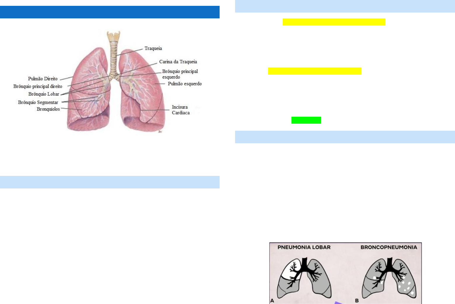 <p>PNEUMONIAS COMUNITÁRIAS</p><p>❖ Estudar pelo livro que ele mandar essa parte (nunca nem vi)</p><p>❖ Tipos:</p><p>➢ PAC: pneumonia adquirida na comunidade</p><p>➢ Hospitalar</p><p>DEFINIÇÃO</p><p>❖ É um processo infeccioso agudo do pulmão. É um processo inflamatório agudo do</p><p>parênquima pulmonar causada por agentes específicos.</p><p>❖ Como os agentes chegam lá?</p><p>➢ Microaspiração (principal): é mais comum do lado direito porque o brônquio</p><p>direito é mais angulado pra baixo facilitando a chegada no microrganismo</p><p>aspirado.</p><p>➢ Inalação</p><p>➢ Disseminação hematogênica: drogas injetáveis (staphilo)</p><p>➢ Por contiguidade: mais raro, processo infecioso próximo se estende até os</p><p>pulmões</p><p>❖ Pode ter padrão intersticial</p><p>❖ Pneumonia é um processo agudo.</p><p>ETIOLOGIA</p><p>❖ Mais comum: streptococous pneumoniae (pneumococo)</p><p>➢ Mycoplasma pneumoniae (atípico): provoca quadro atípico de pneumonia</p><p>➢ Clamydia pneumonia (atípico)</p><p>➢ Vírus (influenza)</p><p>➢ Haemophilus influenzae</p><p>➢ Legionella (maldade- é um germe atípico que provoca quadro atípico)</p><p>❖ Típicos: pneumococo e haemophilus influenzae</p><p>➢ Possuem parede de peptídeoglicano, logo, são corados pelos Gram</p><p>➢ Respondem aos beta-lactâmicos</p><p>❖ Atípicos: myco, clamydia, vírus</p><p>➢ não tem parede</p><p>➢ não respondem aos betas lactâmicos</p><p>➢ respondem a macrolídeos</p><p>QUADRO CLÍNICO</p><p>TIPICO</p><p>❖ Quadro agudo</p><p>❖ Febre alta com tosse produtiva</p><p>❖ Germes típicos + Legionella (que é atípico mas com gera quadro típico)</p><p>❖ Possui 2 tipos de apresentação clássico</p><p>1) Pneumonia lobar: respeita os limites do lobo pulmonar</p><p>a. No RX: a região com pneumonia é branca porque ao invés de ar nos</p><p>alvéolos, passa a ter pus (líquido)</p><p>2) Broncopneumonia: não respeita o lobo pulmonar (acometimento salteado)</p><p>a. No RX: vários “algodões” difusos</p><p>ATIPICO</p><p>❖ Quadro subagudo (+10 dias)</p><p>❖ Síndrome gripal (gri pão): febre, tosse seca, mialgia, dor de garganta</p><p>❖ Germe atípicos (exceto Legionella)</p><p>❖ 1 padrão de apresentação clássico:</p><p>➢ Pneumonia intersticial: os alvéolos estão menos acometidos. A parte mais</p><p>acometida é o interstício. Apresentação radiológica embassada.</p><p>PARTICULARIDADES</p><p>TIPICOS</p><p>❖ Pneumococo:</p><p>➢ Agente mais comum (gram positivo)</p><p>➢ Pode se apresentar em qualquer padrão radiológico (broncopneumonia ou</p><p>pneumonia lobar)</p><p>➢ + comum: broncopneumonia</p><p>➢ Mas existe situações que pode se apresentar como padrão intersticial, derrame,</p><p>redonda, com cavitação</p><p>❖ H. influenza</p><p>➢ Agente bacteriano mais comum na DPOC</p><p>➢ Gram negativo</p><p>❖ Klebsiella pneumoniae</p><p>➢ Mais suscetíveis: etilista e diabéticos</p><p>➢ Padrão radiográfico: pneumonia do lobo pesado (friendlander). O lobo</p><p>acometido abaúla pra baixo</p><p>❖ Staphylococcus aureus</p><p>➢ Mais suscetíveis: drogas IV, pós-influenza, fibrose cística, bronquiectasia</p><p>➢ Principal complicação: pneumatoceles (formação de cisto de ar dentro do</p><p>pulmão)</p><p>❖ Legionella</p><p>➢ Pneumonia típica grave</p><p>➢ Presença de sintomas gastrointestinais: diarreia, SIADH, TGP e TGO</p><p>▪ Poucas pneumonias apresentam esse quadro</p><p>ATIPICOS</p><p>❖ Mycoplasma pneumoniae</p><p>➢ Miringite bolhosa</p><p>➢ Anemia hemolítica autoimune</p><p>➢ Síndrome de Stevens-Johnson</p><p>➢ Fenômeno de Raynaud</p><p>➢ Síndrome de Guillain-Barré</p><p>❖ Clamydia pneumoniae</p><p>➢ Acometimento de VAS (faringite, laringite, sinusite)</p><p>➢ Gripão com muito sintomas de via aéreas</p><p>➢ C. trachomatis: IST</p><p>➢ C. psittaci: ambientes com muitos pássaros</p><p>❖ Anaeróbios</p><p>➢ Dentes em mau estado</p><p>➢ Macroaspiração: etilista, problemas neurológicos, acalase</p><p>➢ Cavitação/abcesso pulmonar</p><p>➢ Tratamento: amoxi-clavulanato ou clindamicina por 3 semanas</p><p>❖ Influenza</p><p>➢ Síndrome gripal</p><p>➢ Pode evoluir para um quadro grave: síndrome respiratória aguda grave</p><p>➢ Dispneia ou desconforto respiratório</p><p>➢ Influenza, covid pode dar pneumonia viral e o raio X estar normal.</p><p>➢ Tratamento: osteltamivir (tamiflu)</p><p>▪ Indicações: idade (65 anos)</p><p>▪ Imunodeprimidos ou comorbidades</p><p>▪ Indígenas</p><p>DIAGNÓSTICO</p><p>❖ CLÍNICA + IMAGEM (para todos)</p><p>❖ Diagnóstico de pneumonia tem que ter exame radiológico</p><p>❖ A pesquisa do agente etiológico é feita quando o tratamento empírico não está</p><p>dando resultados ou quando o paciente interna</p><p>❖ Exames complementares:</p><p>➢ Cultura do escarro</p><p>➢ Hemocultura</p><p>➢ Antígenos urinários (pneumococo e Legionella)</p><p>❖ Exame físico: MV diminuído ou ausente, crepitantes em base direita, toracovocal</p><p>alterado, dispneia.</p><p>A clínica:</p><p>❖ Quadro clínico: sinais e sintomas</p><p>➢ Sintomas: febre, calafrios, tosse (inicia seca e depois fica produtiva), dispneia,</p><p>dor pleurítica, sintomas gastrointestinais (crianças e idosos), alteração do nível</p><p>de consciência)</p><p>➢ Sinais: febre, taquipneia, taquicardia, estertores</p><p>Pneumonia viral é o maior predomínio de pneumonia</p><p>RADIOLOGIA</p><p>❖ RX é considerado padrão ouro</p><p>❖ Deve ser pedido sempre que possível</p><p>❖ Causas de falsos negativos (7%)</p><p>➢ Desidratação</p><p>➢ Imunossuprimidos</p><p>❖ Tomografia não deve ser rotina</p><p>❖ RX não ajuda definir agente etiológico</p><p>❖ PA e perfil</p><p>Diagnóstico etiológico</p><p>❖ Hemocultura (geralmente não faz, só faz em paciente com alteração estrutural,</p><p>comorbidade, internamento p