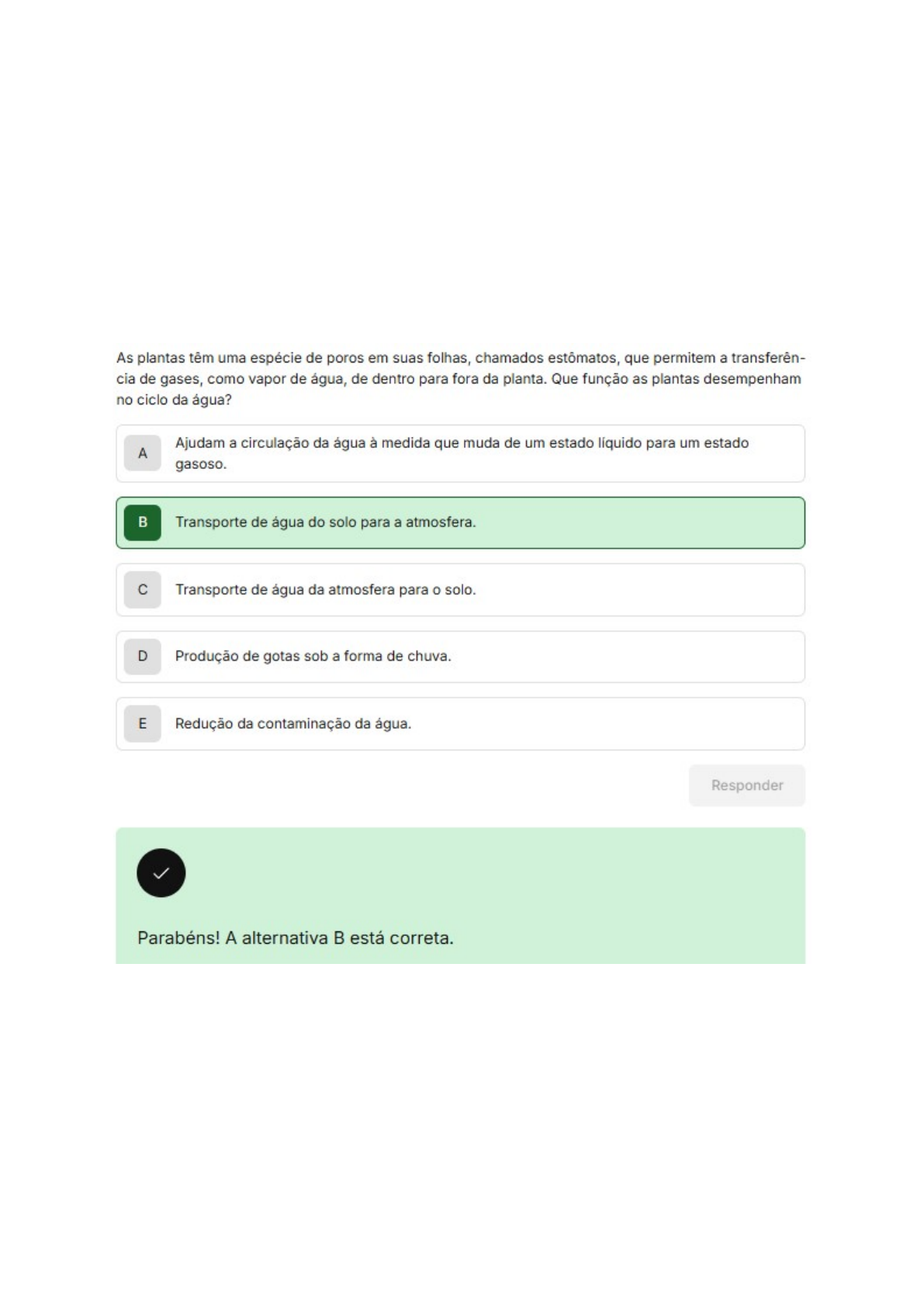 <p>As plantas têm uma espécie de poros em suas folhas, chamados estômatos, que permitem a transferên- cia de gases, como vapor de água de dentro para fora da planta. Que função as plantas desempenham no ciclo da água? Ajudam a circulação da água à medida que muda de um estado líquido para um estado A gasoso. B Transporte de água do solo para a atmosfera. C Transporte de água da atmosfera para o solo. D Produção de gotas sob a forma de E Redução da contaminação da água. Responder Parabéns! A alternativa B está correta.</p>