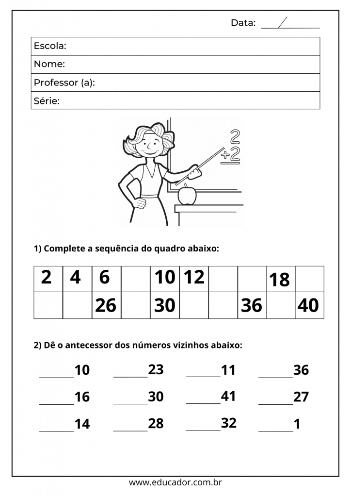 <p>Data: / Escola: Nome: Professor (a): Série: 2 +2 1) Complete a sequência do quadro abaixo: 2 4 6 10 12 18 26 30 36 40 2) Dê o antecessor dos números vizinhos abaixo: 10 23 11 36 16 30 41 27 14 28 32 1 www.educador.com.br</p>