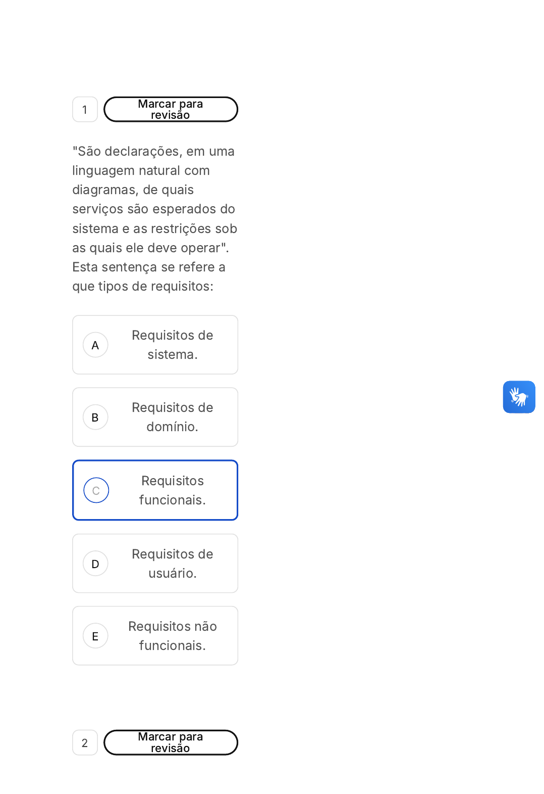 <p>A</p><p>B</p><p>C</p><p>D</p><p>E</p><p>1</p><p>Marcar para</p><p>revisão</p><p>"São declarações, em uma</p><p>linguagem natural com</p><p>diagramas, de quais</p><p>serviços são esperados do</p><p>sistema e as restrições sob</p><p>as quais ele deve operar".</p><p>Esta sentença se refere a</p><p>que tipos de requisitos:</p><p>Requisitos de</p><p>sistema.</p><p>Requisitos de</p><p>domínio.</p><p>Requisitos</p><p>funcionais.</p><p>Requisitos de</p><p>usuário.</p><p>Requisitos não</p><p>funcionais.</p><p>2</p><p>Marcar para</p><p>revisão</p><p>A</p><p>B</p><p>O sistema de biblioteca</p><p>LibraTech está sendo</p><p>atualizado para oferecer</p><p>uma melhor experiência ao</p><p>usuário. O sistema deve</p><p>permitir buscas rápidas de</p><p>livros, ter um tempo de</p><p>resposta rápido e ser</p><p>intuitivo para novos</p><p>usuários. Ademais, precisa</p><p>assegurar a integridade</p><p>das informações dos</p><p>usuários.</p><p>Considerando o texto,</p><p>analise as afirmativas</p><p>abaixo:</p><p>I. A capacidade de</p><p>realizar buscas rápidas</p><p>de livros é um requisito</p><p>de negócio.</p><p>II. A garantia da</p><p>integridade das</p><p>informações dos</p><p>usuários é um requisito</p><p>não funcional.</p><p>III. Um sistema</p><p>intuitivo para novos</p><p>usuários é um requisito</p><p>funcional.</p><p>Apenas as</p><p>afirmativas I e II</p><p>estão corretas</p><p>Apenas a</p><p>afirmativa II está</p><p>correta</p><p>C</p><p>D</p><p>E</p><p>Apenas as</p><p>afirmativas II e III</p><p>estão corretas</p><p>Apenas a</p><p>afirmativa III está</p><p>correta</p><p>Apenas a</p><p>afirmativa I está</p><p>correta</p><p>3</p><p>Marcar para</p><p>revisão</p><p>Em relação aos conceitos</p><p>de requisitos de software,</p><p>analise os itens a seguir e</p><p>coloque �V) para a</p><p>assertiva verdadeira e �F)</p><p>para a assertiva falsa.</p><p>( ) Na definição dos</p><p>requisitos de software,</p><p>nem todos os requisitos</p><p>não funcionais dizem</p><p>respeito ao sistema de</p><p>software a ser</p><p>desenvolvido.</p><p>( ) O levantamento de</p><p>requisitos de software</p><p>privilegia a visão do</p><p>desenvolvedor em relação</p><p>aos requisitos de um</p><p>produto. Já a análise dos</p><p>A</p><p>B</p><p>C</p><p>requisitos prioriza a visão</p><p>que o cliente e os usuários</p><p>têm dos requisitos de um</p><p>produto.</p><p>( ) Os requisitos de um</p><p>sistema são descrições</p><p>dos serviços fornecidos</p><p>pelo sistema e suas</p><p>restrições operacionais. O</p><p>processo de descobrir,</p><p>analisar, documentar e</p><p>verificar esses serviços e</p><p>restrições é denominado</p><p>engenharia de requisitos.</p><p>( ) Gerência de requisitos</p><p>pode ser conceituada</p><p>como enfoque sistemático</p><p>para a elicitação,</p><p>organização e</p><p>documentação dos</p><p>requisitos do sistema e um</p><p>processo que estabelece e</p><p>mantém o acordo entre</p><p>usuários e a equipe de</p><p>projeto à medida que os</p><p>requisitos são</p><p>modificados.</p><p>F, F, V, V</p><p>V, F, V, V</p><p>F, F, V, F</p><p>D</p><p>E</p><p>V, V, F, V</p><p>F, V, F, F</p><p>4</p><p>Marcar para</p><p>revisão</p><p>Na engenharia de</p><p>software, os __________ são</p><p>fundamentais para o</p><p>desenvolvimento de</p><p>sistemas eficazes. Eles</p><p>definem as necessidades e</p><p>expectativas dos usuários,</p><p>além de orientar a equipe</p><p>de desenvolvimento. Um</p><p>aspecto crucial é a</p><p>distinção entre requisitos</p><p>de __________, que são</p><p>descrições gerais do que</p><p>os usuários desejam, e</p><p>requisitos de __________,</p><p>que detalham</p><p>especificações técnicas e</p><p>funcionais do sistema.</p><p>Essa diferenciação ajuda a</p><p>garantir que o sistema final</p><p>atenda tanto às</p><p>necessidades do usuário</p><p>quanto às exigências</p><p>técnicas.</p><p>Assinale a alternativa que</p><p>contém a sequência</p><p>correta para preencher as</p><p>lacunas acima:</p><p>A</p><p>B</p><p>C</p><p>D</p><p>E</p><p>requisitos –</p><p>usuários –</p><p>sistemas</p><p>objetivos –</p><p>sistemas –</p><p>usuários</p><p>especificações –</p><p>desenvolvedores</p><p>– funcionalidades</p><p>funções –</p><p>requisitos –</p><p>objetivos</p><p>demandas –</p><p>funcionalidades –</p><p>desenvolvedores</p><p>5</p><p>Marcar para</p><p>revisão</p><p>Para um aplicativo de</p><p>rastreamento de atividades</p><p>físicas, a definição precisa</p><p>de requisitos não</p><p>funcionais é crucial. Estes</p><p>requisitos determinam a</p><p>qualidade do sistema,</p><p>influenciando a</p><p>experiência do usuário.</p><p>Qual dos seguintes é um</p><p>exemplo de requisito não</p><p>funcional para um</p><p>00</p><p>hora</p><p>: 34</p><p>min</p><p>: 06</p><p>seg</p><p>Ocultar</p><p>Questão 9 de 10</p><p>1 2 3 4 5</p><p>SM1 Requisitos De Sistemas</p><p>A</p><p>B</p><p>C</p><p>D</p><p>E</p><p>aplicativo de rastreamento</p><p>de atividades físicas?</p><p>O aplicativo deve</p><p>contar passos e</p><p>medir distâncias</p><p>percorridas</p><p>O aplicativo deve</p><p>apresentar</p><p>gráficos de</p><p>progresso do</p><p>usuário</p><p>O aplicativo deve</p><p>funcionar em</p><p>dispositivos com</p><p>iOS e Android</p><p>O aplicativo deve</p><p>permitir o</p><p>compartilhamento</p><p>de resultados nas</p><p>redes sociais</p><p>O aplicativo deve</p><p>fornecer um</p><p>plano de treino</p><p>personalizado</p><p>6</p><p>Marcar para</p><p>revisão</p><p>O que são requisitos</p><p>Respondidas �10� Em branco �0�</p><p>Finalizar prova</p><p>1 2 3 4 5</p><p>6 7 8 9 10</p><p>A</p><p>B</p><p>C</p><p>funcionais?</p><p>São aqueles que</p><p>especificam as</p><p>necessidades</p><p>dos stakeholders</p><p>em relação as</p><p>ações do sistema</p><p>que realizam o</p><p>negócio.</p><p>São aqueles que</p><p>especificam as</p><p>necessidades dos</p><p>stakeholders em</p><p>relação a</p><