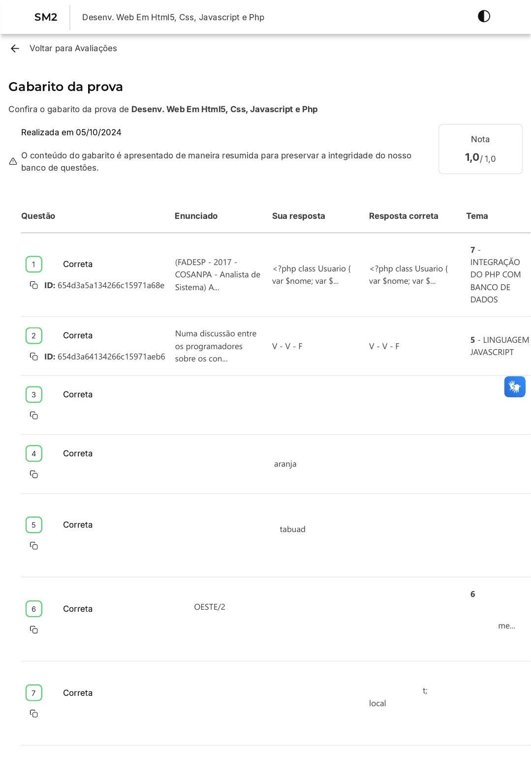 <p>Voltar para Avaliações</p><p>Gabarito da prova</p><p>Confira o gabarito da prova de Desenv. Web Em Html5, Css, Javascript e Php</p><p>Realizada em 05/10/2024</p><p>O conteúdo do gabarito é apresentado de maneira resumida para preservar a integridade do nosso</p><p>banco de questões.</p><p>Nota</p><p>1,0/ 1,0</p><p>Questão Enunciado Sua resposta Resposta correta Tema</p><p>Correta</p><p>ID: 654d3a5a134266c15971a68e</p><p>(FADESP - 2017 -</p><p>COSANPA - Analista de</p><p>Sistema) A...</p><p>''1234567890'',''Nome...</p><p>$cadastro</p><p>=array(''CPF''=>''1234567890'',''Nome...</p><p>6 -</p><p>PROGRAMAÇÃO</p><p>DE PÁGINAS</p><p>DINÂMICAS</p><p>COM PHP</p><p>Correta</p><p>ID: 654d3a59134266c15971a1f0</p><p>(Colégio Pedro II - 2016</p><p>- Colégio P...</p><p>mysqli_connect;</p><p>localhost; bdConcurso;</p><p>!mysqli_que...</p><p>mysqli_connect;</p><p>localhost; bdConcurso;</p><p>!mysqli_que...</p><p>7 -</p><p>INTEGRAÇÃO</p><p>DO PHP COM</p><p>BANCO DE</p><p>DADOS</p><p>1</p><p>2</p><p>3</p><p>4</p><p>5</p><p>6</p><p>7</p><p>Feedback</p><p>SM2 Desenv. Web Em Html5, Css, Javascript e Php</p><p>https://estacio.saladeavaliacoes.com.br/avaliacoes/</p><p>Correta</p><p>ID: 654d3a59134266c15971a1e4</p><p>(FCC - 2017 - DPE-RS -</p><p>Analista -</p><p>Desenvolvimento ...</p><p>$dbh->exec $dbh->exec</p><p>7 -</p><p>INTEGRAÇÃO</p><p>DO PHP COM</p><p>BANCO DE</p><p>DADOS</p><p>Correta</p><p>ID: 654d3bf2134266c1597331ab</p><p>(FAEPESUL/2019)</p><p>Considerando que a</p><p>funç&ati...</p><p>105 105</p><p>5 - LINGUAGEM</p><p>JAVASCRIPT</p><p>Correta</p><p>ID: 654d3bdb134266c1597321ba</p><p>(IDECAN/2021 -</p><p>Adaptada) PHP é uma</p><p>tecnologia que ...</p><p>break. break.</p><p>6 -</p><p>PROGRAMAÇÃO</p><p>DE PÁGINAS</p><p>DINÂMICAS</p><p>COM PHP</p><p>8</p><p>9</p><p>10</p><p>Encontrou algum problema?</p><p>Você pode copiar o ID da questão, acessar o Campus Virtual �SIA) e abrir um requerimento.</p>