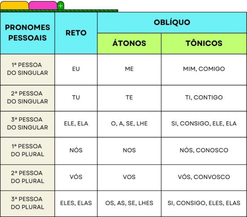 <p>Pronomes pessoais: o que são,</p><p>exemplos, tipos e funções</p><p>Eu, tu, ele, ela, nós, vós, eles e elas são pronomes pessoais bem conhecidos,</p><p>classificados como retos. Ainda existem os pronomes pessoais oblíquos e os de</p><p>tratamento.</p><p>Os pronomes pessoais indicam as pessoas do discurso, ou seja, as pessoas</p><p>envolvidas no processo de comunicação:</p><p> quem fala: 1ª pessoa do singular (eu) e do plural (nós);</p><p> com quem se fala: 2ª pessoa do singular (tu) e do plural (vós);</p><p> de que ou de quem se fala: 3ª pessoa do singular (ele, ela) e do plural (eles,</p><p>elas).</p><p>Eles tornam a comunicação mais fluida, porque substituem nomes</p><p>(substantivos) no texto, evitando repetições desnecessárias. Variam em gênero</p><p>(masculino e feminino) e número (singular e plural).</p><p>Tabela dos pronomes pessoais</p><p>Pronomes pessoais retos</p><p>Os pronomes pessoais retos identificam as pessoas do discurso.</p><p>Na tira são apresentados todos os pronomes pessoais do caso reto: eu, tu, ele,</p><p>ela, nós, vós, eles e elas.</p><p>Também é apresentado um pronome de tratamento: você. No português</p><p>brasileiro, geralmente usamos você no lugar de tu e vocês no lugar de vós. Mas</p><p>o pronome você(s) é acompanhado de verbo na 3ª pessoa (você fala / ele fala).</p><p>Exemplos de frases com pronomes pessoais retos</p><p> Eu fui ao teatro.</p><p> Ele gosta de ler.</p><p> Nós adoramos assistir a filmes juntos.</p><p> Elas disseram que estão bem.</p><p>Pronomes pessoais oblíquos</p><p>Os pronomes pessoais oblíquos se relacionam com os pronomes retos,</p><p>funcionando como complementos.</p><p>Você é assim</p><p>Um sonho pra mim</p><p>E quando eu não te vejo</p><p>Eu penso em você</p><p>Desde o amanhecer</p><p>Até quando eu me deito</p><p>(Velha infância, Tribalistas)</p><p>No trecho da canção há três exemplos: mim, te e me. Os pronomes pessoais</p><p>oblíquos são divididos em átonos ou tônicos, de acordo com a intensidade com</p><p>que são pronunciados (acentuação tônica).</p><p>Pronomes oblíquos átonos</p><p>Os pronomes oblíquos átonos são estes: me, te, o(s), a(s), se, lhe(s), nos, vos.</p><p>Eles não são precedidos de preposição.</p><p>Exemplos de frases com pronomes pessoais oblíquos átonos</p><p> Eu encontrei-a no colégio.</p><p> Ele me deu um livro de presente.</p><p> Não nos disseram o que faremos.</p><p> Alguém os levou para a sala?</p><p>As formas o, a, os, as, quando colocadas depois do verbo, podem apresentar</p><p>combinações como lo, la, los, las (verbo terminado em -z, -s ou -r) ou no, na,</p><p>nos, nas (verbo terminado em -ão, -em, -õe, -am). Exemplo: Coloquem-no aqui,</p><p>por favor.</p><p>Importante: no uso formal da língua, não se deve começar uma frase com um</p><p>pronome oblíquo átono. Exemplos: "Levou-me embora", "Falei-lhe sobre o</p><p>caso".</p><p>Pronomes oblíquos tônicos</p><p>Os pronomes oblíquos tônicos são estes: mim, comigo, ti, contigo, ele(s), ela(s),</p><p>si, nós, conosco, vós, convosco. Eles são sempre usados com uma preposição.</p><p>Exemplos de frases com pronomes pessoais oblíquos tônicos</p><p> Eles sabem que Joana gosta de mim.</p><p> Não digo nem a ela, nem a você.</p><p> Por nós, está tudo bem.</p><p> Trouxe esta flor para ti.</p><p>Pronomes de tratamento</p><p>Os pronomes de tratamento são formas mais corteses e reverentes de nos</p><p>dirigirmos às pessoas. A exceção é o pronome você, usado em situações</p><p>informais.</p><p>Na tirinha há o uso de um pronome de tratamento muito comum: senhora.</p><p>Geralmente, o uso desses pronomes considera os títulos ou características das</p><p>pessoas.</p><p>Veja alguns dos principais pronomes de tratamento:</p><p> Vossa Excelência (V. Ex.ª): Presidente da República, ministros, senadores,</p><p>deputados, embaixadores, juízes etc.</p><p> Vossa Magnificência (V. Mag.ª): reitores de universidades</p><p> Vossa Majestade (V. M.): reis e rainhas</p><p> Vossa Santidade (V. S.): papa</p><p> Vossa Onipotência (não se abrevia): Deus</p><p>Usamos “vossa” para falar diretamente com o interlocutor e “sua” para</p><p>mencioná-lo.</p><p>Exemplos de frases com pronomes de tratamento</p><p> O senhor estará presente na reunião de equipe?</p><p> As arrumações para a festa de aniversário de Vossa Alteza já foram</p><p>concluídas.</p><p> Os colaboradores sabem se Sua Excelência comparecerá à assembleia?</p><p> A preparação para o encontro com Vossa Eminência está em andamento.</p><p>Com os pronomes de tratamento, usa-se o verbo flexionado na 3ª pessoa.</p><p>Funções dos pronomes pessoais (retos e oblíquos)</p><p>Sabe por que os pronomes pessoais retos e oblíquos recebem esse nome? A</p><p>ideia foi a de classificá-los de acordo com as funções que desempenham nas</p><p>orações. O caso reto se refere ao papel (quase sempre) de sujeito e o caso</p><p>oblíquo aos demais.</p><p> Retos: funções de sujeito e predicativo</p><p> Oblíquos átonos: funções adverbiais de objeto e adjunto</p><p> Oblíquos tônicos: funções de complemento e adjunto precedidos de</p><p>preposição</p><p>É por isso que existem recomendações quanto ao uso de frases como:</p><p> Eu a convidei (certo) / Eu convidei ela (errado)</p><p> A professora deu o texto para eu ler (certo) / A professora deu o texto</p><p>para mim ler (errado)</p><p>Exercícios de pronomes pessoais</p><p>1. Leia o trecho da crônica Papos, de Luis Fernando Verissimo, para responder</p><p>às questões.</p><p>– Me disseram...</p><p>– Disseram-me.</p><p>– Hein?</p><p>– O correto é “disseram-me”. Não “me disseram”.</p><p>– Eu falo como quero. E te digo mais [...]</p><p>– [...] você está sendo grosseiro, pedante e chato. E que eu vou te partir a cara.</p><p>Lhe partir a cara. Partir a sua cara. Como é que se diz?</p><p>– Partir-te a cara.</p><p>– Pois é. Parti-la hei de, se