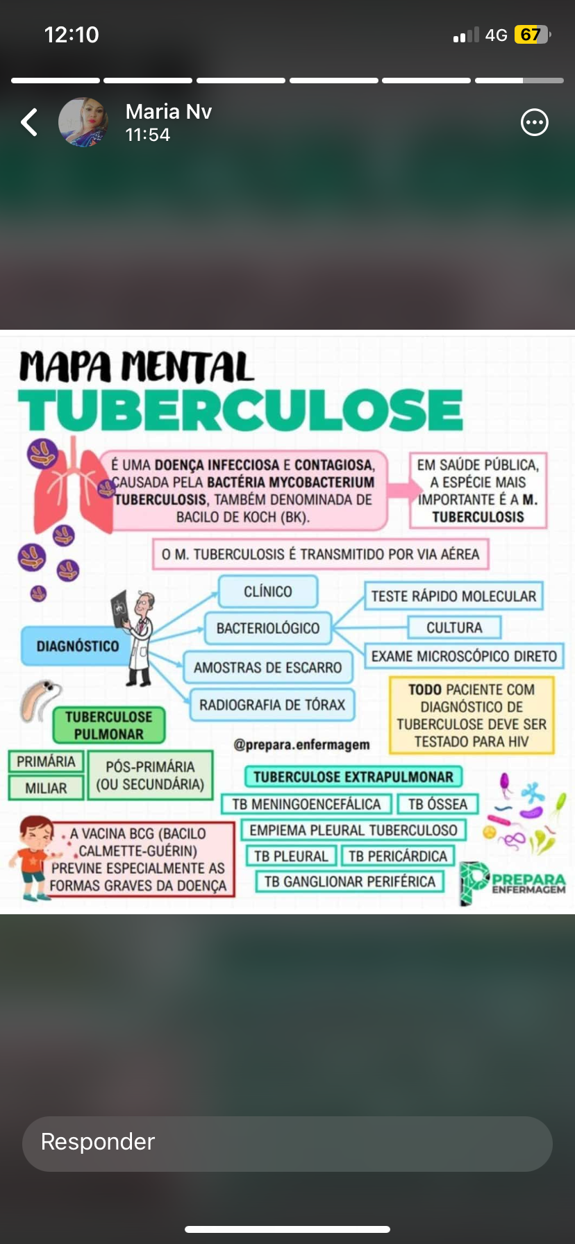 <p>12:10 4G 67 Maria Nv 11:54 MAPA MENTAL TUBERCULOSE É UMA DOENÇA INFECCIOSA E EM SAÚDE CAUSADA PELA BACTÉRIA MYCOBACTERIUM A ESPÉCIE MAIS TUBERCULOSIS, TAMBÉM DENOMINADA DE IMPORTANTE É A M. BACILO DE KOCH (BK). TUBERCULOSIS TUBERCULOSIS É TRANSMITIDO POR VIA AÉREA CLÍNICO TESTE RÁPIDO MOLECULAR BACTERIOLÓGICO CULTURA DIAGNÓSTICO EXAME MICROSCÓPICO DIRETO AMOSTRAS DE ESCARRO TODO PACIENTE COM RADIOGRAFIA DE DIAGNÓSTICO DE TUBERCULOSE TUBERCULOSE DEVE SER PULMONAR @prepara.enfermagem TESTADO PARA HIV PRIMÁRIA TUBERCULOSE EXTRAPULMONAR MILIAR (OU SECUNDÁRIA) TB TB A VACINA BCG (BACILO EMPIEMA PLEURAL TUBERCULOSO TB PLEURAL TB PERICÁRDICA PREVINE ESPECIALMENTE AS FORMAS GRAVES DA DOENÇA TB GANGLIONAR PERIFÉRICA PREPARA ENFERMAGEM</p>