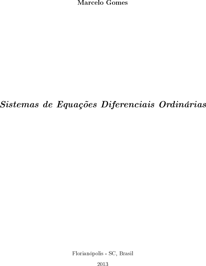 <p>Marcelo Gomes</p><p>Sistemas de Equações Diferenciais Ordinárias</p><p>Florianópolis - SC, Brasil</p><p>2013</p><p>Marcelo Gomes</p><p>Sistemas de Equações Diferenciais Ordinárias</p><p>Trabalho de conclusão de curso apresentado</p><p>para obtenção do Grau de Licenciatura em</p><p>Matemática pela Universidade Federal de</p><p>Santa Catarina.</p><p>Orientador:</p><p>Melissa Weber Mendonça</p><p>Universidade federal de Santa Catarina</p><p>Centro de ciências Físicas e Matemáticas</p><p>Florianópolis - SC, Brasil</p><p>2013</p><p>Trabalho de conclusão de Graduação em Matemática sob o título �Sistemas de Equa-</p><p>ções Diferenciais Ordinárias�, defendida por Marcelo Gomes e aprovada em 2013, em</p><p>Florianópolis, Estado de Santa Catarina, pela banca examinadora designada pela Porta-</p><p>ria número 06/CCM/13.</p><p>Prof. Nereu Estanislau Burin -</p><p>Professor da disciplina</p><p>Banca Examinadora:</p><p>Prof. Dra. Melissa Weber Mendonça -</p><p>Orientadora</p><p>Prof. Dra. Silvia Martini de Holanda</p><p>Janesch - UFSC</p><p>Prof. Dra. Flávia Tereza Giordani - UFSC</p><p>Luciane e Altair.</p><p>Agradecimentos</p><p>À Deus acima de tudo.</p><p>A Luciane Carlota Faria e Altair Antônio Volpato ao apoio, incentivo e compreensão</p><p>nos momentos que precisei estudar e não pude dar a devida atenção que mereciam.</p><p>Aos colegas que participaram desta trajetória, em especial à Juliana Tabalipa, Carlos</p><p>Fabiano Rosa e Ivo Paulek Junior.</p><p>A minha orientadora, Melissa Weber Mendonça, agradeço pelos ensinamentos, por</p><p>toda paciência e dedicação.</p><p>As Professoras, Silvia Martini de Holanda Janesch e Flávia Tereza Giordani, por</p><p>aceitarem compor a banca, dedicarem seu tempo para a leitura e contribuírem para o</p><p>aperfeiçoamento do trabalho.</p><p>Também agradeço a todos os outros professores e servidores que me auxiliaram nesta</p><p>graduação.</p><p>Resumo</p><p>Inicialmente de�nimos algumas propriedades de matrizes úteis em nosso estudo e ainda</p><p>algumas de�nições como por exemplo números complexos, vetores e determinantes. Além</p><p>disso, apresentamos o objetivo central em nosso estudo que são os sistemas de equações</p><p>diferenciais ordinárias. Por seguinte, estudamos métodos de resoluções dos sistemas de</p><p>equações diferenciais ordinárias envolvendo autovalores e autovetores.</p><p>Finalmente apresentamos problemas das áreas de física, química e engenharia, onde</p><p>foi utilizado os métodos estudos no trabalho de conclusão de curso para resolução dos</p><p>sistemas de equações diferenciais ordinária associado as respectivas áreas.</p><p>Sumário</p><p>Lista de Figuras</p><p>Lista de Tabelas</p><p>Introdução 17</p><p>1 Matrizes 19</p><p>1.1 De�nição de Matriz . . . . . . . . . . . . . . . . . . . . . . . . . . . . . . . 21</p><p>1.2 Tipos de Matrizes . . . . . . . . . . . . . . . . . . . . . . . . . . . . . . . . 22</p><p>1.3 Operações com Matrizes . . . . . . . . . . . . . . . . . . . . . . . . . . . . 23</p><p>1.4 Matriz Transposta . . . . . . . . . . . . . . . . . . . . . . . . . . . . . . . 26</p><p>1.4.1 Vetores . . . . . . . . . . . . . . . . . . . . . . . . . . . . . . . . . . 27</p><p>1.4.2 Determinantes . . . . . . . . . . . . . . . . . . . . . . . . . . . . . . 27</p><p>1.4.3 Inversa . . . . . . . . . . . . . . . . . . . . . . . . . . . . . . . . . . 28</p><p>1.5 Funções Matriciais . . . . . . . . . . . . . . . . . . . . . . . . . . . . . . . 30</p><p>1.6 Sistemas de Equações Lineares, Combinação Linear, Autovalores e Auto-</p><p>vetores . . . . . . . . . . . . . . . . . . . . . . . . . . . . . . . . . . . . . . 31</p><p>1.6.1 Sistemas de Equações Lineares . . . . . . . . . . . . . . . . . . . . 31</p><p>1.6.2 Dependência e Independência linear . . . . . . . . . . . . . . . . . . 36</p><p>1.6.3 Autovalores e Autovetores . . . . . . . . . . . . . . . . . . . . . . . 39</p><p>1.7 Matrizes Diagonalizáveis . . . . . . . . . . . . . . . . . . . . . . . . . . . . 45</p><p>2 Sistemas de Equações Diferenciais Ordinárias 47</p><p>2.1 Equação Diferencial Ordinária . . . . . . . . . . . . . . . . . . . . . . . . . 49</p><p>2.2 Equação Diferencial Ordinária linear de Primeira Ordem . . . . . . . . . . 49</p><p>2.3 Equação Diferencial Ordinária linear de Segunda Ordem . . . . . . . . . . 49</p><p>2.4 Sistemas de Equações Diferenciais de Primeira</p><p>Ordem . . . . . . . . . . . . . . . . . . . . . . . . . . . . . . . . . . . . . . 50</p><p>2.5 Wronskiano . . . . . . . . . . . . . . . . . . . . . . . . . . . . . . . . . . . 53</p><p>2.6 Sistemas Homogêneos com Coe�cientes Constantes . . . . . . . . . . . . . 55</p><p>2.6.1 Sistemas Lineares Não Homogêneos . . . . . . . . . . . . . . . . . . 68</p><p>3 Sistemas de Equações Diferenciais como Modelos Matemáticos 73</p><p>Conclusão 83</p><p>Referências 85</p><p>Lista de Figuras</p><p>1 Sistema Massa-Mola. . . . . . . . . . . . . . . . . . . . . . . . . . . . . . . 50</p><p>2 Mistura. . . . . . . . . . . . . . . . . . . . . . . . . . . . . . . . . . . . . . 75</p><p>3 Prédio destruído por um terremoto em Porto Princípe. Foto de Tequila</p><p>Minsky/ New York Times. . . . . . . . . . . . . . . . . . . . . . . . . . . . 77</p><p>4 Circuito Elétrico. . . . . . . . . . . . . . . . . . . . . . . . . . . . . . . . . 79</p><p>Lista de Tabelas</p><p>1 Brasileirão 2011 . . . . . . . . . . . . . . . . . . . . . . . . . . . . . . . . . 21</p><p>2 Venda de Livros em 2010 . . . . . . . . . . . . . . . . . . . . . . . . . . . . 24</p><p>3 Venda de Livros em 2011 . . . . . . . . . . . . . . . . . . . . . . . . . . . . 24</p><p>Introdução</p><p>Este trabalho tem como objetivo discorrer sobre Sistemas de Equações Diferenciais</p><p>Ordinárias, como também sua aplicação nas mais diversas áreas. Tais aplicações ou</p><p>modelos como são chamado na Física, Química, Economia, Engenh