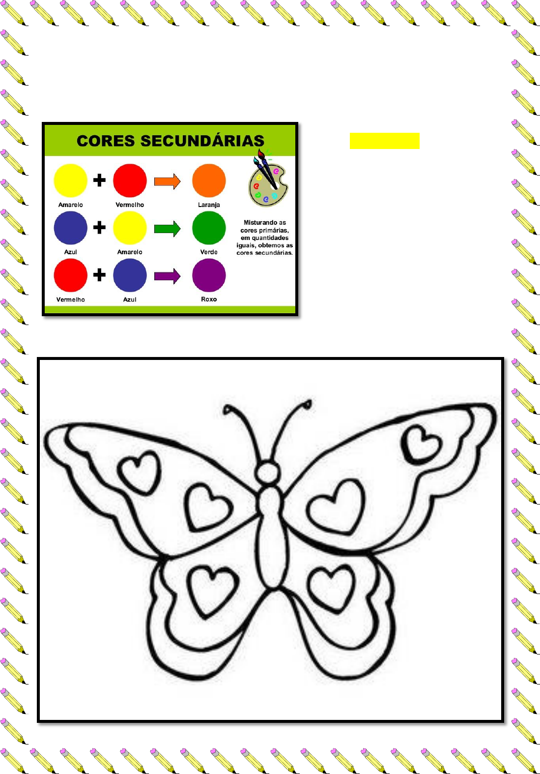 <p>Escola Santa Maria</p><p>Professora: Mary Alvarenga Série: 5º ano</p><p>Atividade de Arte</p><p>Cores secundárias são as cores</p><p>formadas a partir da combinação de</p><p>duas cores primárias.</p><p>As cores secundárias são: laranja, roxo</p><p>e verde.</p><p>O laranja é feito a partir da combinação</p><p>da cor vermelha com a amarela. O roxo</p><p>(ou violeta) é criado com a junção das</p><p>cores vermelha e azul. Já o verde é</p><p>produzido com o azul e o amarelo.</p><p>Colorir o desenho usando somente cores secundárias. Deixe a borboleta bem colorida.</p><p>Cruzadinha</p><p>Complete a cruzadinha de acordo com as informações.</p><p>1. Cores que são obtidas quando ocorre a mistura de duas cores primárias.</p><p>2. São assim chamadas pelo fato de existirem sem a necessidade de misturas de outras cores.</p><p>3. Nome de uma cor primária.</p><p>4. Cor que deriva da mistura do azul com o amarelo.</p><p>5. Cor que deriva da mistura do vermelho com o amarelo.</p><p>6. Cor que deriva da mistura do azul com o vermelho</p><p>3 2</p><p>1</p><p>4</p><p>6</p><p>5</p><p>O Senhor te abençoe e te guarde;</p><p>O Senhor faça resplandecer o seu rosto sobre ti, e tenha misericórdia de ti;</p><p>O Senhor sobre ti levante o seu rosto e te dê a paz.</p><p>Números 6:24-26</p><p>https://www.bibliaonline.com.br/acf/nm/6/24-26</p><p>Respostas</p><p>Complete a cruzadinha de acordo com as informações.</p><p>1. Cores que são obtidas quando ocorre a mistura de duas cores primárias. Secundárias</p><p>2. São assim chamadas pelo fato de existirem sem a necessidade de misturas de outras cores.</p><p>Primárias</p><p>3. Nome de uma cor primária. vermelha</p><p>4. Cor que deriva da mistura do azul com o amarelo. verde</p><p>5. Cor que deriva da mistura do vermelho com o amarelo. laranja</p><p>6. Cor que deriva da mistura do azul com o vermelho roxo</p><p>3 2</p><p>V P</p><p>1 S E C U N D A R I A</p><p>R I</p><p>M M</p><p>4 V E R D E A</p><p>L R</p><p>H I 6</p><p>A 5 L A R A N J A</p><p>O</p><p>X</p><p>O</p>