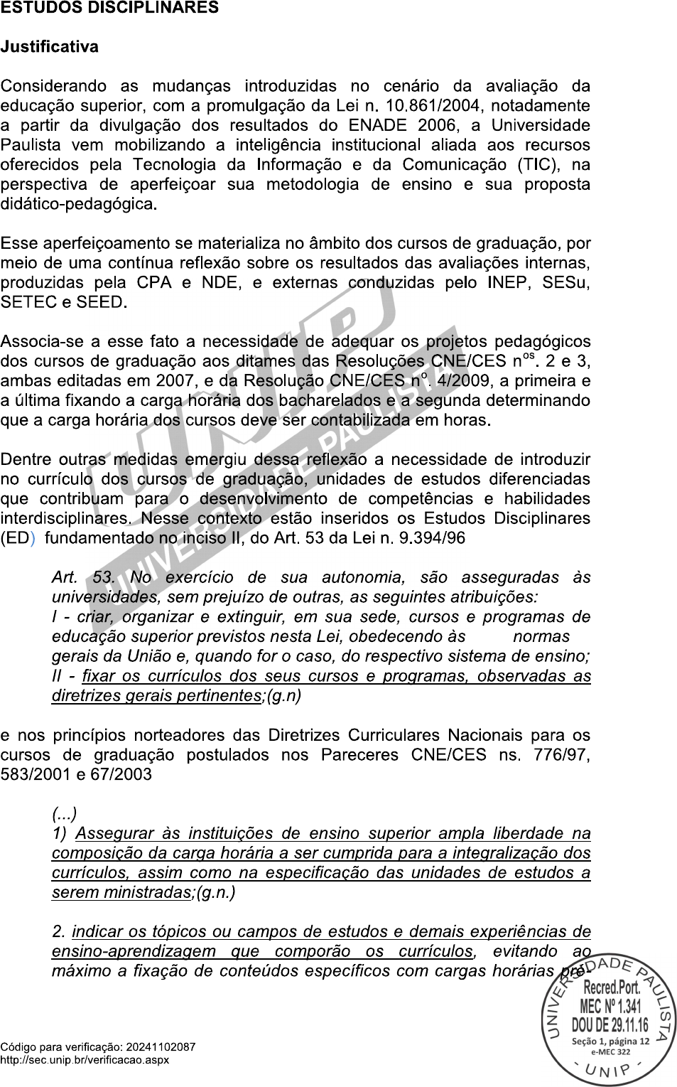 <p>ESTUDOS DISCIPLINARES Justificativa Considerando as mudanças introduzidas no cenário da avaliação da educação superior, com a promulgação da Lei n. 10.861/2004, notadamente a partir da divulgação dos resultados do ENADE 2006. a Universidade Paulista vem mobilizando a inteligência institucional aliada aos recursos oferecidos pela Tecnologia da Informação e da Comunicação (TIC), na perspectiva de aperfeiçoar sua metodologia de ensino e sua proposta didático-pedagógica. Esse aperfeiçoamento se materializa no âmbito dos cursos de graduação, por meio de uma contínua reflexão sobre os resultados das avaliações internas, produzidas pela CPA e NDE, e externas conduzidas pelo INEP, SESu, SETEC e SEED. Associa-se a esse fato a necessidade de adequar os projetos pedagógicos dos cursos de graduação aos ditames das Resoluções CNE/CES 2 e 3, ambas editadas em 2007, e da Resolução CNE/CES 4/2009, a primeira e a última fixando a carga horária dos bacharelados e a segunda determinando que a carga horária dos cursos deve ser contabilizada em horas. Dentre outras medidas emergiu dessa reflexão a necessidade de introduzir no currículo dos cursos de graduação, unidades de estudos diferenciadas que contribuam para desenvolvimento de competências e habilidades interdisciplinares, Nesse contexto estão inseridos os Estudos Disciplinares (ED) fundamentado no inciso II, do Art. 53 da Lei n. 9.394/96 Art. No exercício de sua autonomia, são asseguradas às universidades, sem prejuízo de outras, as seguintes atribuições: criar, organizar e extinguir, em sua sede, cursos e programas de educação superior previstos nesta Lei, obedecendo às normas gerais da União e, quando for o caso, do respectivo sistema de ensino; fixar os currículos dos seus cursos e programas, observadas as diretrizes gerais pertinentes;(g.n) e nos princípios norteadores das Diretrizes Curriculares Nacionais para os cursos de graduação postulados nos Pareceres CNE/CES ns. 776/97, 583/2001 e 67/2003 (...) 1) Assegurar às instituições de ensino superior ampla liberdade na composição da carga horária a ser cumprida para a integralização dos currículos, assim como na especificação das unidades de estudos a serem 2. indicar os tópicos ou campos de estudos e demais experiências de ensino-aprendizagem que comporão os currículos, evitando ao máximo a fixação de conteúdos específicos com cargas horárias DOU MEC Recred. DE 29.11.16 1.341 Port. Seção 1, página 12 Código para verificação: 20241102087 e-MEC 322 UNIP</p><p>determinadas, os quais não poderão exceder 50% da carga horária total dos cursos;(g.n.) (...) 4) Incentivar uma sólida formação geral, necessária para que o futuro graduado possa vir a superar os desafios de renovadas condições de exercício profissional e de produção do conhecimento, permitindo variados tipos de formação e habilitações diferenciadas em um mesmo programa; (g.n) 5) Estimular práticas de estudo independente, visando uma progressiva autonomia profissional e intelectual do aluno;(g.n) Universidade Paulista UNIP Regulamento dos Estudos Disciplinares CAPÍTULO DA CONCEPÇÃO, CARGA HORÁRIA E OBJETIVOS Art. 1°. presente Regulamento normatiza a execução dos Estudos Disciplinares (ED) constituídos por um conjunto específico de unidade de estudos, ao abrigo do que dispõe o inciso do Art. 53, da Lei n. 9.394 de 20 de dezembro de 1996 (LDBEN), observadas as Orientações para as Diretrizes Curriculares dos Cursos de Graduação emanadas do Conselho Nacional de Educação, nos termos do Parecer CNE/CES 776. de 13 de dezembro de 1997, do Parecer CNE/CES n°. 583, de 4 de abril de 2001 e do Parecer CNE/CES n°. 67 de 11 de março de 2003. Art. 2°. Os Estudos Disciplinares são unidades de estudos de caráter obrigatório nos cursos de graduação da Universidade Paulista (UNIP), constituindo um eixo estruturante de formação inter e multidisciplinar que perpassa todos os períodos dos cursos. Art. A carga horária dos Estudos Disciplinares é definida no projeto pedagógico de cada curso, considerando suas especificidades. Art. São objetivos dos Estudos Disciplinares: a. propiciar uma sólida formação geral, necessária para que o futuro graduado possa vir a superar os desafios de renovadas condições de exercício profissional e de produção do conhecimento; DOU MEC Recred DE 29.11.16 1.341 Port. Seção 1, página 12 Código para verificação: 20241102087 e-MEC 322 UNIP</p><p>b. prover o aluno de graduação de competências e habilidades específicas para abordar, com visão inter e multidisciplinar, problemas de sua área de atuação profissional, com grau crescente de complexidade à medida em que ele progride em sua formação; C. proporcionar aos estudantes oportunidades para estabelecer conexões entre as diferentes áreas do conhecimento visando a solução de problemas; d. estimular práticas de estudo independente, visando uma progressiva autonomia profissional e intelectual do aluno. CAPÍTULO DA OPERACIONALIZAÇÃO Art. 5°. Os ED utilizam a resolução sistemática de exercícios, indutores do desenvolvimento das competências e habilidades para sua área de formação. §1°. Os exercícios abordam, inicialmente, conteúdos de formação geral, e à medida que o aluno avança na sua matriz curricular, esses conteúdos são progressivamente substituídos por outros de formação específica, de cunho interdisciplinar, envolvendo diferentes campos do saber. Os conteúdos abordados nos Estudos Disciplinares devem ter por base as Diretrizes Curriculares e o Projeto Pedagógico do Curso. Art. 6°. Os Estudos Disciplinares serão desenvolvidos com recursos educacionais combinados do ensino presencial e da educação a distância, utilizando, entre outros. a plataforma de Tecnologia de Informação e Comunicação da UNIP. CAPÍTULO III DA SUPERVISÃO E AVALIAÇÃO Art. Caberá aos docentes responsáveis pelos ED superv