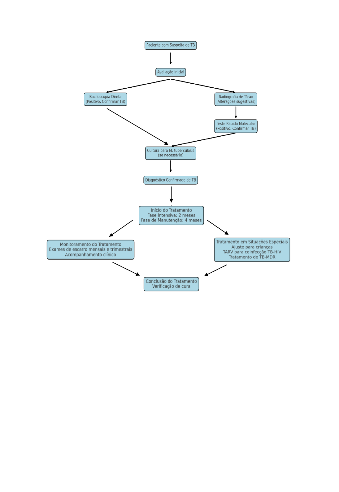 <p>Fluxograma de Diagnóstico e Tratamento da Tuberculose</p><p>1</p><p>Aluno (a): Pedro Henrique de Oliveira Silva.</p><p>Diagnóstico Bacteriológico da Tuberculose</p><p>O diagnóstico bacteriológico é crucial para a confirmação e controle do tratamento da</p><p>tuberculose (TB). Os métodos utilizados incluem:</p><p>1. Baciloscopia Direta: Pesquisa do bacilo álcool-ácido resistente (BAAR) pelo método</p><p>de Ziehl-Nielsen. É indicado em sintomáticos respiratórios e casos suspeitos de TB</p><p>pulmonar.</p><p>2. Cultura para Micobactéria: Método de alta especificidade e sensibilidade, usado</p><p>para confirmar casos com baciloscopia negativa. Pode aumentar o diagnóstico em até</p><p>30%.</p><p>3. Teste Rápido Molecular (TRM-TB): Identifica a resistência à rifampicina, essencial</p><p>para o diagnóstico rápido e início do tratamento adequado.</p><p>Esquemas de Tratamento da Tuberculose</p><p>Fluxograma de Diagnóstico e Tratamento da Tuberculose</p><p>2</p><p>O tratamento da TB é padronizado para garantir a eficácia e evitar a resistência</p><p>medicamentosa. Os esquemas incluem:</p><p>1. Esquema Básico: Utilização de medicamentos como rifampicina, isoniazida,</p><p>pirazinamida e etambutol nos primeiros dois meses, seguido por rifampicina e</p><p>isoniazida por mais quatro meses.</p><p>2. Esquema para TB Drogas Resistentes (MDR-TB): Inclui o uso de medicamentos</p><p>de segunda linha, com tratamentos mais prolongados e complexos</p><p>Tratamento em Condições Especiais</p><p>Certas condições exigem adaptações no tratamento da TB:</p><p>1. Gestantes: Preferência por regimes que minimizam riscos ao feto, evitando</p><p>estreptomicina devido ao risco de ototoxicidade.</p><p>2. Crianças: Ajustes de dosagem são necessários, e a baciloscopia tem sensibilidade</p><p>reduzida, exigindo métodos complementares de diagnóstico.</p><p>Reações Adversas e Interações Medicamentosas</p><p>Os medicamentos antituberculose podem causar diversas reações adversas:</p><p>1. Hepatotoxicidade: Comum com isoniazida, rifampicina e pirazinamida, requer</p><p>monitoramento regular das funções hepáticas.</p><p>2. Interações Medicamentosas: Rifampicina pode reduzir a eficácia de contraceptivos</p><p>orais e outros medicamentos metabolizados pelo fígado.</p><p>Importância da Adesão ao Tratamento</p><p>A adesão ao tratamento é vital para garantir a cura e prevenir a resistência medicamentosa.</p><p>A interrupção ou não aderência pode levar ao desenvolvimento de TB MDR, que é mais</p><p>difícil e custosa de tratar.</p><p>Rede Laboratorial da Tuberculose</p><p>A rede laboratorial é fundamental para o diagnóstico e monitoramento da TB:</p><p>Fluxograma de Diagnóstico e Tratamento da Tuberculose</p><p>3</p><p>1. Laboratórios de Referência: Realizam exames de cultura e teste de sensibilidade,</p><p>essenciais para o diagnóstico preciso e tratamento adequado.</p><p>2. Transporte e Conservação de Amostras: As amostras de escarro devem ser</p><p>refrigeradas e transportadas de forma adequada para garantir a viabilidade das</p><p>análises.</p><p>Referências</p><p>• Manual de Recomendações e Controle da Tuberculose no Brasil 2ª ed .</p>