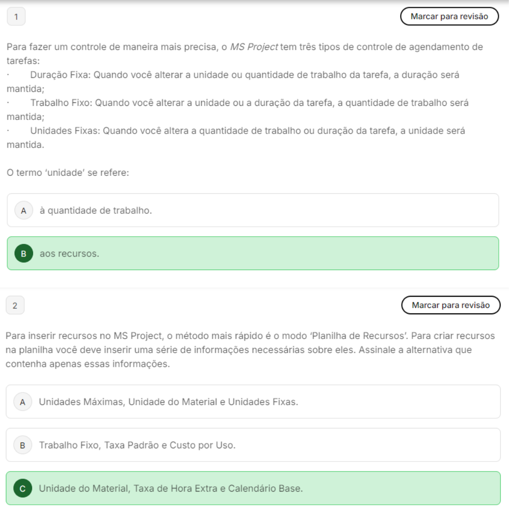 <p>1 Marcar para revisão Para fazer um controle de maneira mais precisa, MS Project tem três tipos de controle de agendamento de tarefas: Duração Fixa: Quando você alterar a unidade ou quantidade de trabalho da tarefa, a duração será mantida; Trabalho Fixo: Quando você alterar a unidade ou a duração da tarefa, a quantidade de trabalho será mantida; Unidades Fixas: Quando você altera a quantidade de trabalho ou duração da tarefa, a unidade será mantida. termo se refere: A à quantidade de trabalho. B aos recursos. 2 Marcar para revisão Para inserir recursos no MS Project, método mais rápido é modo de Para criar recursos na planilha você deve inserir uma série de informações necessárias sobre eles. Assinale a alternativa que contenha apenas essas informações. A Unidades Máximas, Unidade do Material e Unidades Fixas B Trabalho Fixo, Taxa Padrão e Custo por Uso. C Unidade do Material, Taxa de Hora Extra e Calendário Base.</p><p>3 Marcar para revisão sucesso na gestão de projetos é intrinsecamente ligado à compreensão das diferentes fases que compõem ciclo de vida de um projeto. Cada fase demanda a aplicação de processos de gerenciamento específicos para atingir os objetivos propostos. No ciclo da vida de um projeto, são aplicáveis todos os nove processos componentes da área de gerenciamento de projetos somente na fase de: A Iniciação. B Finalização. C Planejamento. 4 Marcar para revisão Uma das funcionalidades do MS Project é a identificação do caminho crítico do projeto. Para isso basta usuário registrar: A turno de trabalho e os feriados. B A disponibilidade de recursos e demandas. C Marcos do projeto e os recursos necessários. D Os custos dos recursos. E As tarefas e as suas dependências.</p><p>5 Marcar para revisão No MS PROJECT, fluxograma que exibe projeto com as tarefas em caixas ou nós, sendo que as linhas entre os nós simbolizam os elos entre tarefas sucessoras e predecessoras e cada nó exibe cinco campos de informação relativa a essa tarefa. Trata-se de: A Tabela de Manipulação de Arquivos. B Planilha de Recursos. C Planilha de Estruturação. D Gráfico de Recursos. E Gráfico de Diagrama de Rede. 6 Marcar para revisão É possível definir a disponibilidade de um projeto inteiro configurando a prioridade do projeto. Para essa redistribuição, podemos usar a ferramenta de restrição. Analise as afirmações abaixo sobre os tipos de restrições: I. mais tarde possível: a atividade deve se iniciar mais tarde possível. II. Deve iniciar em: a atividade deve se iniciar em uma data específica. III. Não iniciar depois de: a atividade tem um limite máximo de data para se iniciar. IV. Não terminar antes de: a atividade somente é concluída após uma determinada data. É correto o que se afirma em: A I, II, III e IV</p><p>7 Marcar para revisão A ferramenta informatizada MS-Project permite planejamento e acompanhamento de projetos de uma forma rápida e eficiente, sendo uma de suas características I. A limitação de uma única linha de base para todo projeto. II. A disponibilidade de dez tipos diferentes de recursos para sua classificação. III. A possibilidade de se adotar uma taxa de valor diferenciada para trabalhos realizados em hora extra. É correto que se afirma em: A Apenas e II. B Apenas e III. C Apenas III. 8 Marcar para revisão gerenciamento de projetos desempenha um papel crucial na execução eficaz de iniciativas temporárias. Para garantir sucesso de um projeto, é fundamental compreender os conceitos e processos envolvidos nessa disciplina. Nesse contexto, as seguintes afirmações são apresentadas para avaliar conhecimento sobre tópicos relacionados ao gerenciamento de projetos. I. Um projeto é um esforço temporário empreendido para criar algo único e exclusivo. II. A declaração do escopo e a documentação dos requisitos são entradas do processo de criação da estrutura analítica do projeto, que inclui a subdivisão de entregas do projeto em componentes menores. III. processo de desenvolvimento do plano de gerenciamento de um projeto compreende a coleta de requisitos, a elaboração do termo de abertura do projeto, registro das partes interessadas, além do fornecimento da declaração do escopo do projeto. É correto que se afirma em: A Apenas I e II.</p><p>9 Marcar para revisão atributo "Tipo de Tarefa" define tipo de duração das tarefas no MS Project. Assinale a alternativa abaixo que contém apenas tipos de tarefas. A Custo Fixo, Duração Fixa e Trabalho Fixo. B Custo Fixo, Trabalho Fixo e Unidades Fixas. C Custo Fixo, Duração Fixa e Unidades Fixas. D Duração Fixa, Trabalho Fixo e Unidades Fixas. 10 Marcar para revisão Em um ambiente de gerenciamento de projetos, conflitos relacionados à indisponibilidade de recursos são comuns. Diversas estratégias podem ser empregadas para resolver esses conflitos, e uma delas é a utilização de horas extras. Sobre esse tema, analisaremos as seguintes afirmativas: I. A hora extra é todo trabalho que é realizado fora das horas de trabalho normais disponíveis. II. Consideramos a hora extra apenas para recursos de trabalho, afim de diminuir tempo que este recurso leva para concluir uma determinada tarefa. III. Muitas vezes estão sujeitas a sobretaxa. IV. Quando se insere trabalho de horas extras, a duração da tarefa é reduzida. V. A hora extra é uma estratégia exclusiva para recursos não humanos. É correto que se afirma apenas em: A III e V. B I, III e IV. C I, e IV.</p>