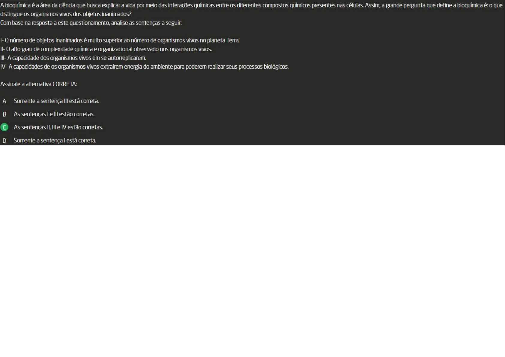 <p>A bioquímica é a área da ciência que busca explicar a vida por meio das interações químicas entre os diferentes compostos químicos presentes nas células. Assim, a grande pergunta que define a bioquímica é: que distingue os organismos vivos dos objetos inanimados? Com base na resposta a este questionamento, analise as sentenças a seguir: I- número de objetos inanimados é muito superior ao número de organismos vivos no planeta Terra. II- 0 alto grau de complexidade química e organizacional observado nos organismos vivos. III- A capacidade dos organismos vivos em se autorreplicarem. IV- A capacidades de os organismos vivos extraírem energia do ambiente para poderem realizar seus processos biológicos. Assinale a alternativa CORRETA: A Somente a sentença III está correta. B As sentenças le III estão corretas. As sentenças II, III e IV estão corretas. D Somente a sentença I está correta.</p>