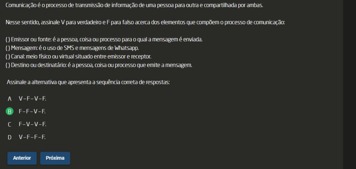 <p>Comunicação é processo de transmissão de informação de uma pessoa para outra e compartilhada por ambas. Nesse sentido, assinale V para verdadeiro e F para falso acerca dos elementos que compõem processo de () Emissor ou fonte: é a pessoa, coisa ou processo para qual a mensagem é enviada. () Mensagem: é uso de SMS e mensagens de Whatsapp. () Canal: meio físico ou virtual situado entre emissor e receptor. () Destino ou destinatário: é a pessoa, coisa ou processo que emite a mensagem. Assinale a alternativa que apresenta a correta de respostas: A B D V-F-F-F Anterior Próxima</p>