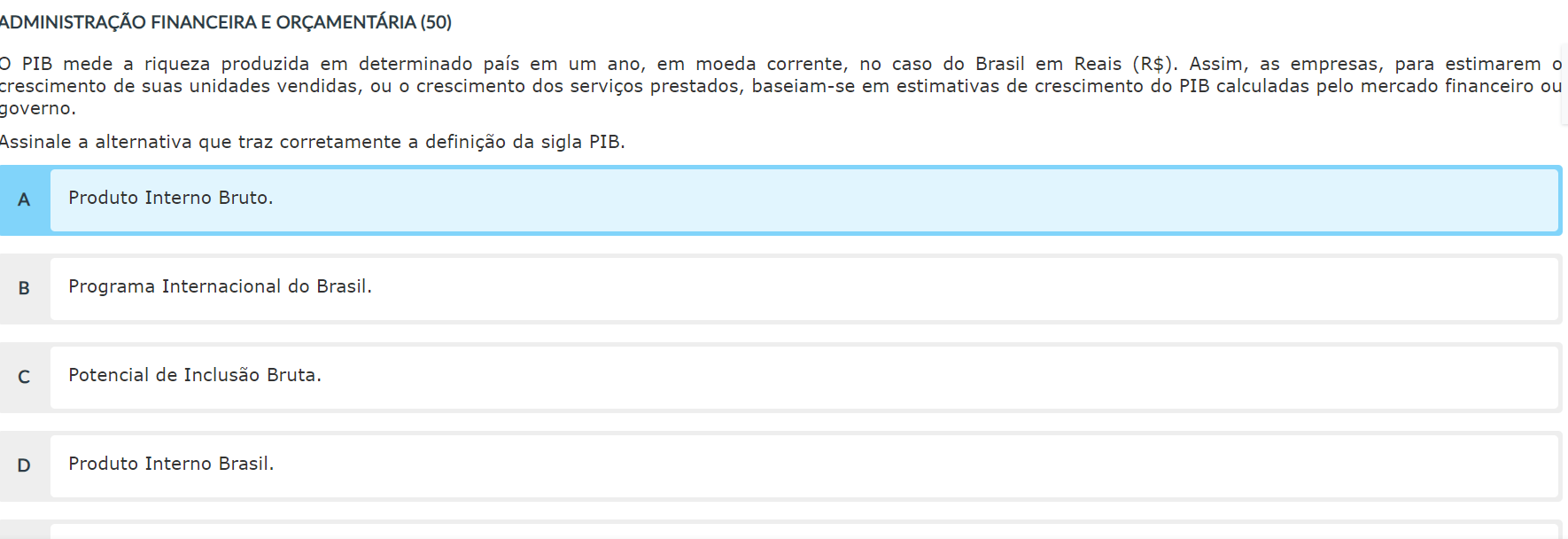 <p>ADMINISTRAÇÃO FINANCEIRA E ORÇAMENTÁRIA (50) PIB mede a riqueza produzida em determinado país em um ano, em moeda corrente, no caso do Brasil em Reais (R$). Assim, as empresas, para estimarem o crescimento de suas unidades vendidas, ou crescimento dos serviços prestados, basejam-se em estimativas de crescimento do PIB calculadas pelo mercado financeiro ou governo. Assinale a alternativa que traz corretamente a definição da sigla PIB. A Produto Interno Bruto. B Programa Internacional do Brasil. C Potencial de Inclusão Bruta. D Produto Interno Brasil.</p>